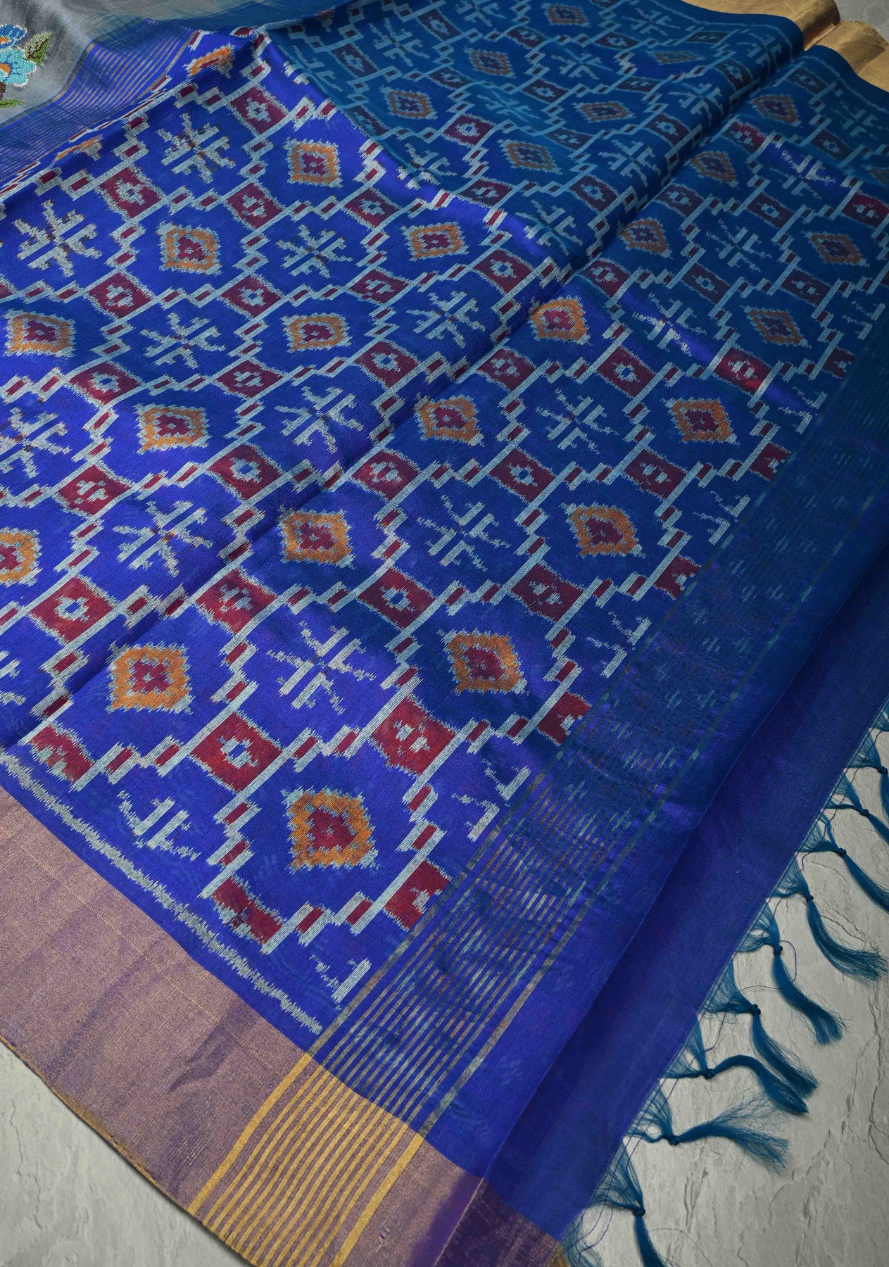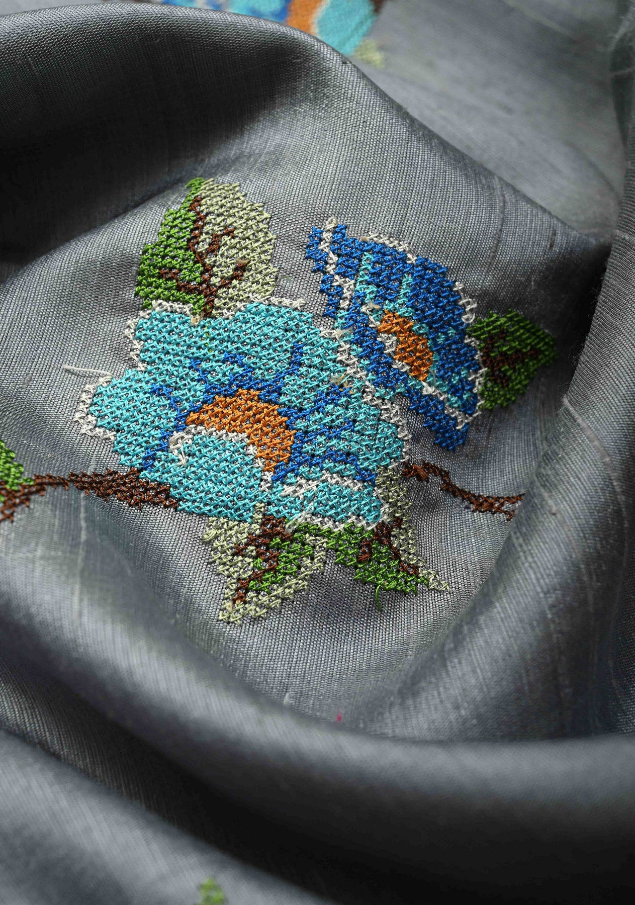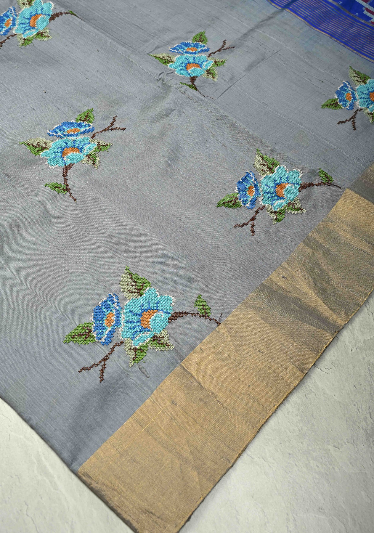 This Gray Pure Raw Silk Saree is a sophisticated blend of subtle elegance and artisanal craftsmanship. The gray hue provides a refined and versatile base, while the cross-stitch floral embroidery adds delicate texture and intricate detailing to the fabric. The Ikkat-patterned pallu introduces a striking contrast with bold geometric designs, beautifully complementing the understated body of the saree. Woven from pure raw silk, the saree boasts a rich texture and graceful drape, making it an ideal choice for weddings, festive celebrations, or formal gatherings. Its combination of traditional embroidery and contemporary styling ensures a timeless appeal.