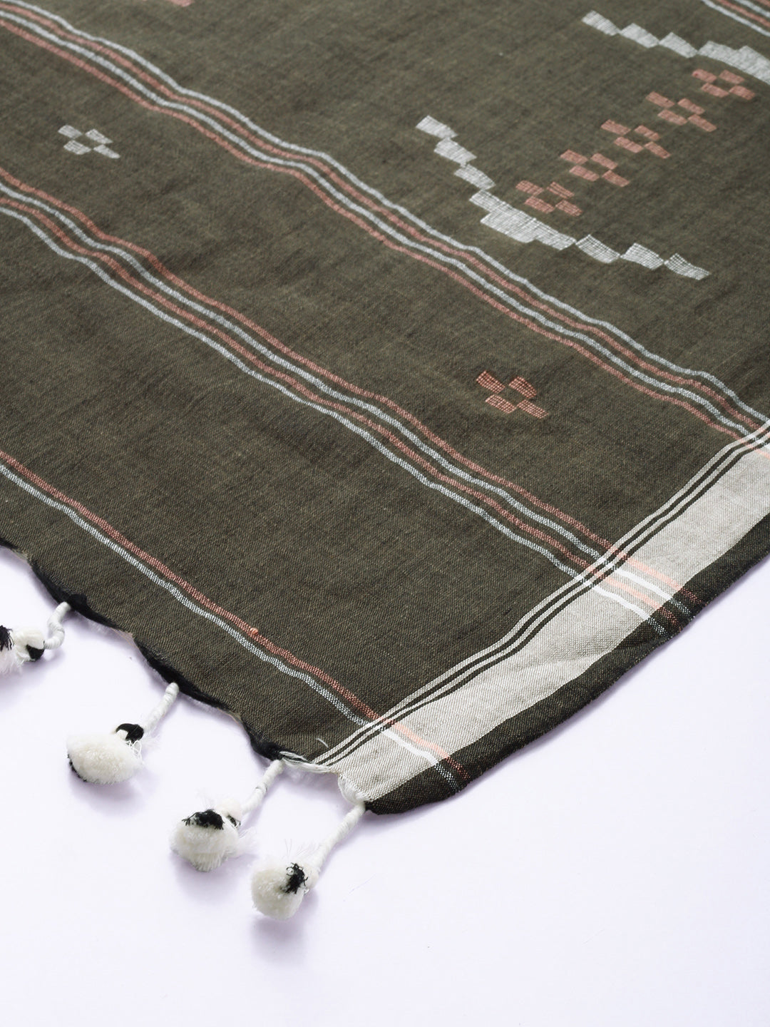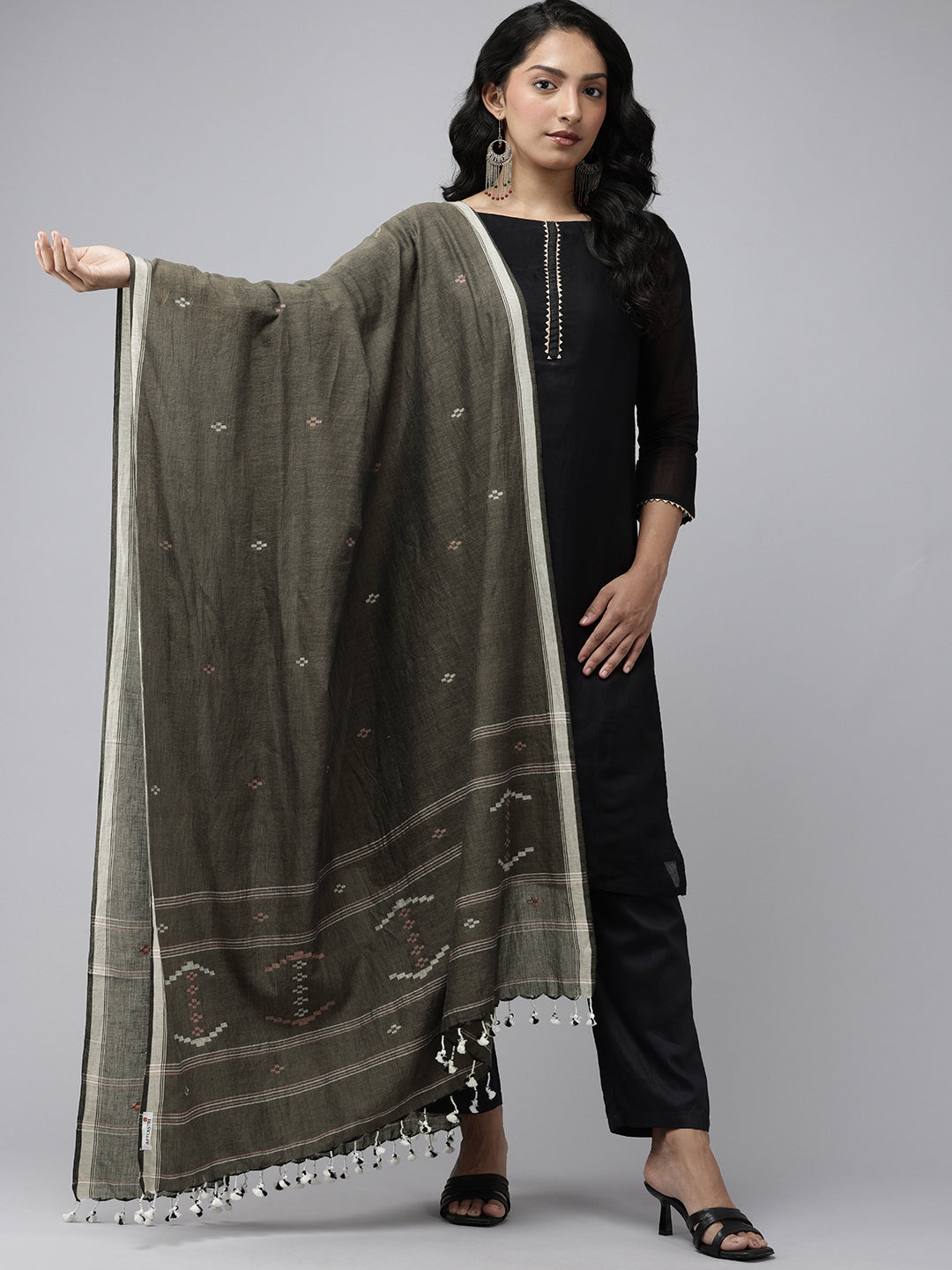 The sophisticated grey base is enhanced with playful pompom tassels along the edges, offering a contemporary twist to a timeless handloom piece. Lightweight and versatile, this dupatta drapes effortlessly over kurtas, sarees, or fusion ensembles, making it perfect for casual outings, festive occasions, or refined everyday styling.