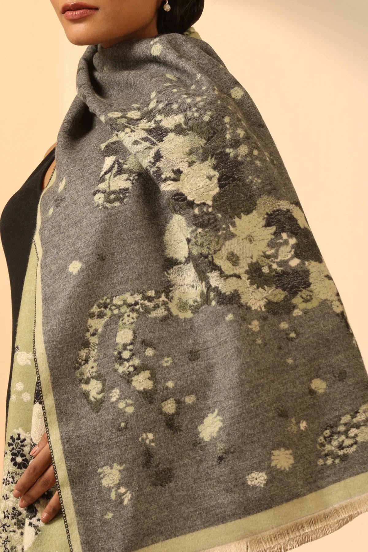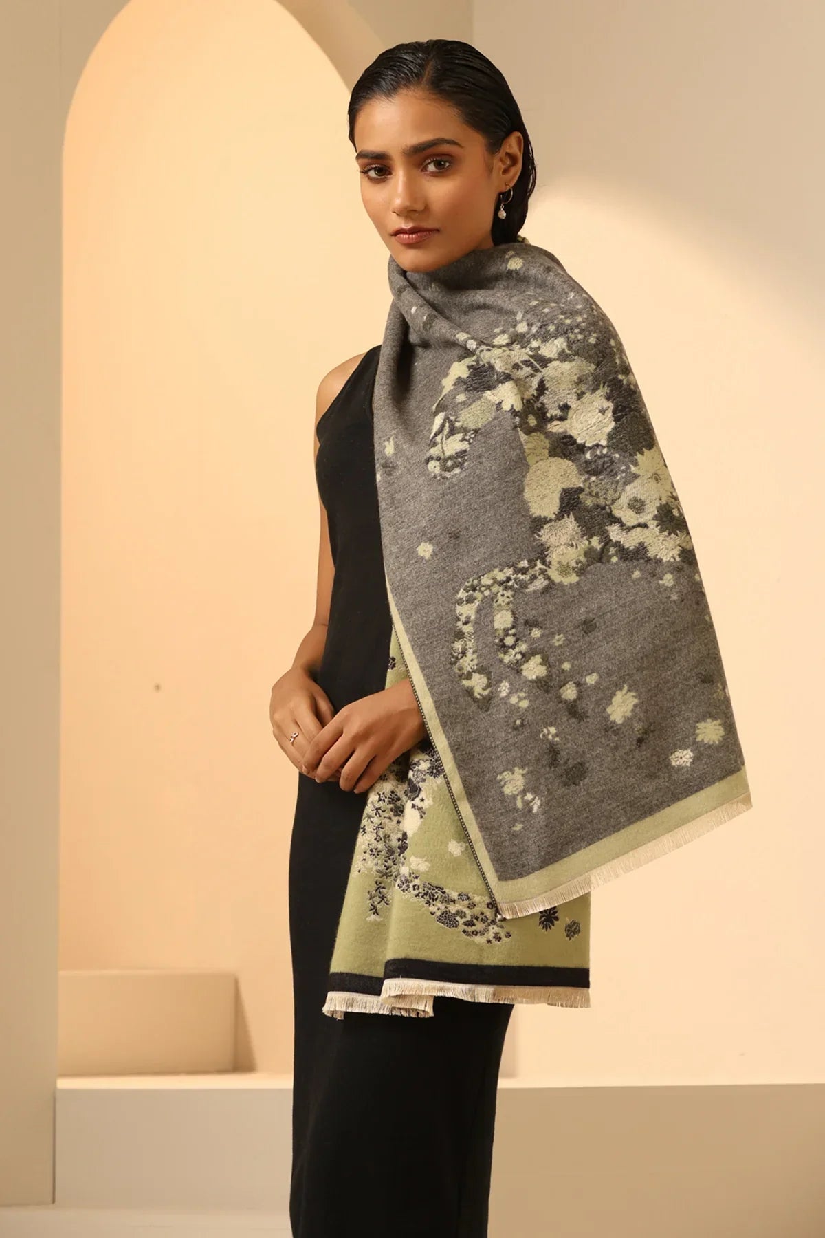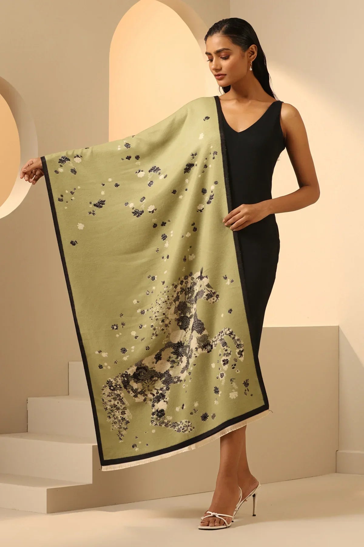 Upgrade your winter look with Hope: A pista green vegan cashmere reversible stole featuring a unique horse floral wrap woven jacquard design. Stay stylish and cozy!