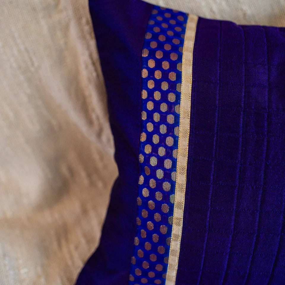 The striking design showcases a luxurious interplay of textures and colours. The purple base, reminiscent of imperial robes, provides a lavish backdrop for the ornate centrepiece. A vibrant blue and gold brocade strip adorned with intricate circular patterns runs vertically down the cushion's face, flanked by a shimmering gold border. This opulent combination evokes the grandeur of royal palaces and the timeless beauty of traditional textiles.