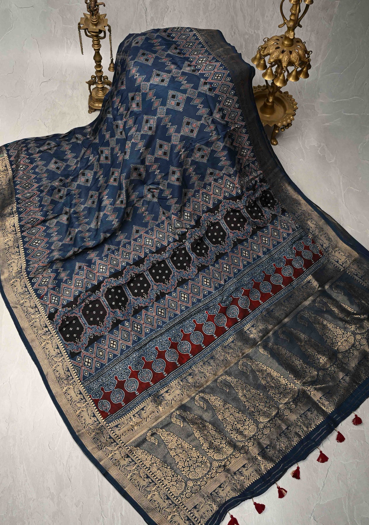 This exquisite Indigo Ajrakh Hand Block Print saree is crafted on luxurious Dola silk, known for its soft texture and elegant drape. Featuring intricate Ajrakh patterns in indigo tones, the saree showcases the heritage of traditional hand block printing, a meticulous art form passed down through generations. The natural hues are achieved using organic dyes, reflecting timeless beauty and sustainable craftsmanship. Enhancing its appeal is a fancy zari border that adds a touch of shimmer and sophistication, making it a perfect blend of tradition and modern grace. Ideal for festive occasions or cultural celebrations, this saree is a true testament to artisanal excellence
