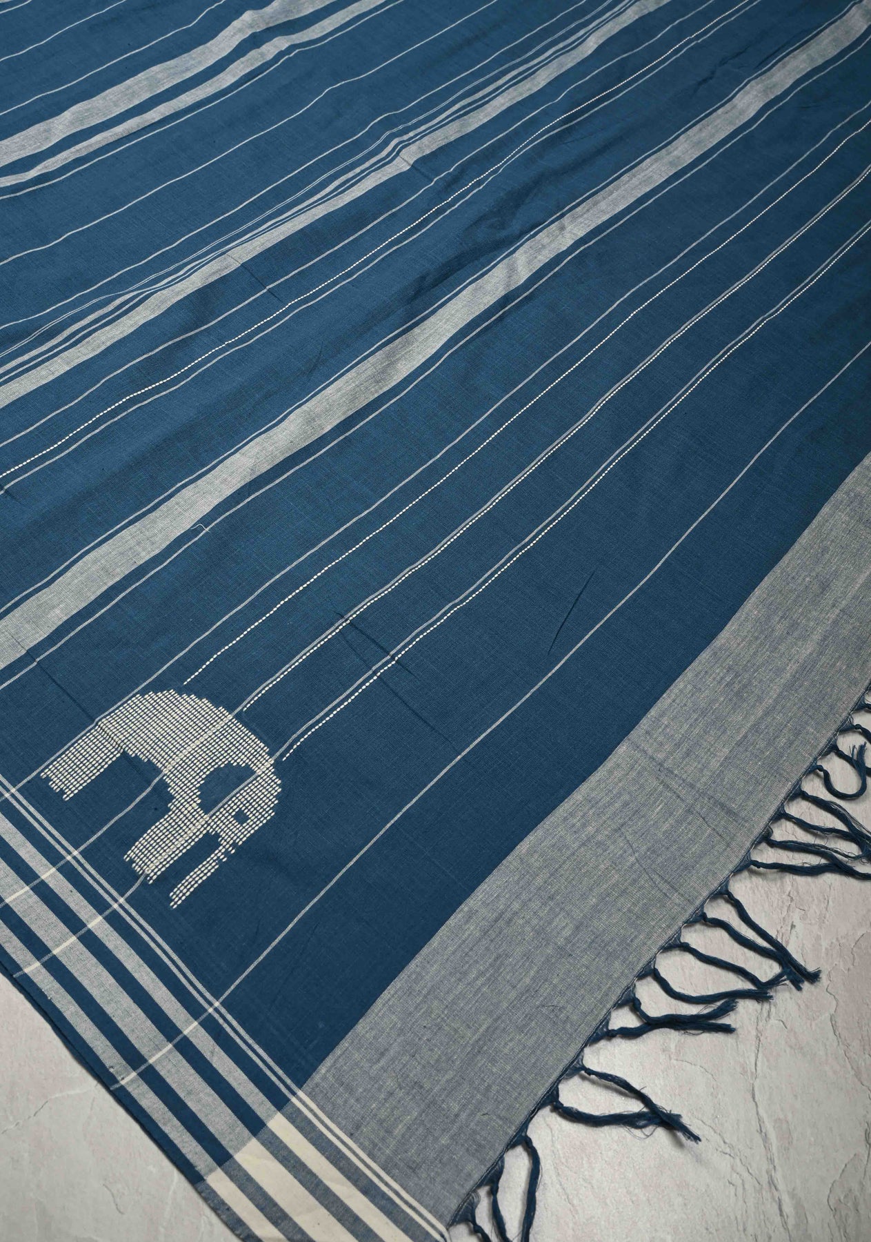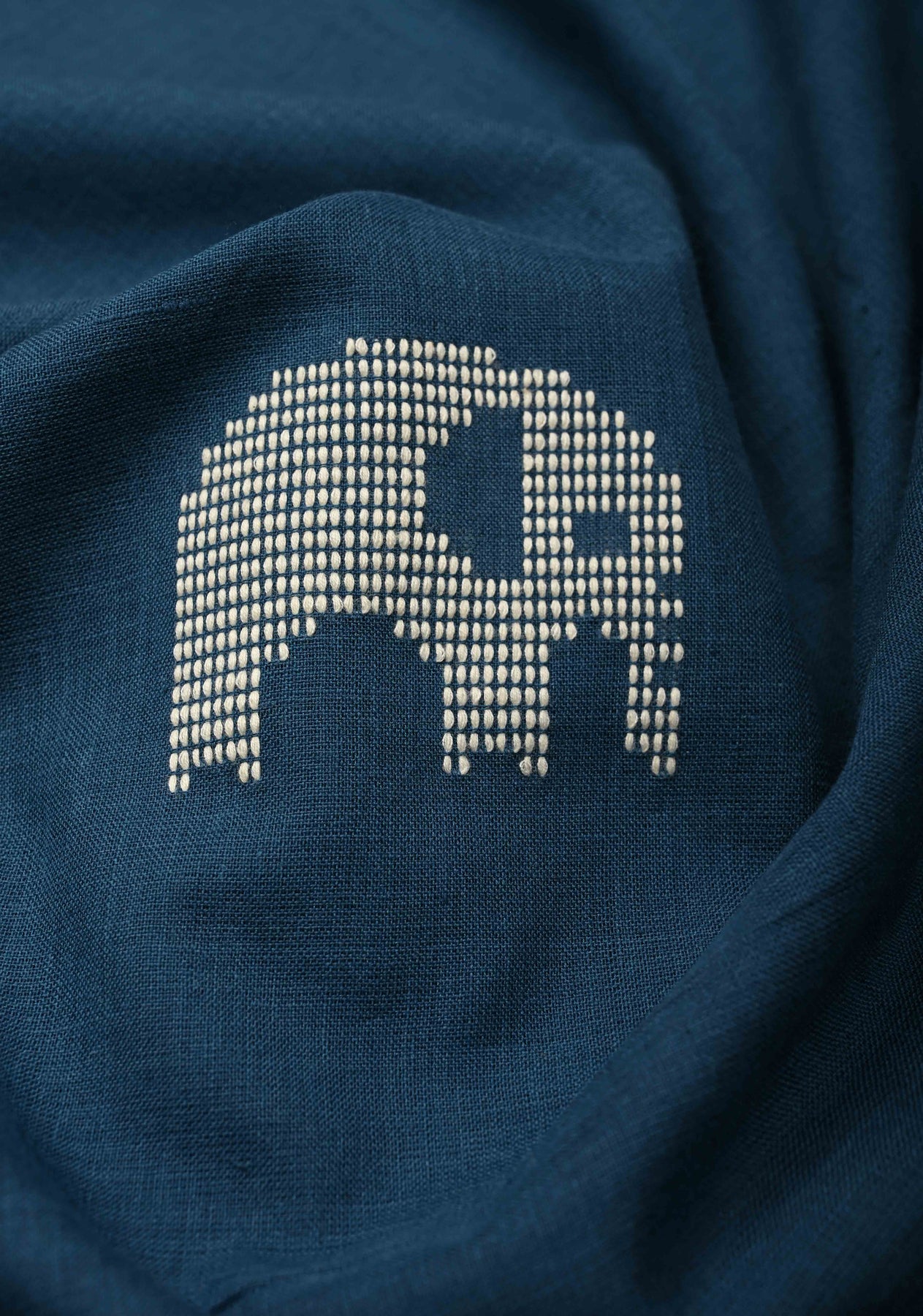 Celebrate heritage craftsmanship with this Indigo Bhujodi Kala Cotton Saree, handwoven with care using sustainably sourced kala cotton. The saree features delicate thread elephant motifs — symbolic and artful — that add a touch of storytelling to its design. A traditionally woven border frames the piece, enhancing its rustic charm and timeless appeal. Breathable, lightweight, and rooted in artisanal tradition, this saree is perfect for cultural gatherings, casual elegance, or conscious fashion choices.