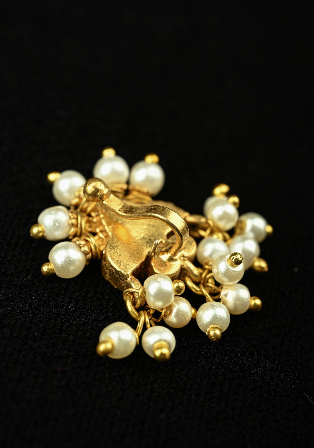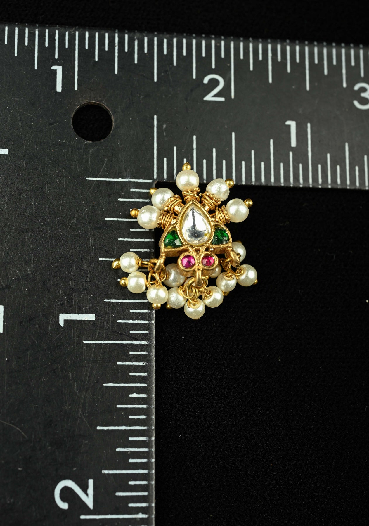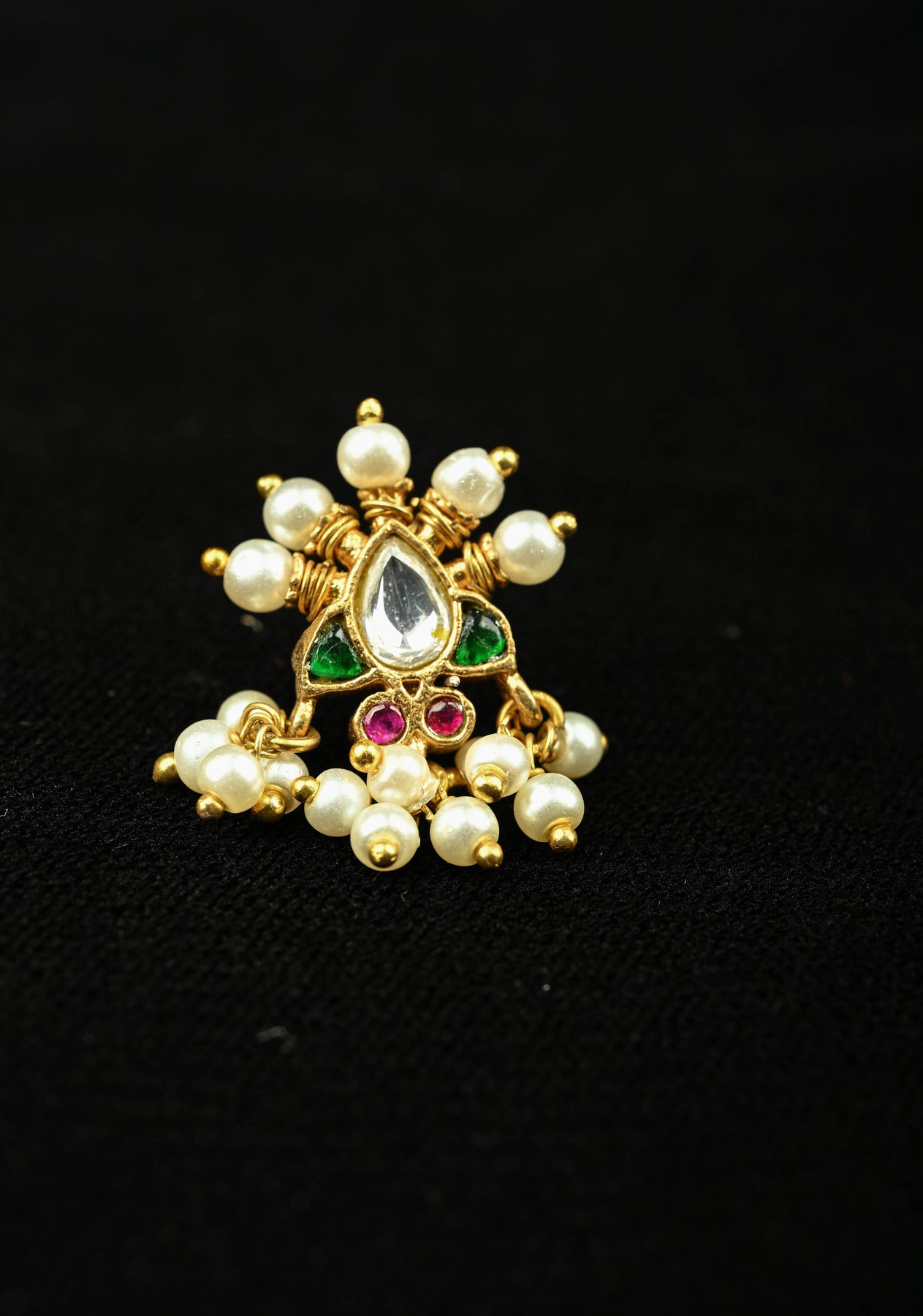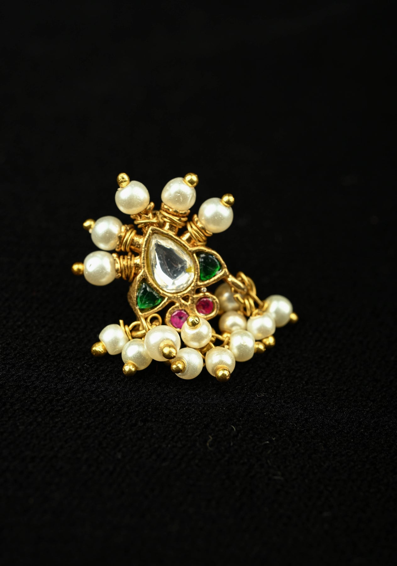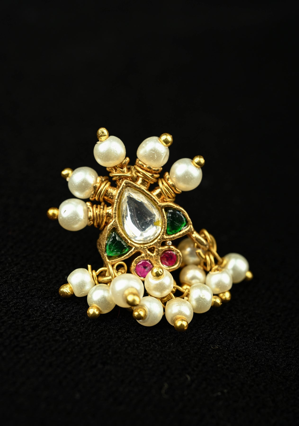 Add a touch of royal elegance to your look with this Jadau Kundan Clip/Nose Pin, beautifully embellished with traditional Kundan stones and delicate white dangling beads. Designed as a clip-on, it can be worn comfortably without a piercing—perfect for brides, bridesmaids, and anyone looking to elevate their ethnic ensemble with ease.