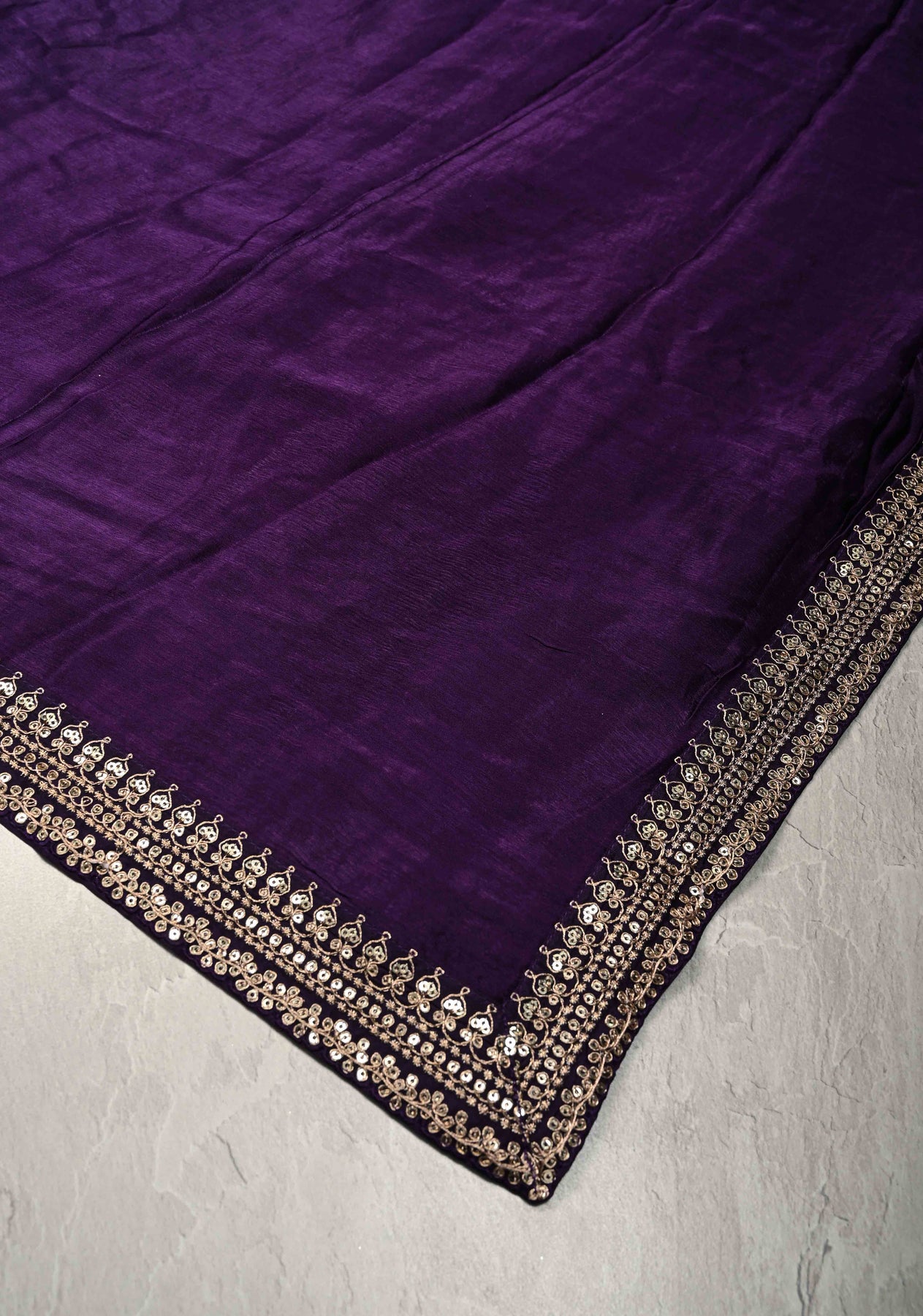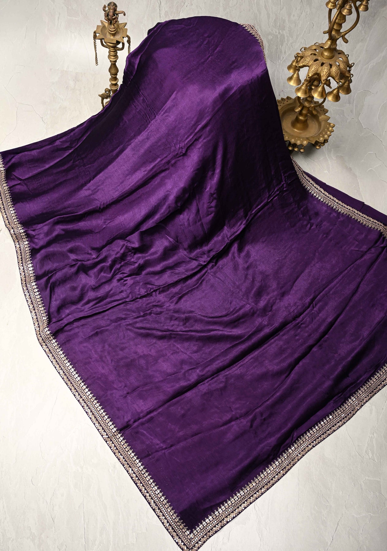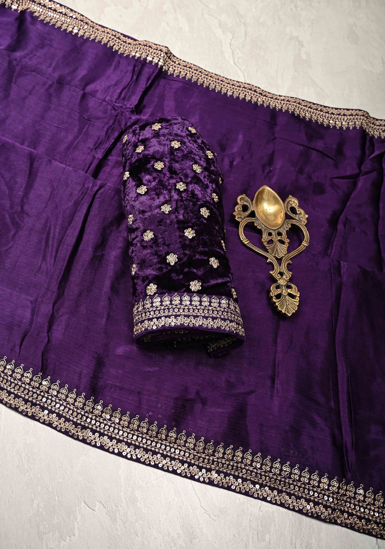 Jamuni Purple Satin Georgette Saree with Fancy Lace Border and Velvet Butta Blouse Piece
