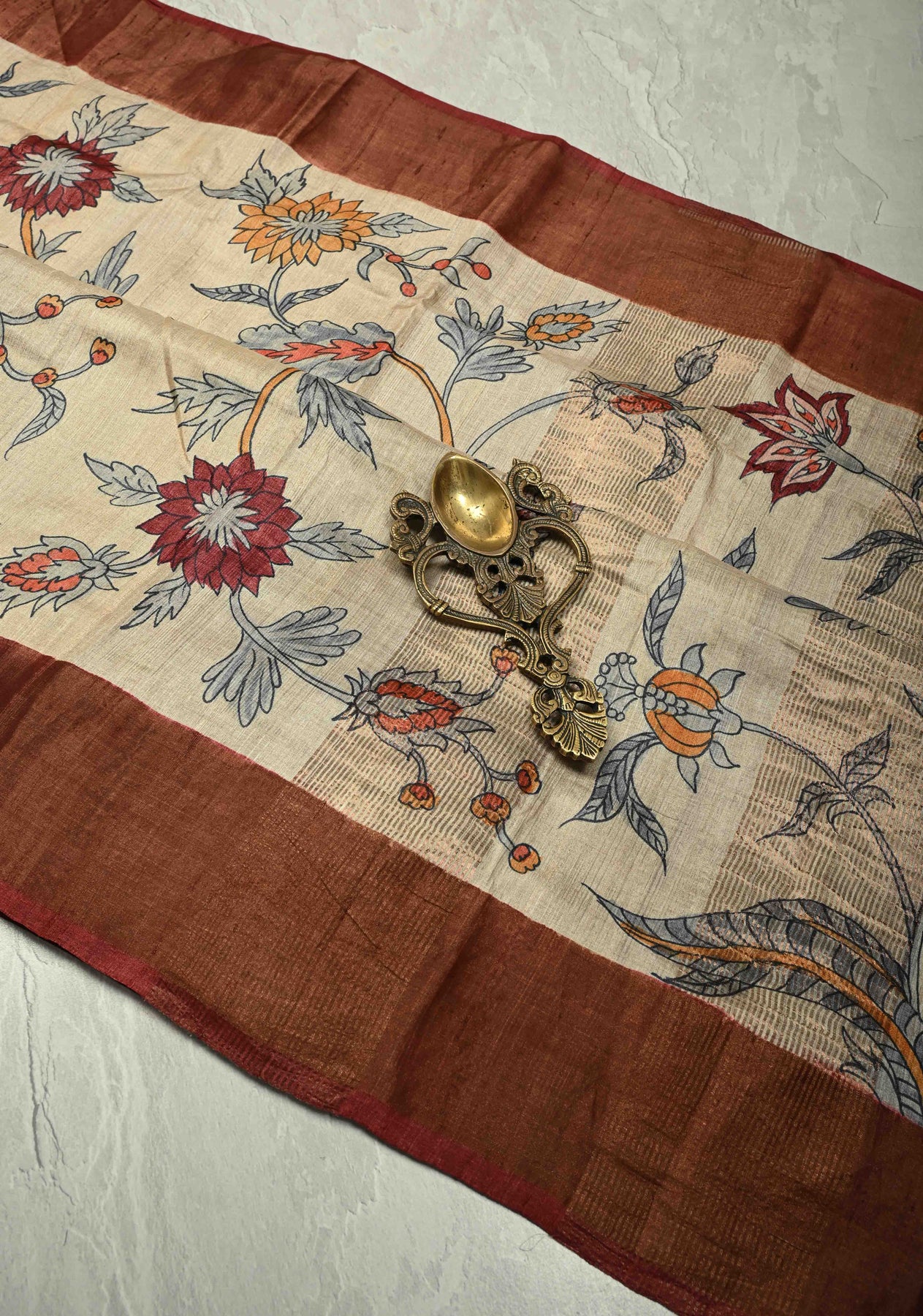 Kora Color Pure Handloom Jari Tussar Silk saree with Floral Hand painted and Contrast Zari Border | SILK MARK CERTIFIED