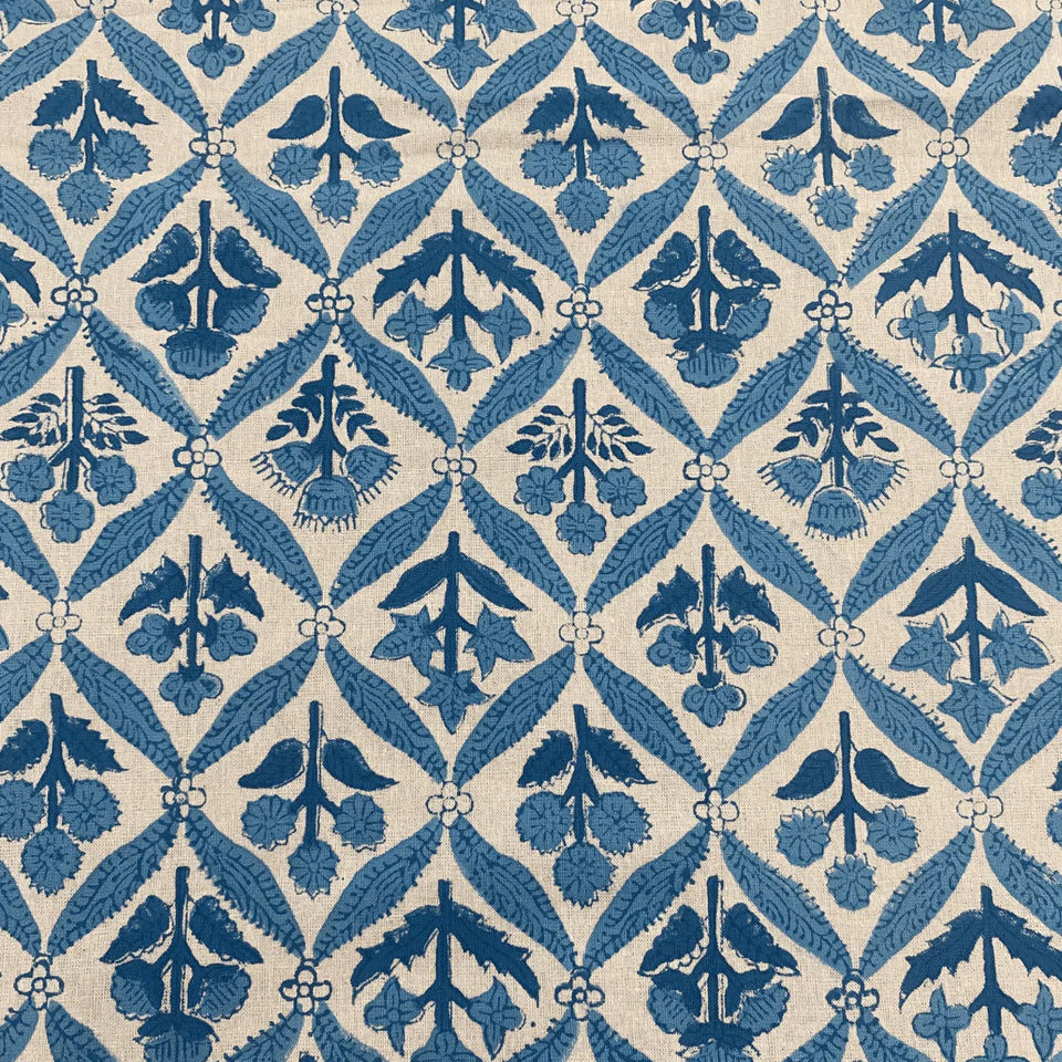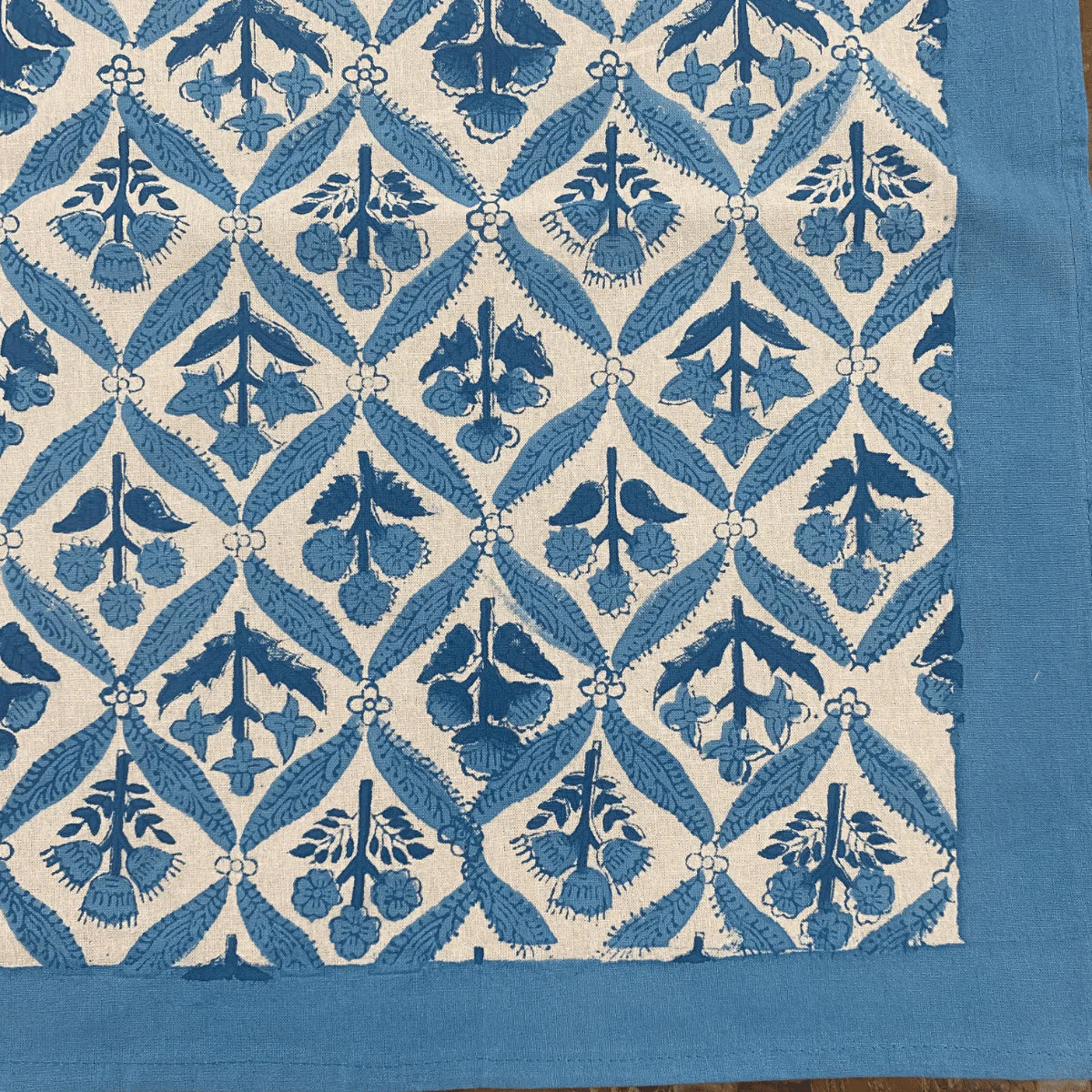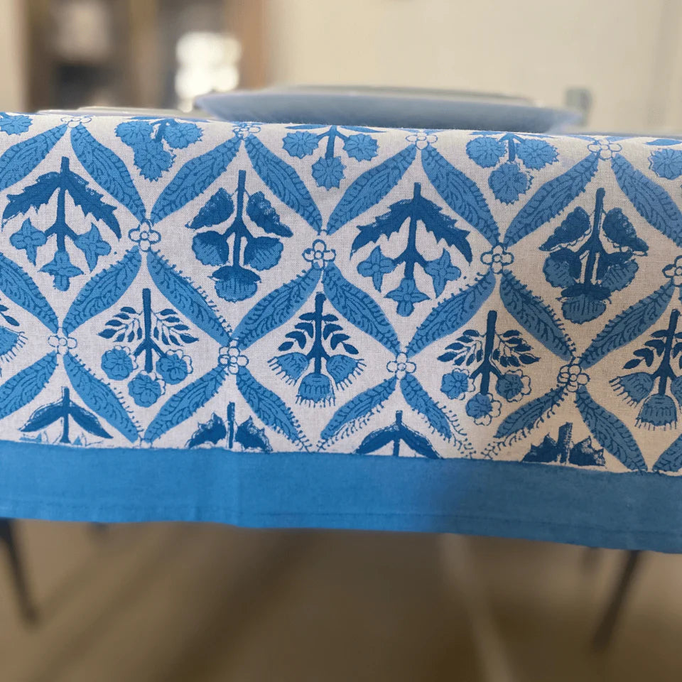 Introducing the "Lagoon" tablecover, a serene and beautifully crafted addition to your dining decor. Measuring 60 inches by 90 inches, this tablecover is adorned with an original hand block print that evokes the tranquil depths of a lagoon with its vibrant shades of blue set against a crisp white background. The design features a complex array of geometric and botanical motifs, creating a refreshing and calming atmosphere for any dining occasion.