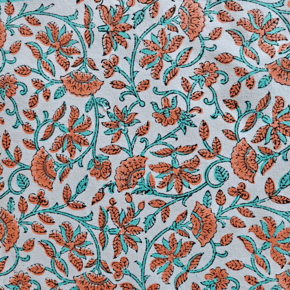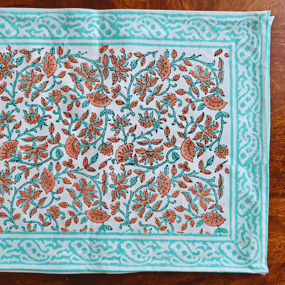 The Leaflet table runner brings a gentle botanical charm to your space. Featuring hand block printed vines and blooming floral sprays in coral and teal, framed by a soft aqua border, it evokes a sense of calm sophistication. Sized perfectly at 13" x 72", it fits 4–6 seater tables with ease.