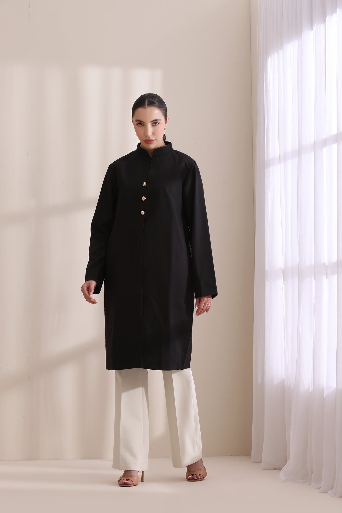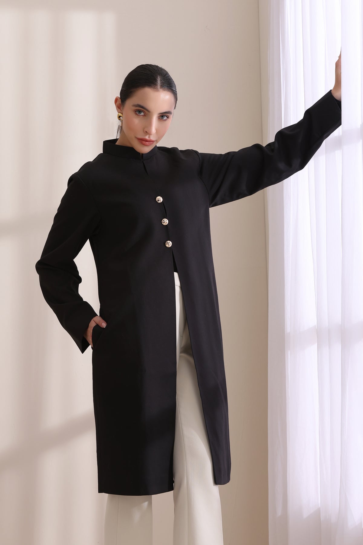 This elegant black long jacket features a modern, structured silhouette with a mandarin collar and statement metallic buttons. Designed with subtle side pockets, it blends traditional tailoring with contemporary chic. Perfect for versatile styling, this timeless piece effortlessly elevates both formal and casual looks with a touch of understated luxury.