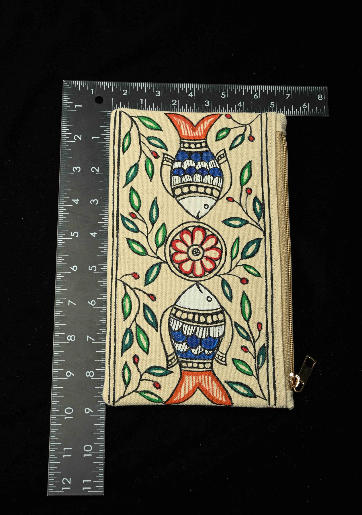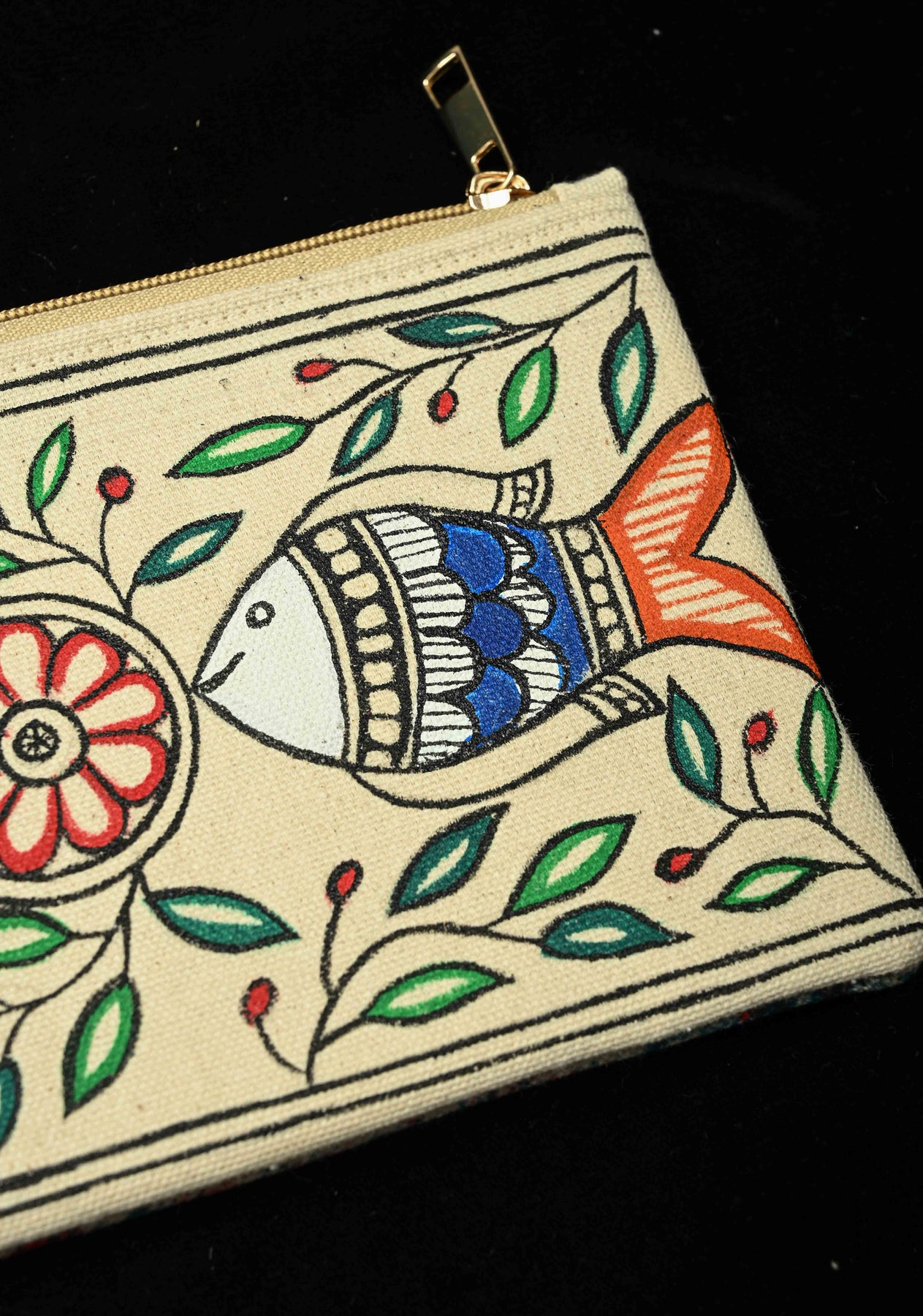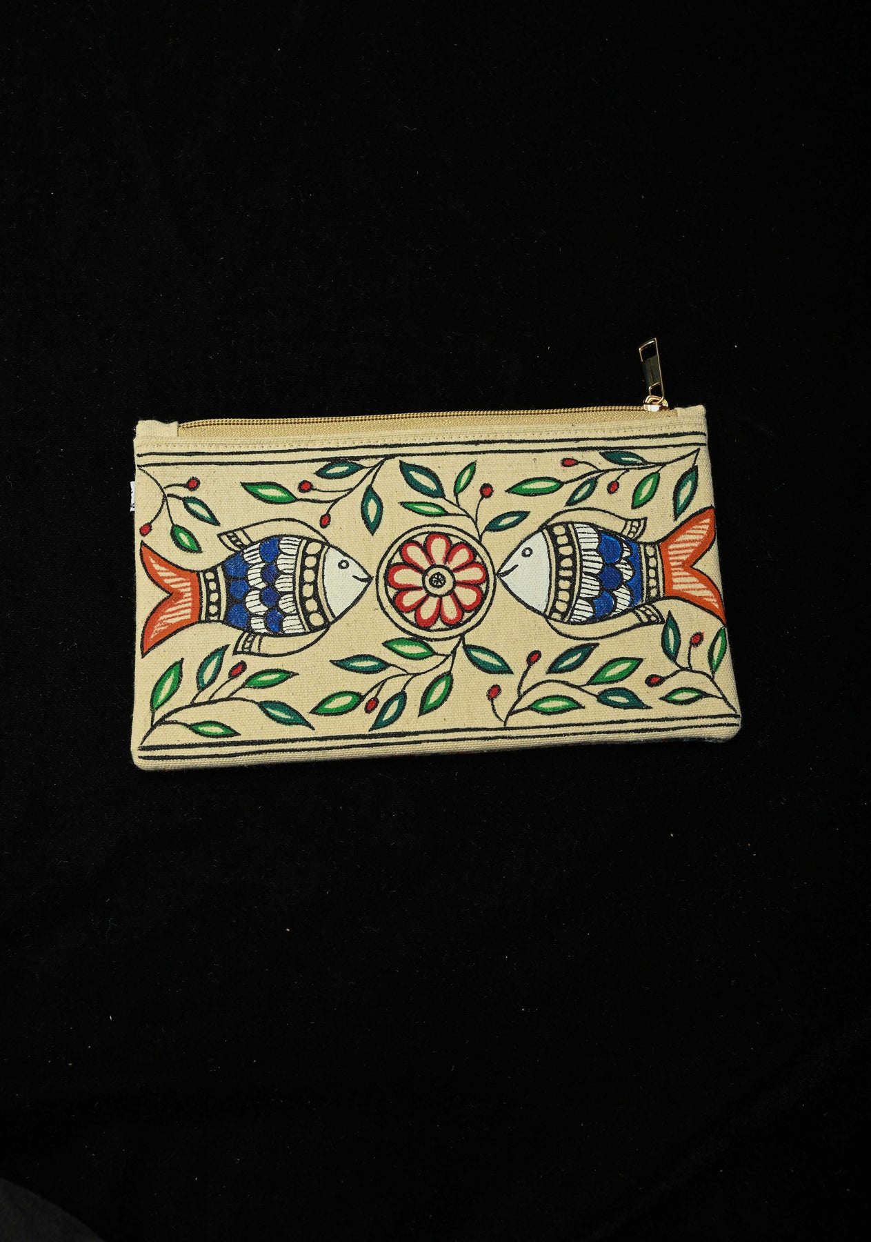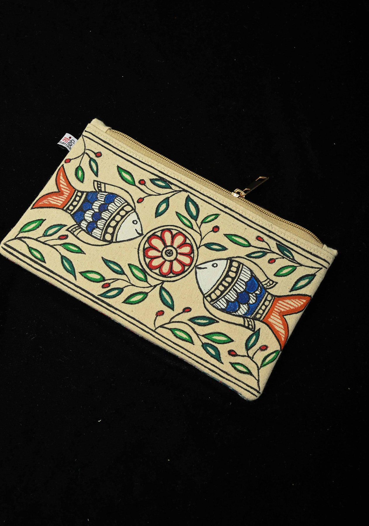 Pouch : Madhubani Hand Painted Twin Fish Hand-Painted Art Canvas Utility Pouch