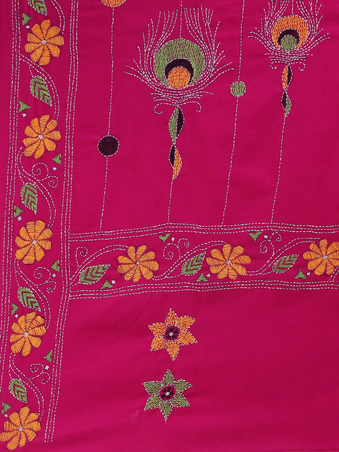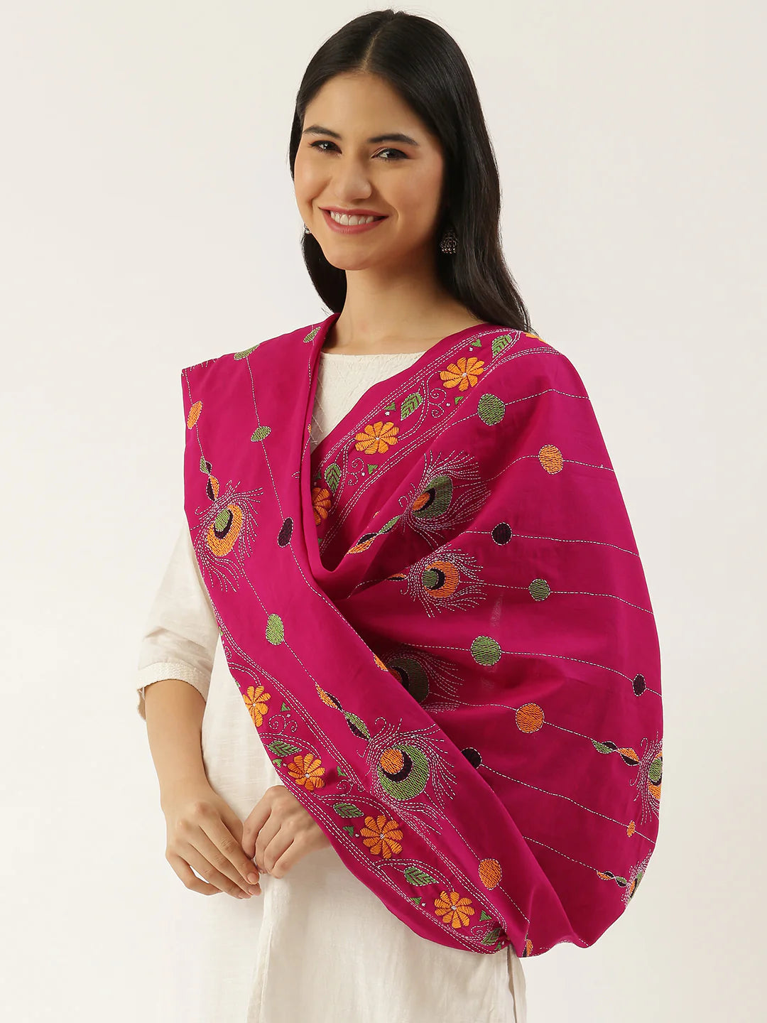 This Beautiful Hand-Embroidered Magenta Yellow Cotton Kantha Work Dupatta is a vibrant and eye-catching piece that adds a burst of color and artistry to any outfit. The magenta and yellow hues are complemented by intricate Kantha embroidery, a traditional craft known for its delicate and detailed stitching. Crafted from soft, breathable cotton, this dupatta is perfect for the summer season, offering both style and comfort. Whether draped over a simple kurti or paired with a festive outfit, it effortlessly enhances your look with its stunning craftsmanship and bold colors.