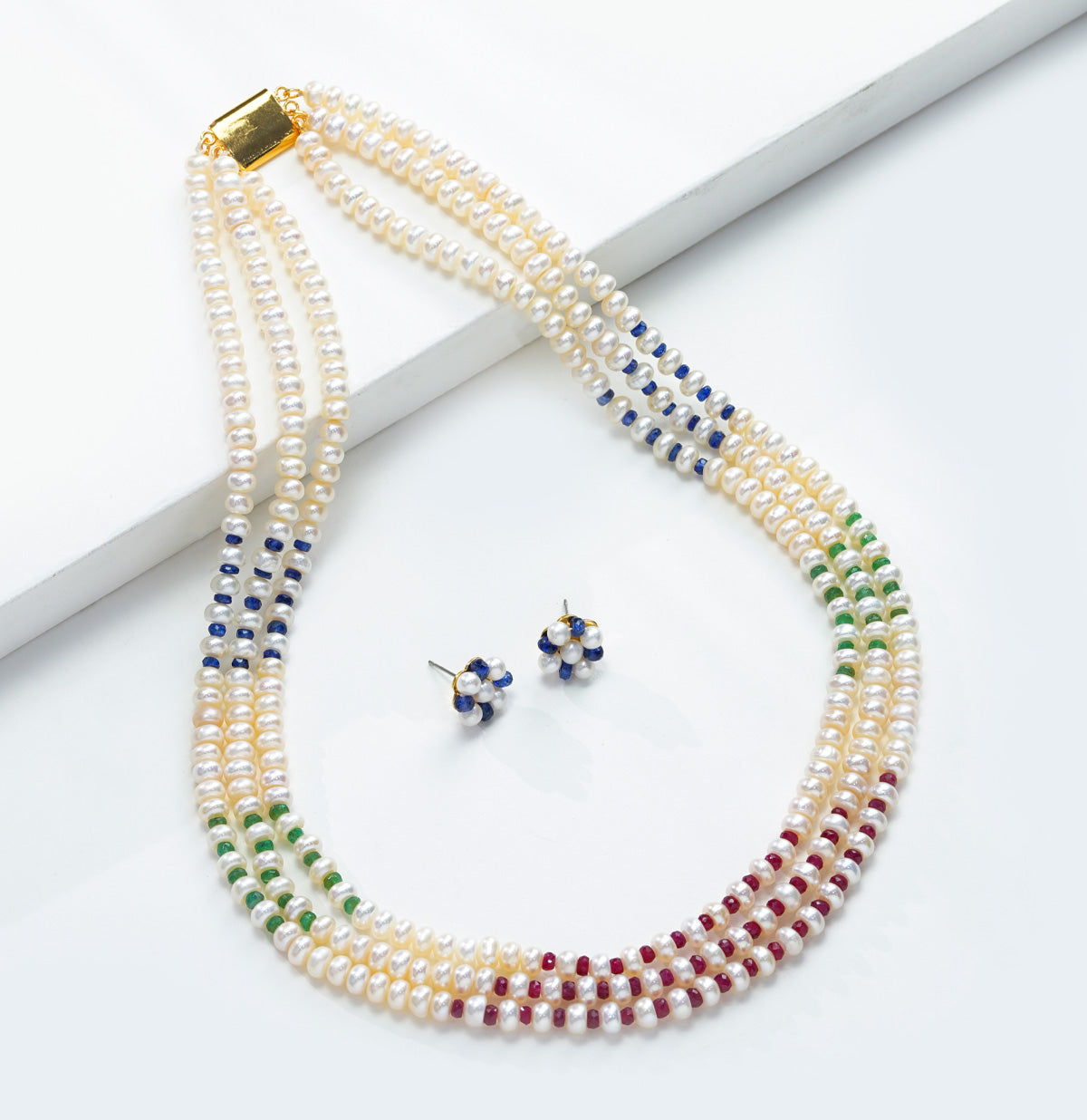 The Majestic Sapphire Mix 3-Strand Pure Pearl Necklace Set combines the elegance of pristine pearls with the rich allure of sapphire accents. This luxurious design features three strands of pearls, beautifully complemented by vibrant sapphire gemstones, creating a timeless and sophisticated look.