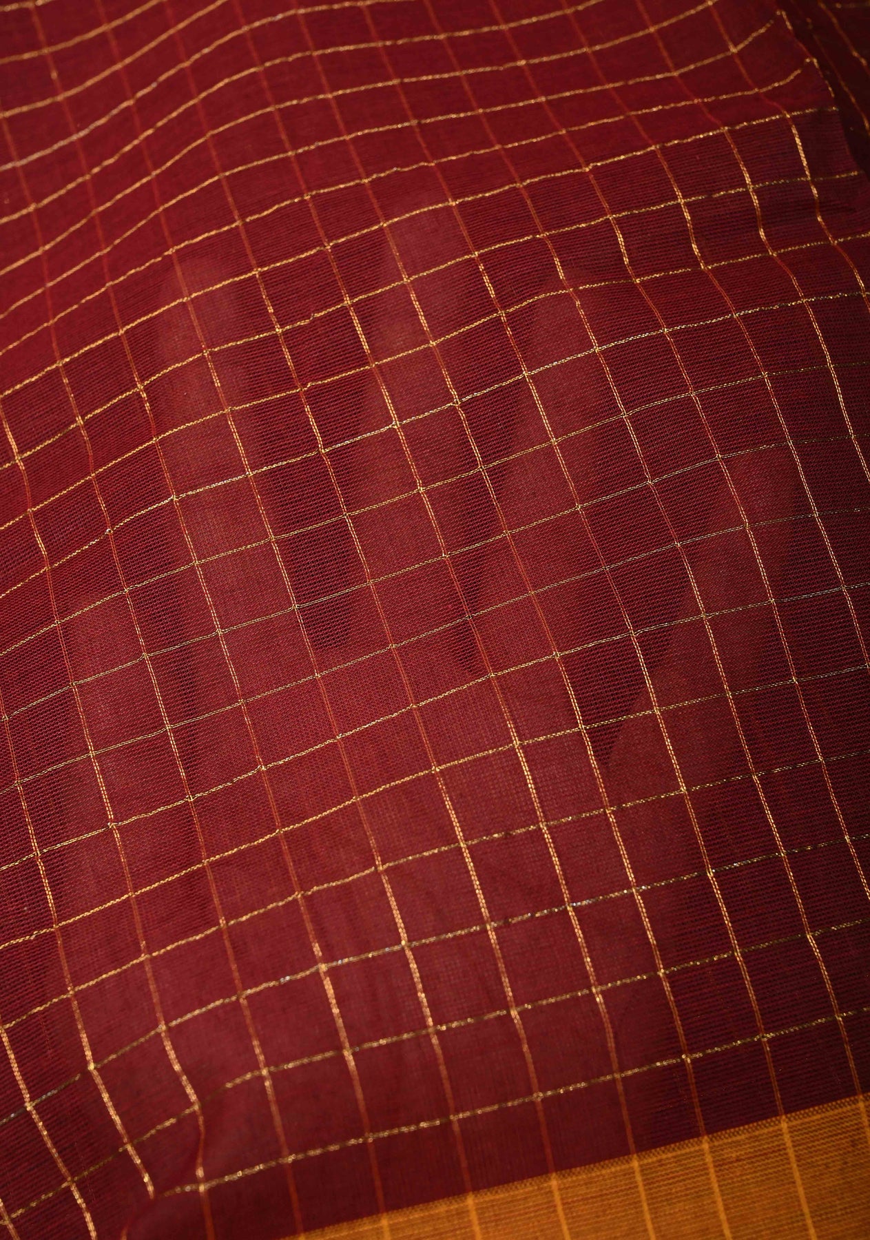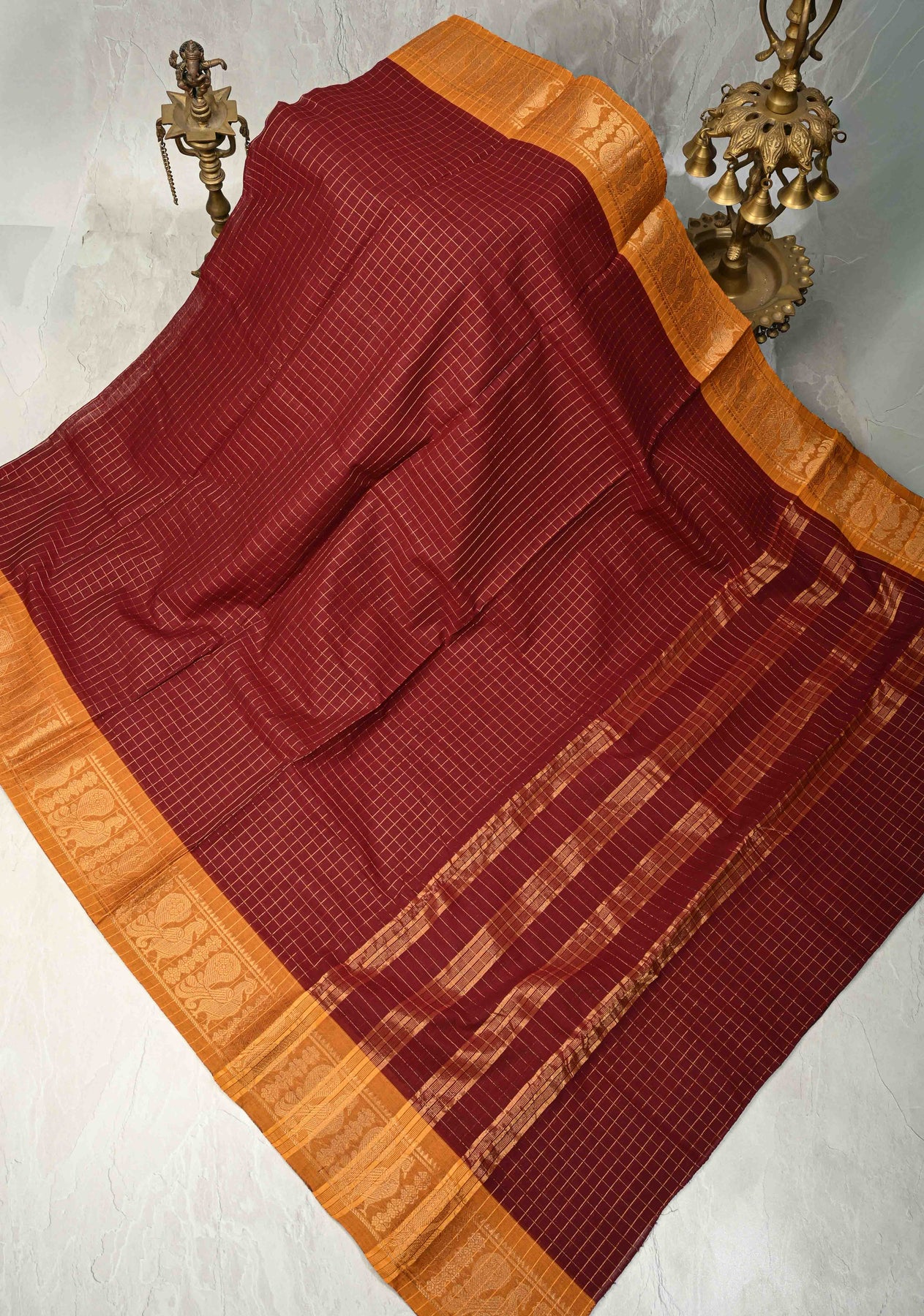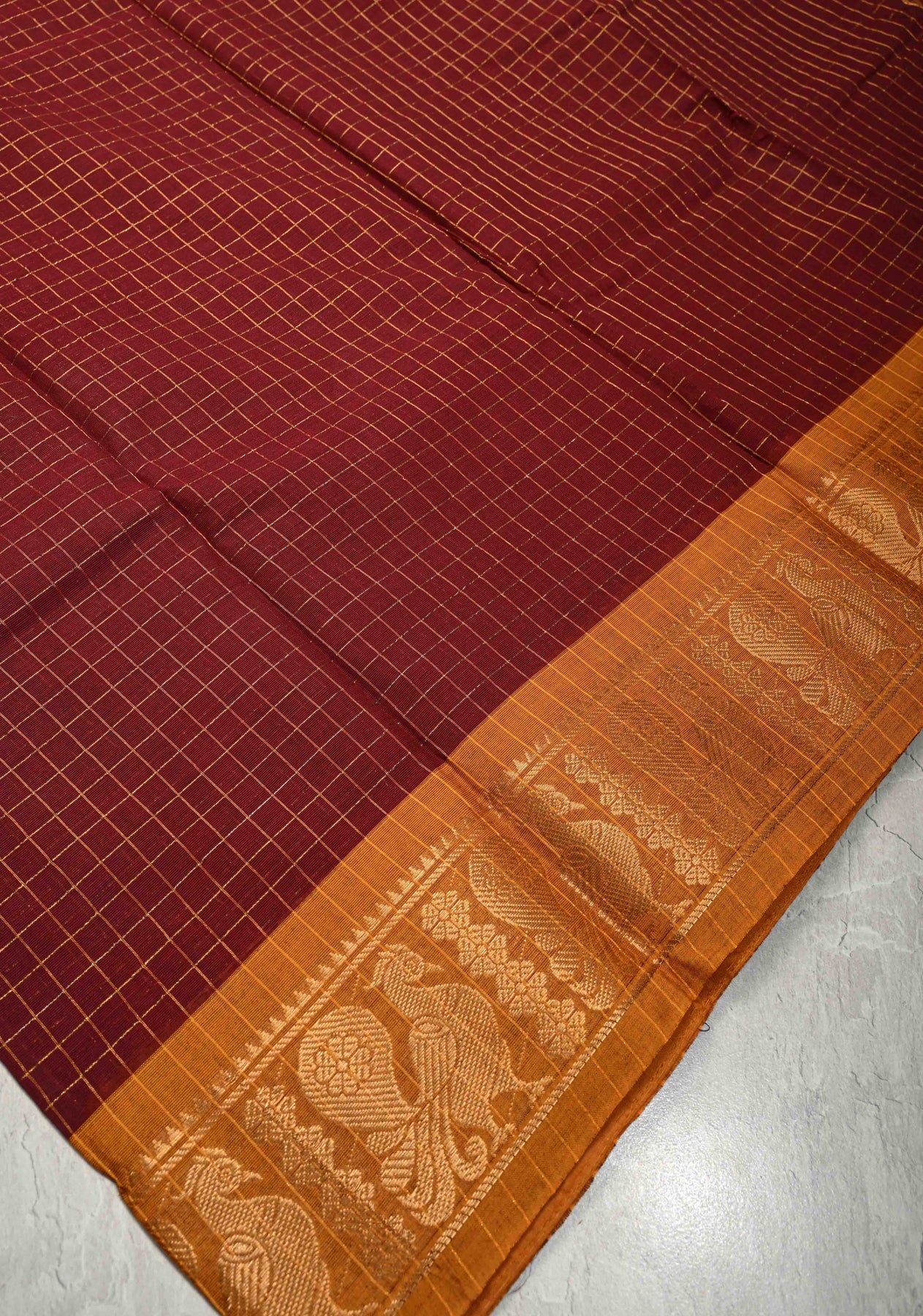 Embrace classic elegance with this Maroon Silk Cotton Handloom Saree featuring Zari Checks and a Contrast Zari Border. Woven on traditional handlooms, this saree combines the rich sheen of silk with the comfort of cotton, offering a graceful drape and breathable wear. The deep maroon hue exudes timeless sophistication, beautifully complemented by traditional zari checks across the body. Finished with a striking contrast zari border, this saree is perfect for festive occasions, cultural gatherings, office wear, and special celebrations. A true reflection of heritage craftsmanship and refined style.