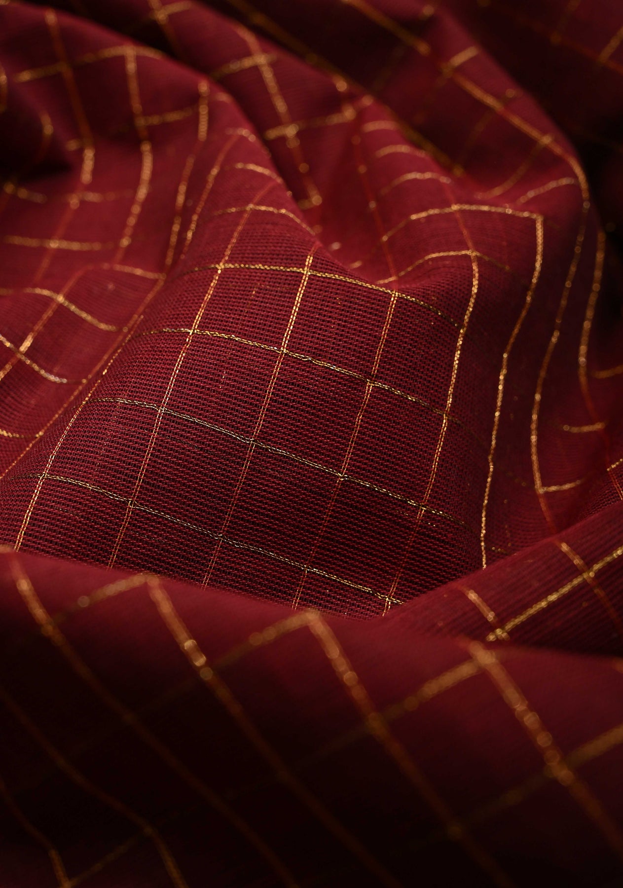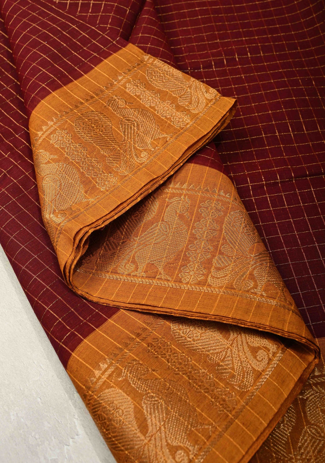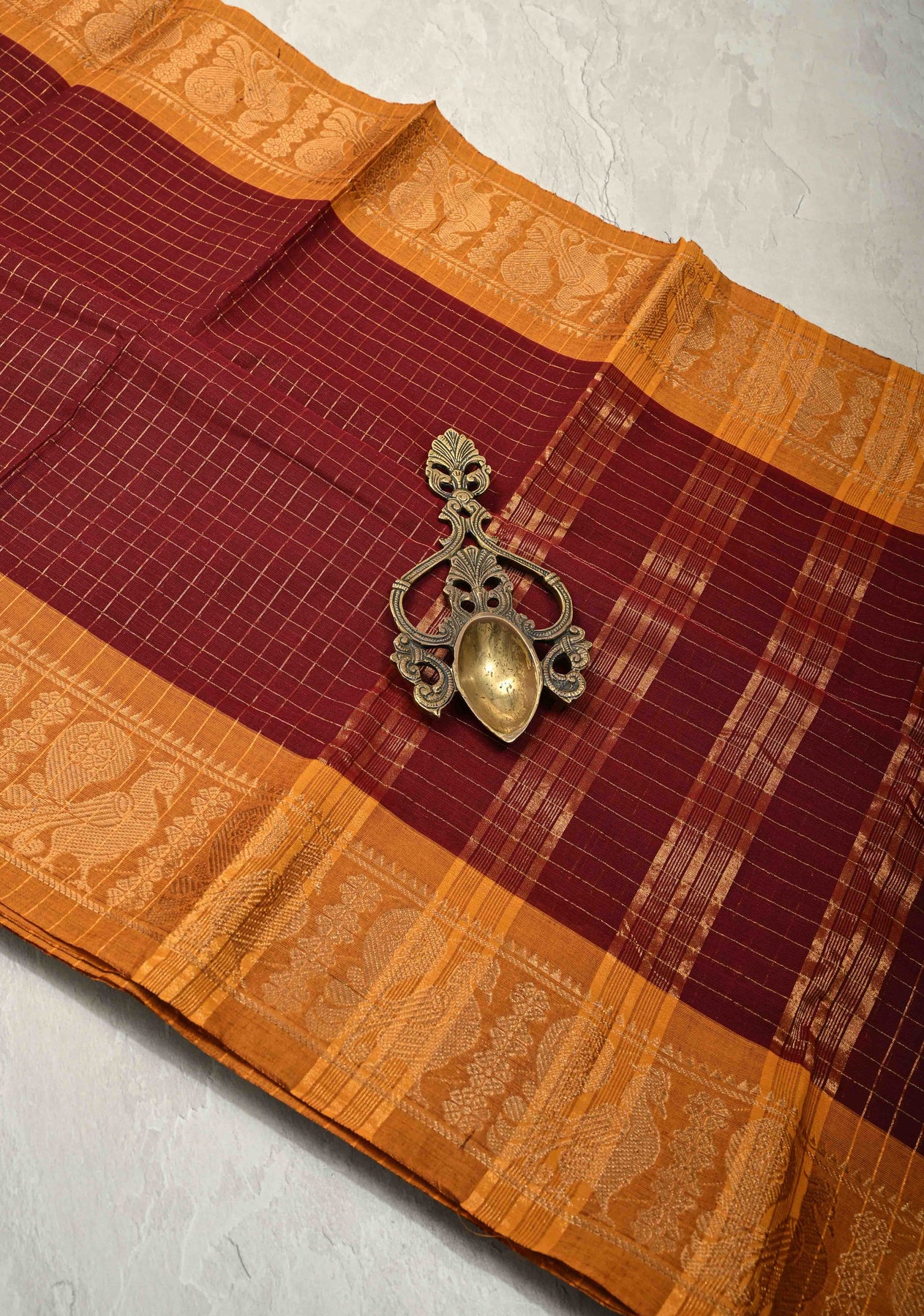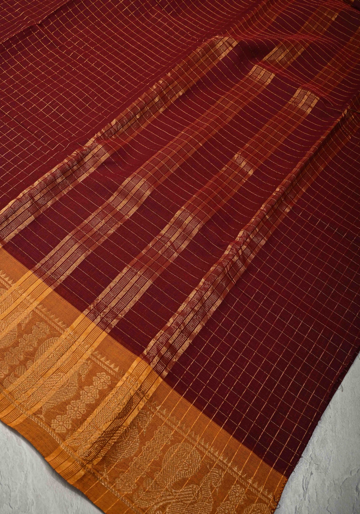 Embrace classic elegance with this Maroon Silk Cotton Handloom Saree featuring Zari Checks and a Contrast Zari Border. Woven on traditional handlooms, this saree combines the rich sheen of silk with the comfort of cotton, offering a graceful drape and breathable wear. The deep maroon hue exudes timeless sophistication, beautifully complemented by traditional zari checks across the body. Finished with a striking contrast zari border, this saree is perfect for festive occasions, cultural gatherings, office wear, and special celebrations. A true reflection of heritage craftsmanship and refined style.