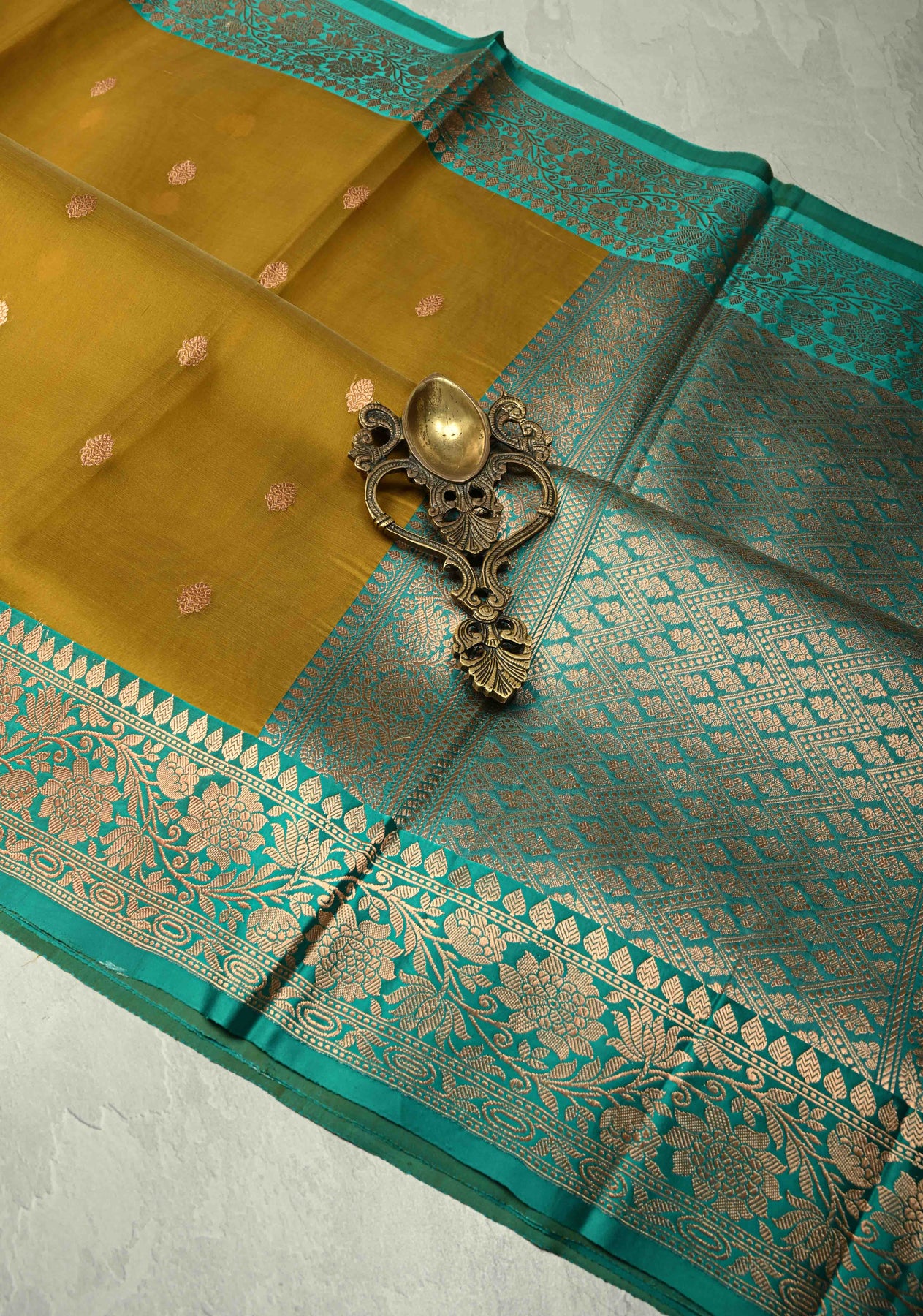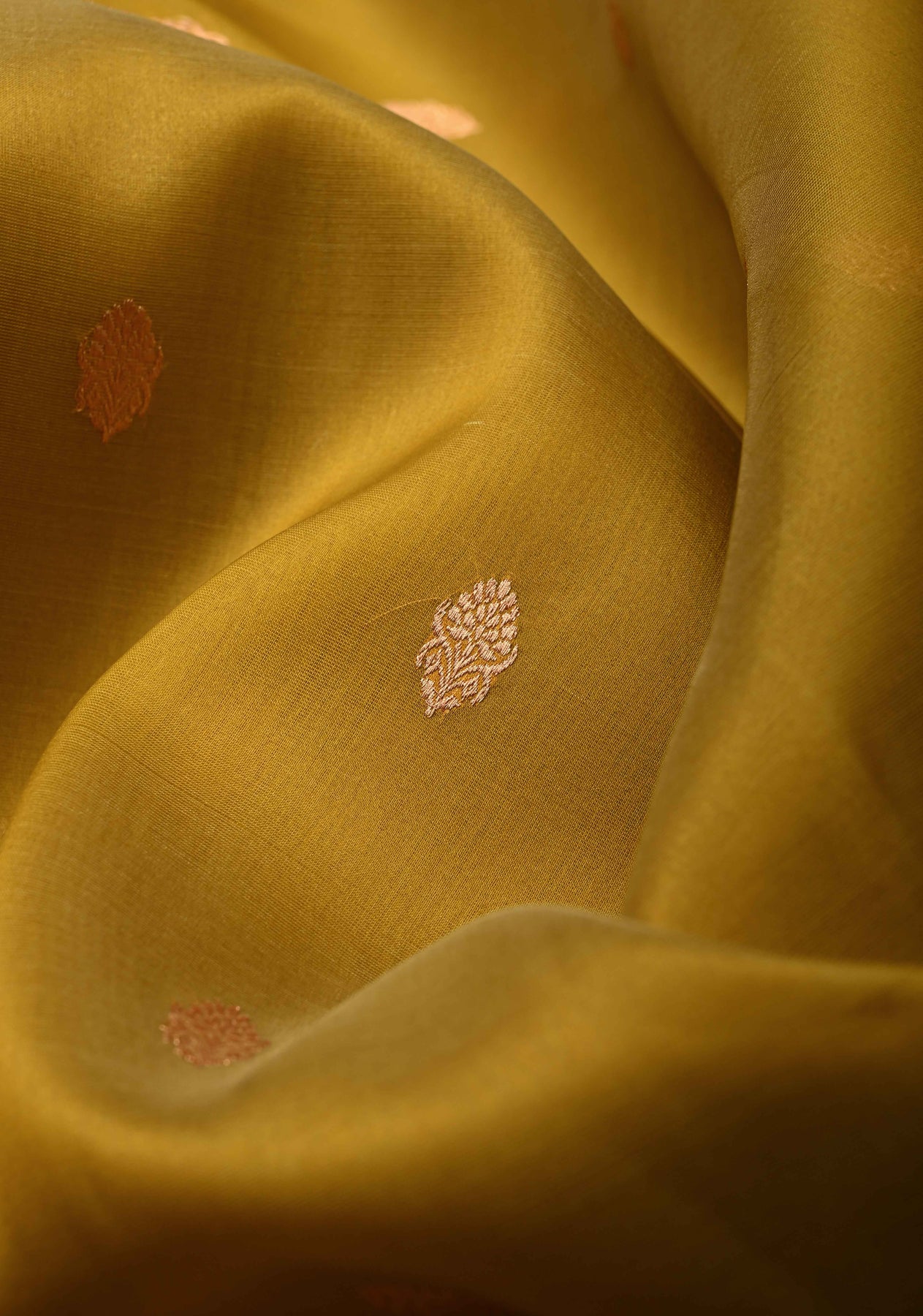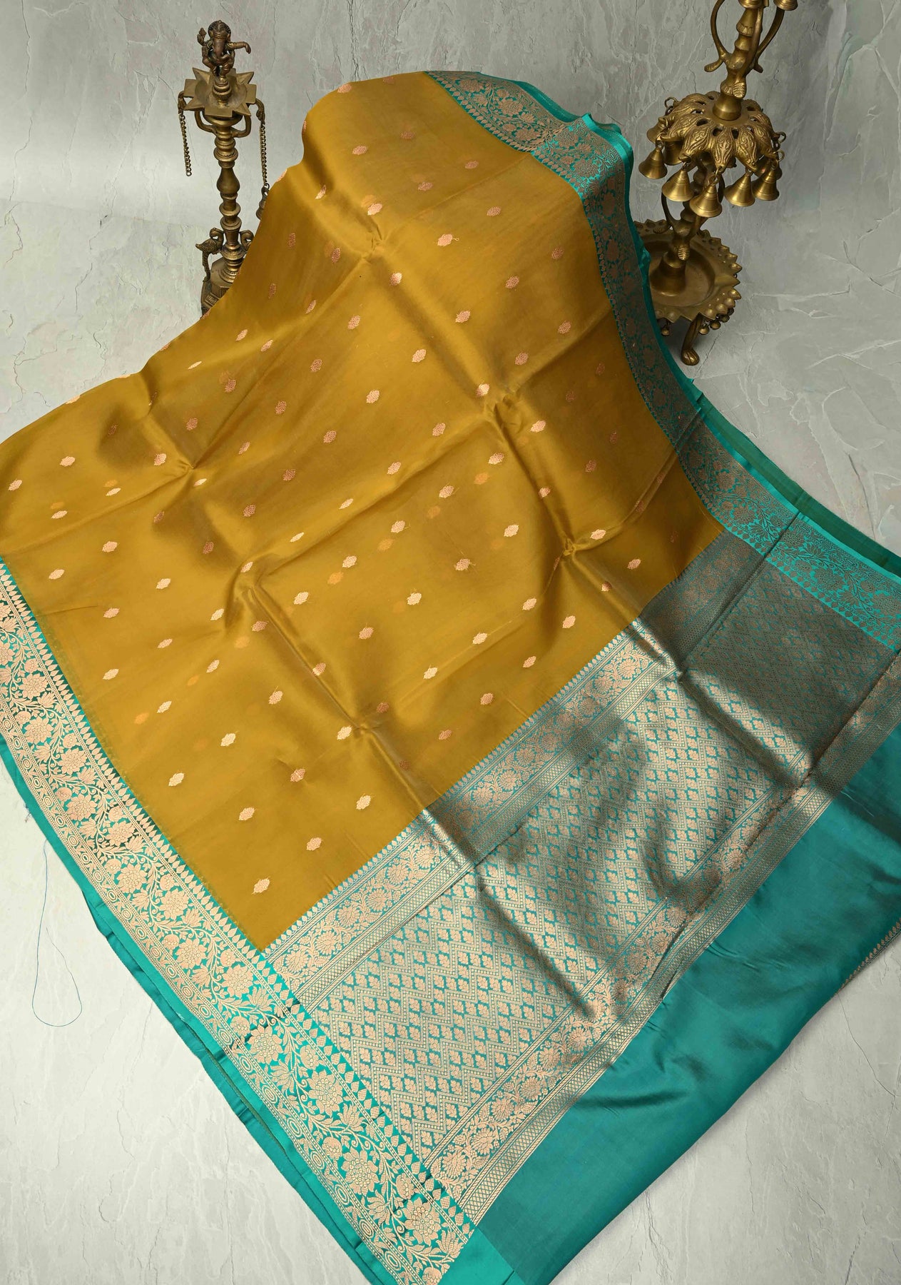 This Methi Yellow Pure Banarasi Kora Silk Saree is a beautiful expression of traditional elegance and fine craftsmanship. Woven from kora silk, it features a lightweight, sheer texture with a natural shimmer that enhances its graceful appeal. The saree is adorned with delicate zari buttas scattered across the body, exuding subtle opulence and timeless charm. A rich contrast zari border adds depth and sophistication, making it a perfect choice for festive occasions, weddings, and traditional gatherings. This saree effortlessly combines classic Banarasi artistry with refined contemporary style.