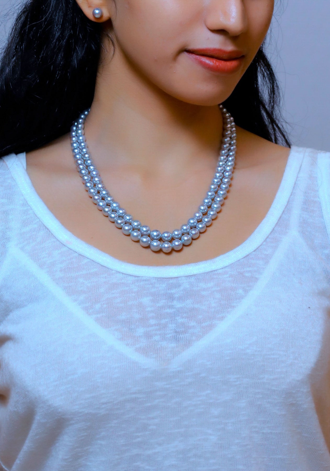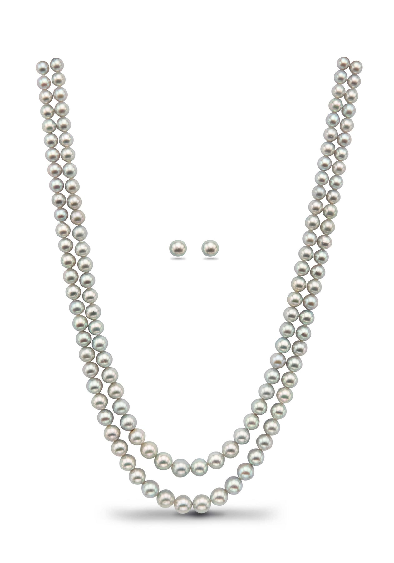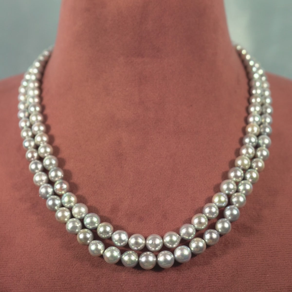 A two-strand grey saltwater Akoya pearls grading necklace set embodies refined elegance and sophistication. Saltwater Akoya pearls are renowned for their exceptional quality and lustrous sheen, making them highly sought after in the world of pearl jewelry.