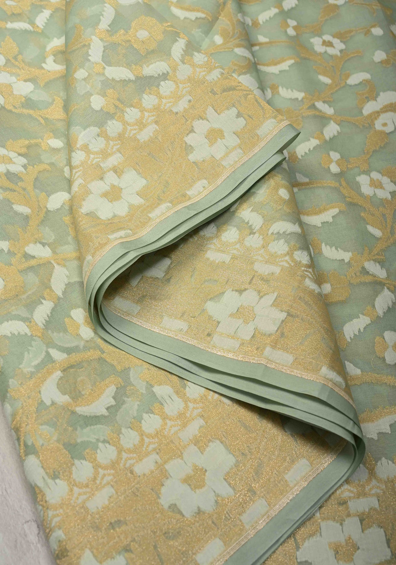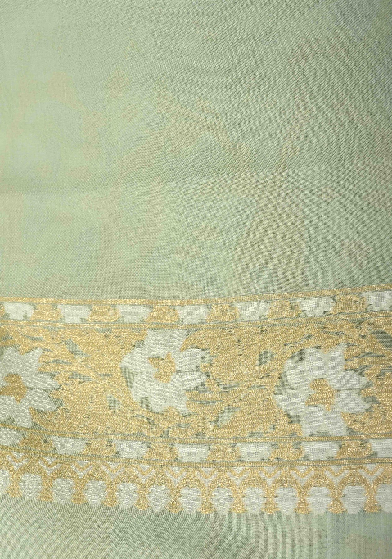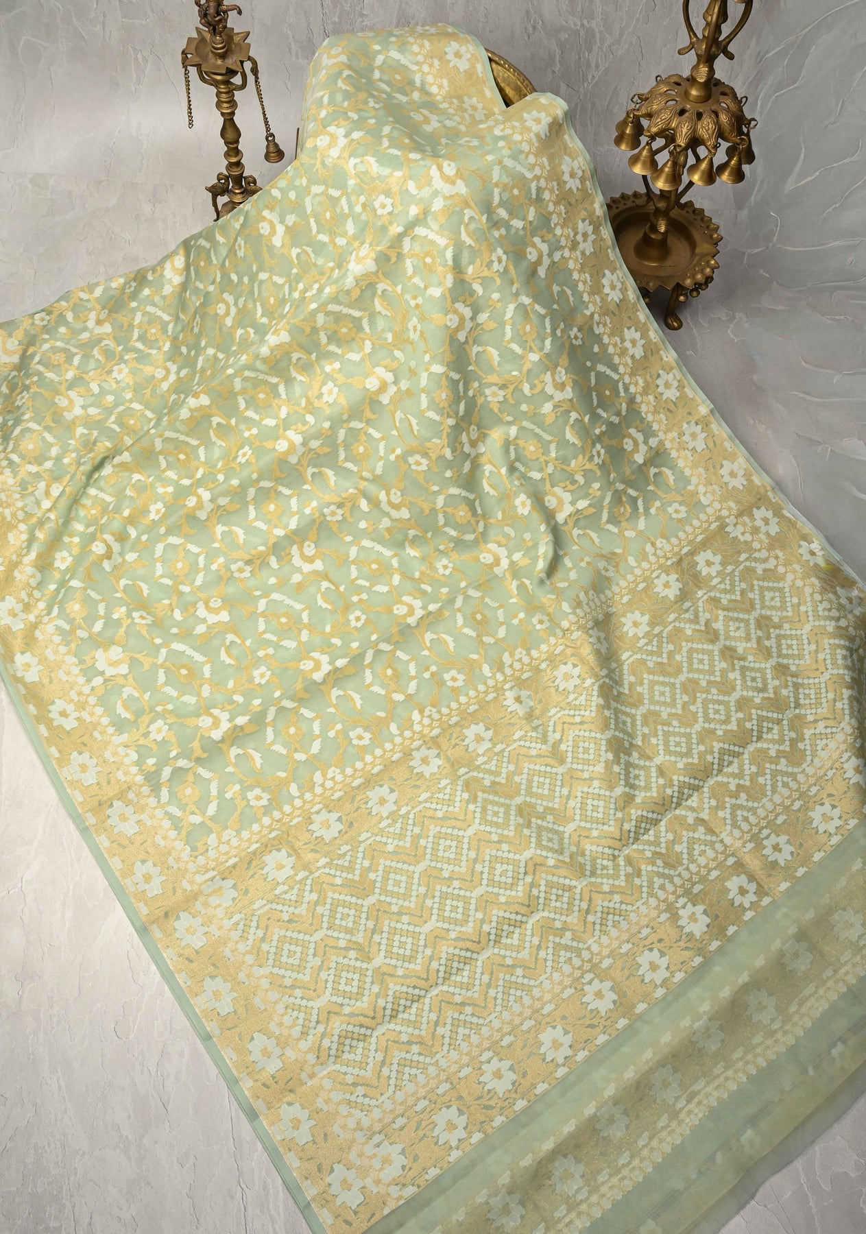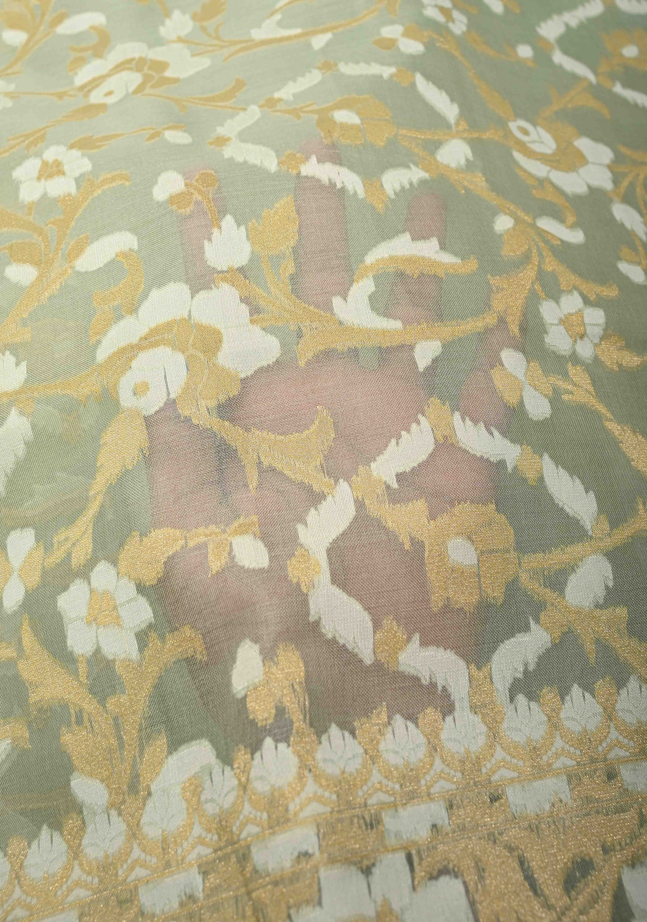Muted Sage Banarasi Kora Silk Saree with Meenakari Brocade Jaal and Zari Border | SILK MARK CERTIFIED