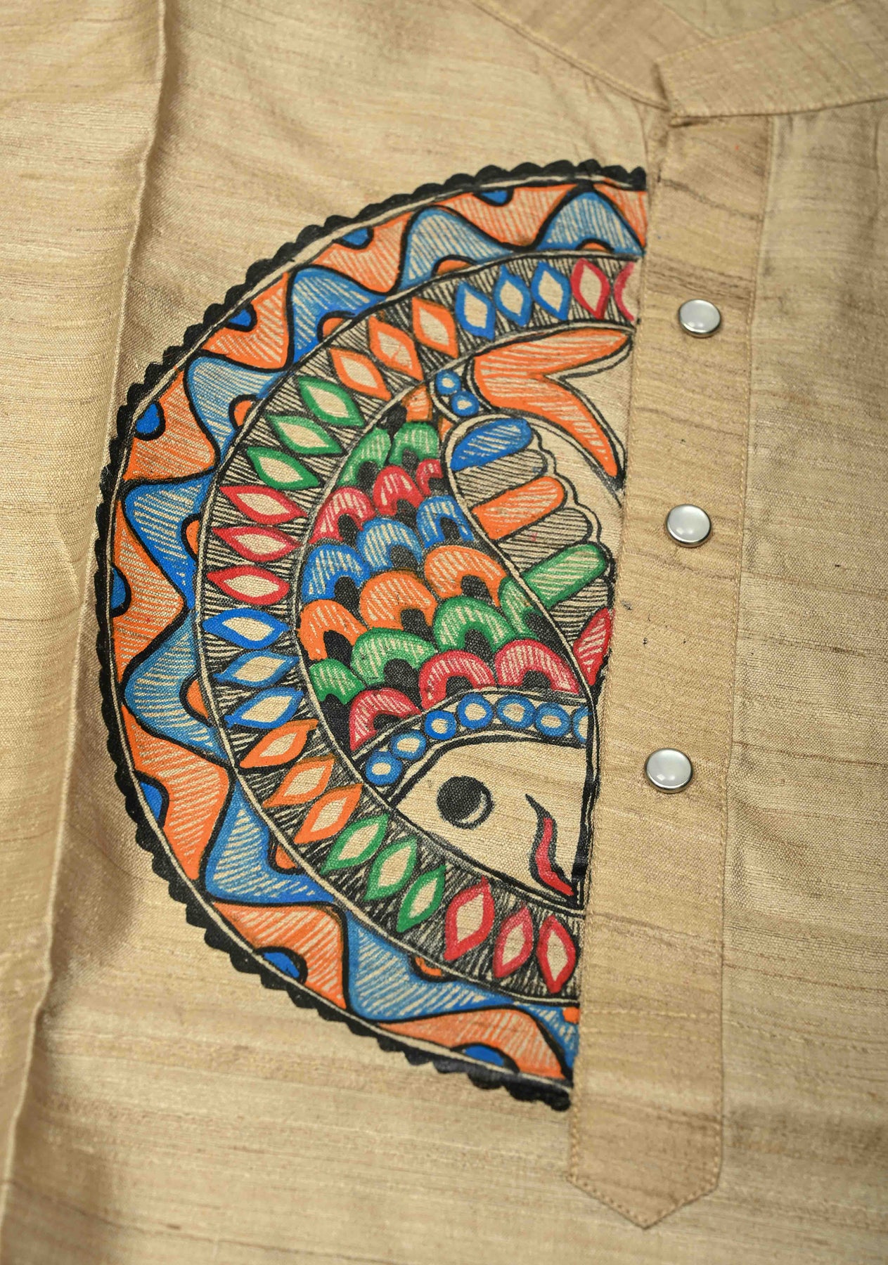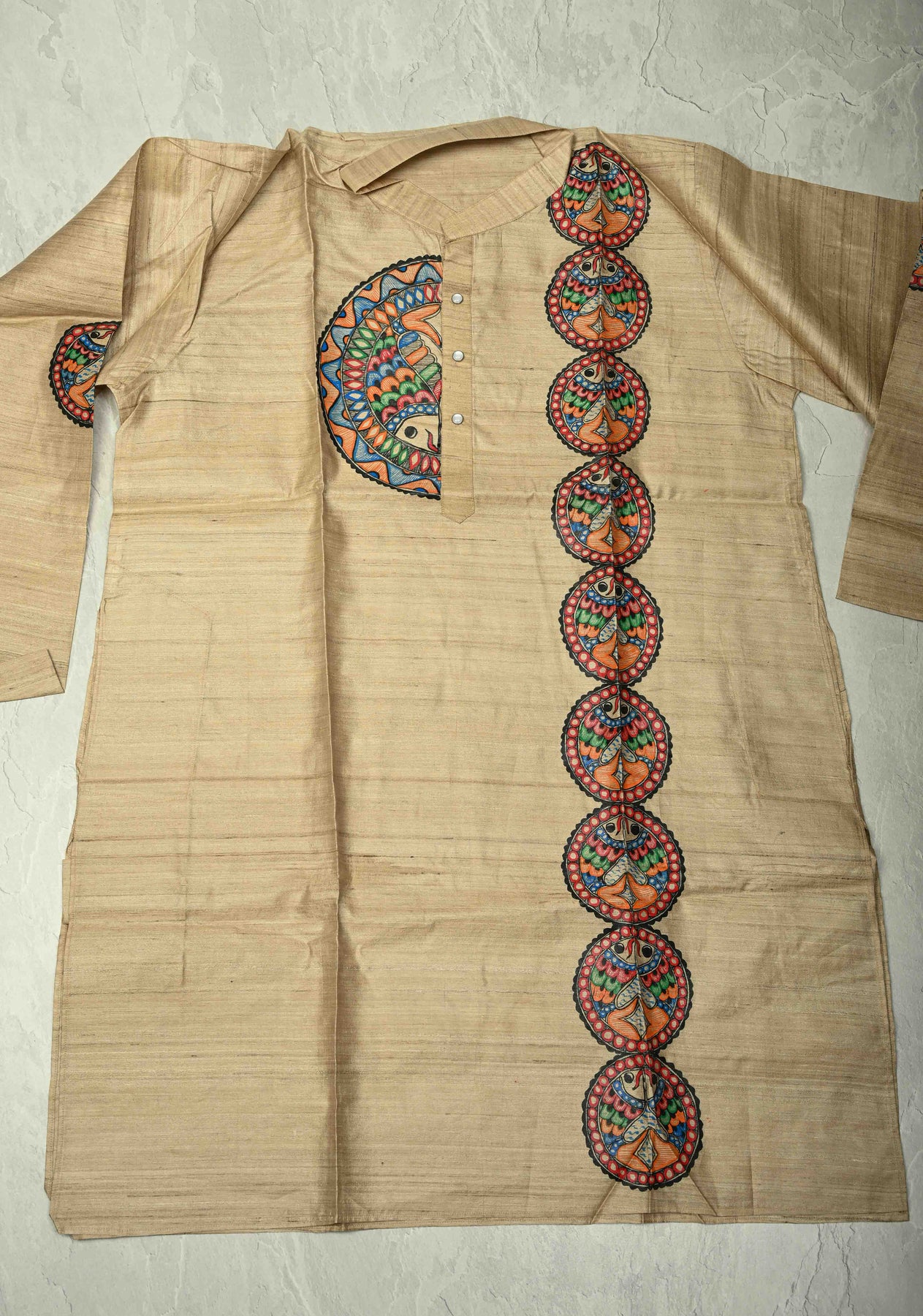 This Natural Color Tussar Silk Full Sleeves Men’s Kurta beautifully blends elegance with traditional Indian artistry. Crafted from Tussar silk, it features a rich, textured finish and a comfortable, refined drape. The highlight of this kurta is the exquisite Madhubani hand painting, meticulously created by skilled artisans to showcase cultural motifs and intricate detailing. Perfect for festive celebrations, cultural events, and special occasions, this kurta offers a sophisticated ethnic look while celebrating India’s heritage and craftsmanship.