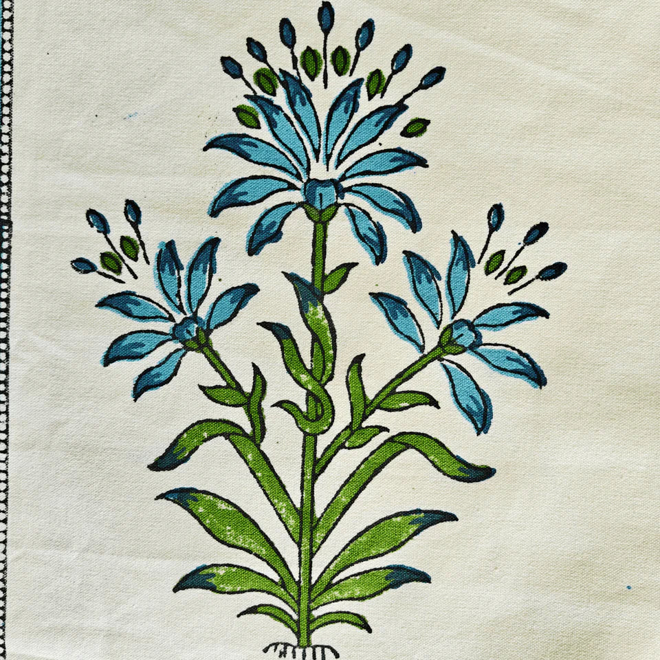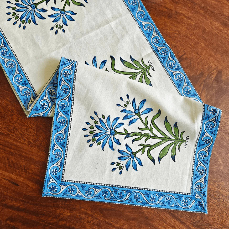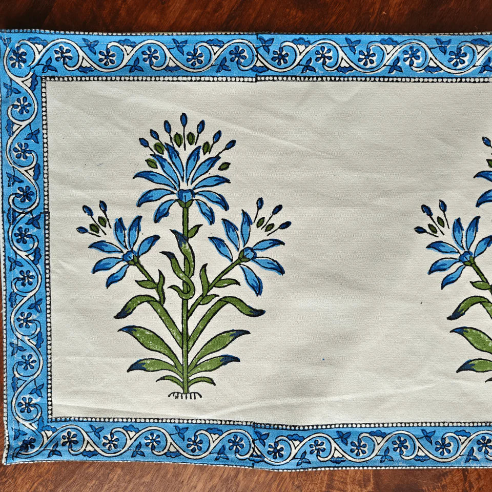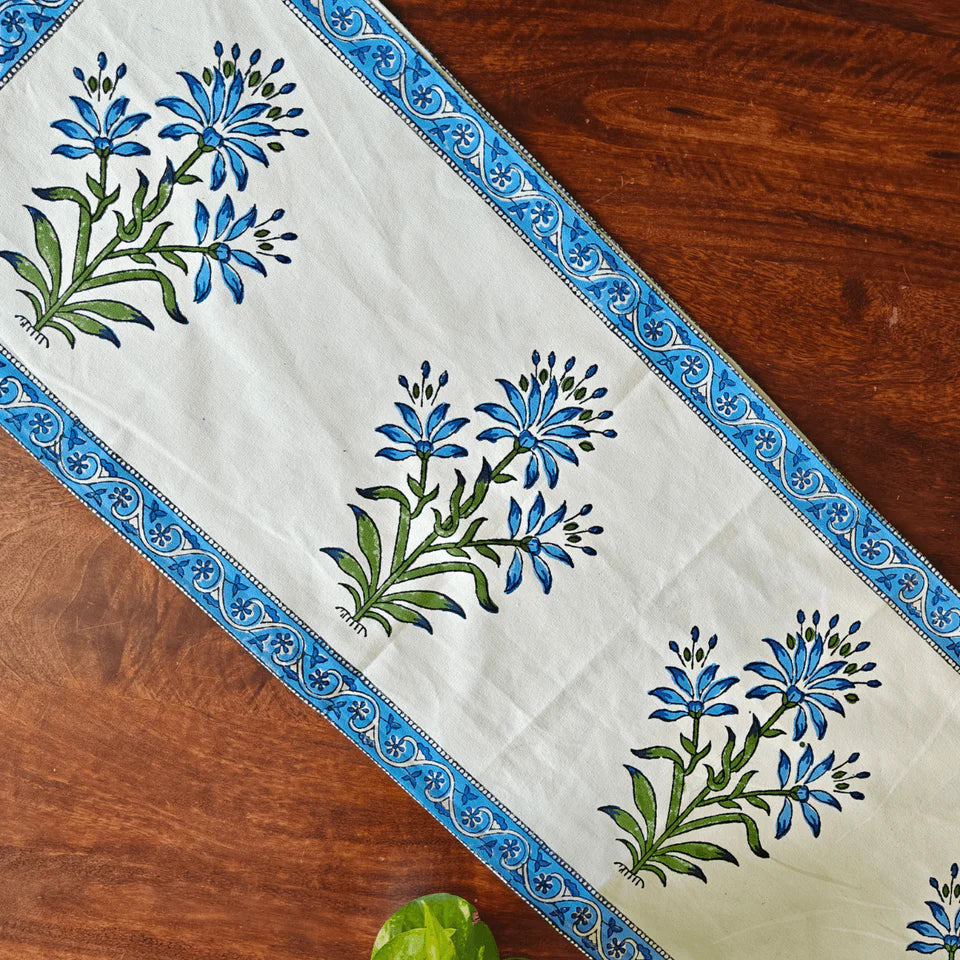 With its fresh blue floral clusters and fine border detailing, the Neela table runner brings a crisp, breezy elegance to your table setting. Hand block printed on soft, ecru-toned cotton, the rich indigo and leaf-green palette adds a touch of nature and calm sophistication. Perfectly sized at 13" x 72", it's ideal for 4–6 seater tables.