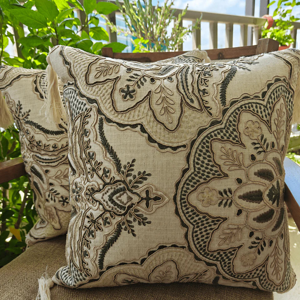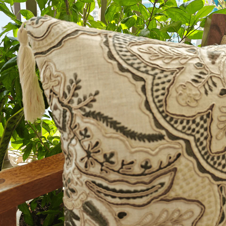 Bring home timeless sophistication with the Oasis cushion cover set. Featuring intricate embroidery inspired by nature, these covers add depth and elegance to any space. Crafted in premium linen-look fabric, Oasis is designed to elevate your décor with a refined, artisanal touch.