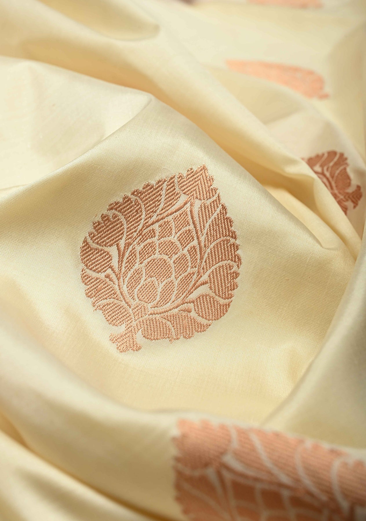 This exquisite Off White Banarasi Katan Silk Saree is a symbol of timeless elegance and regal craftsmanship. Woven from katan silk, it features a smooth, lustrous texture that drapes beautifully. The saree is adorned with intricate zari buttas scattered gracefully across the body, adding a touch of opulence. Its rich contrast red zari border enhances the overall grandeur, creating a striking balance of subtlety and splendor. Perfect for weddings, festive occasions, and traditional celebrations, this saree is a true testament to Banaras’ rich weaving heritage and refined artistry.