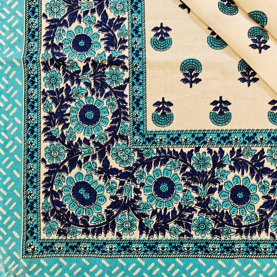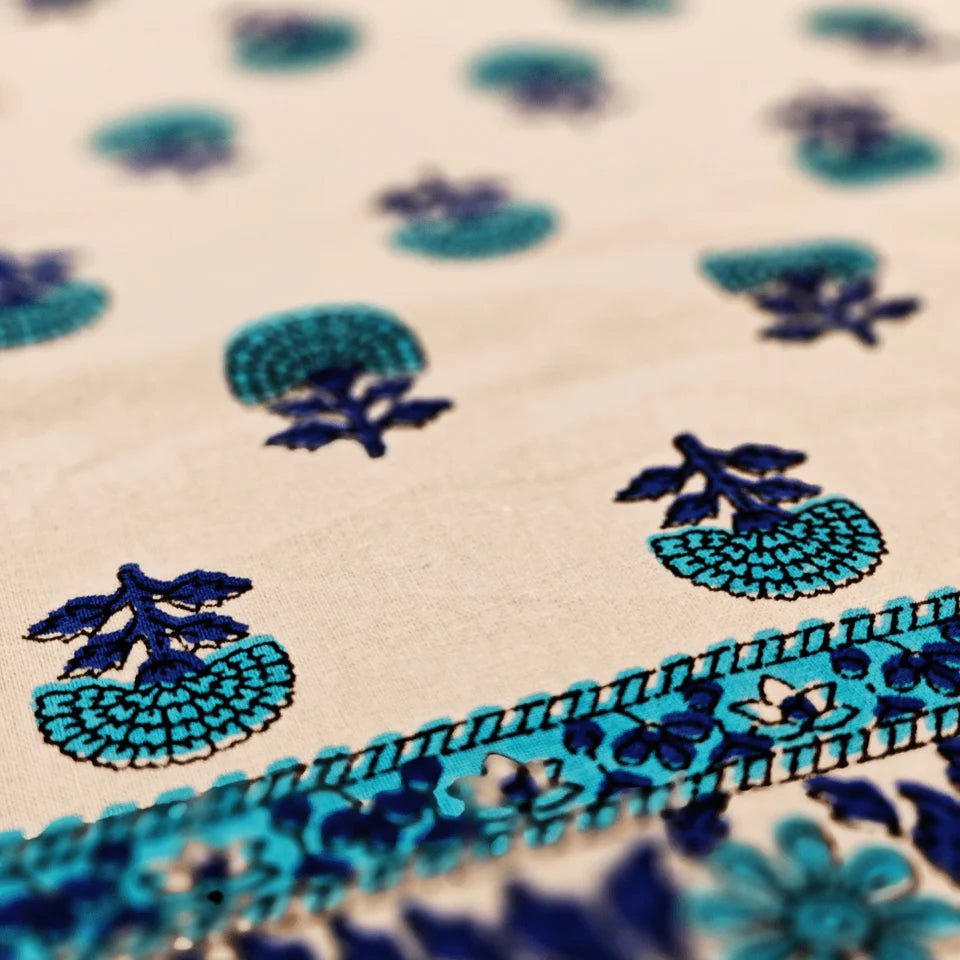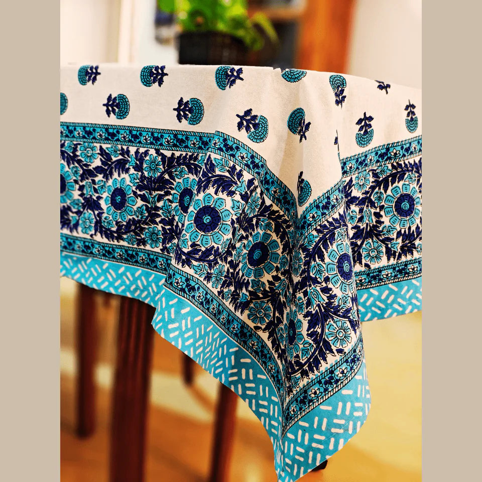 Brighten your dining experience with the Opal Table Cover, adorned in rich sapphire and teal floral patterns that exude elegance and serenity. Inspired by traditional Indian motifs, this stunning piece instantly elevates the mood of your dining space with its classic charm and timeless palette.