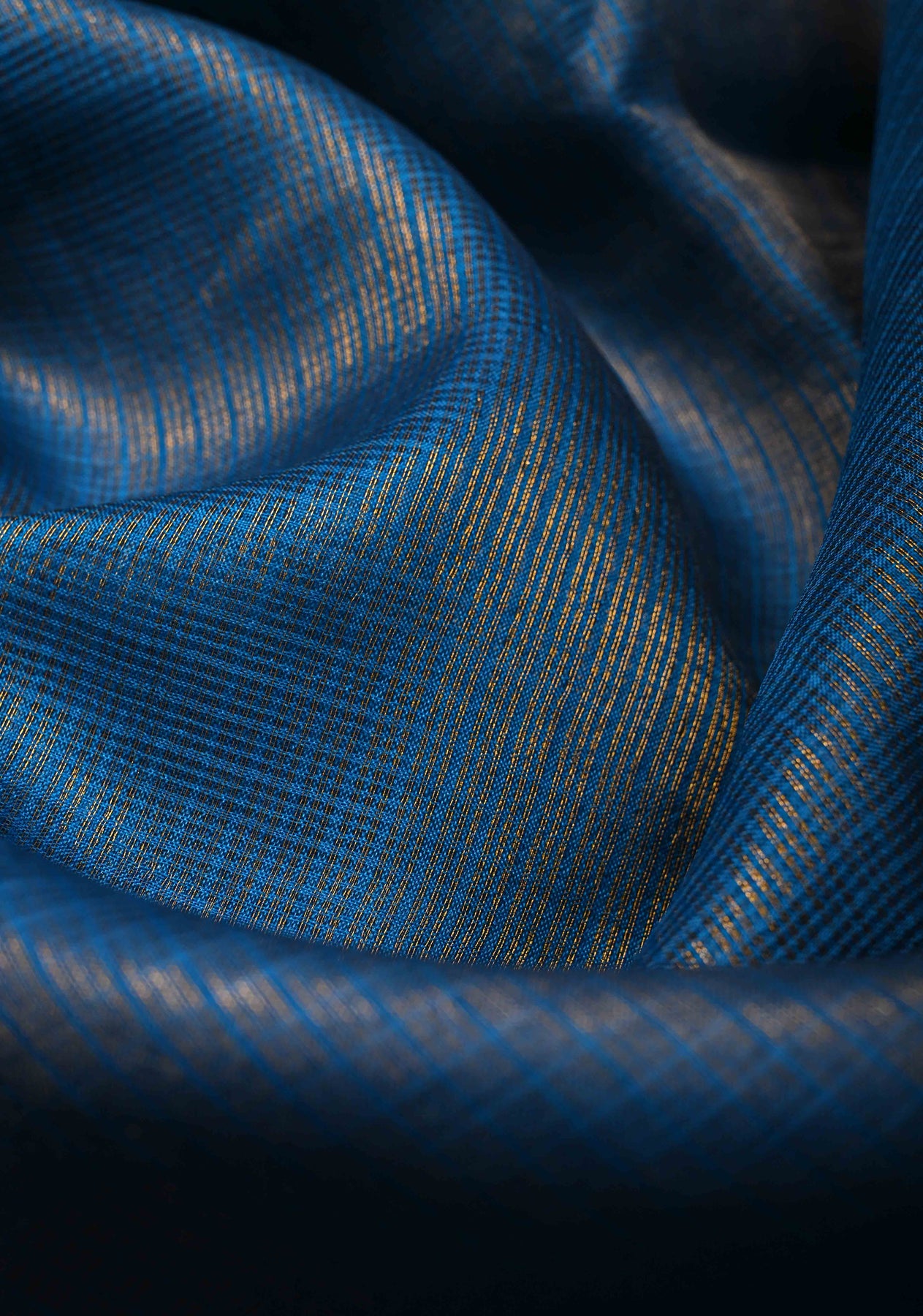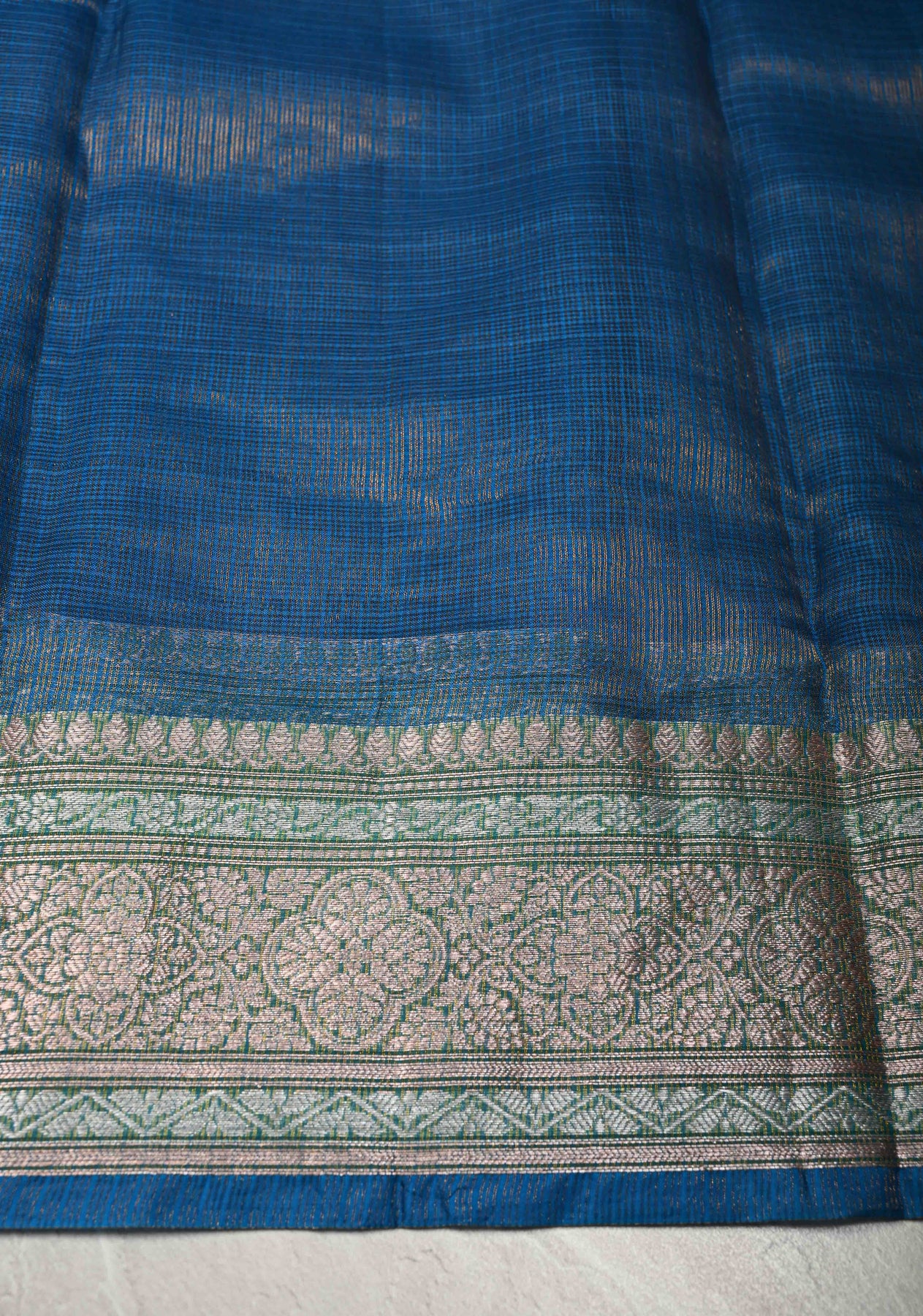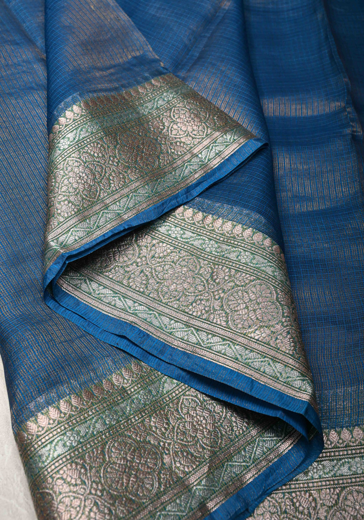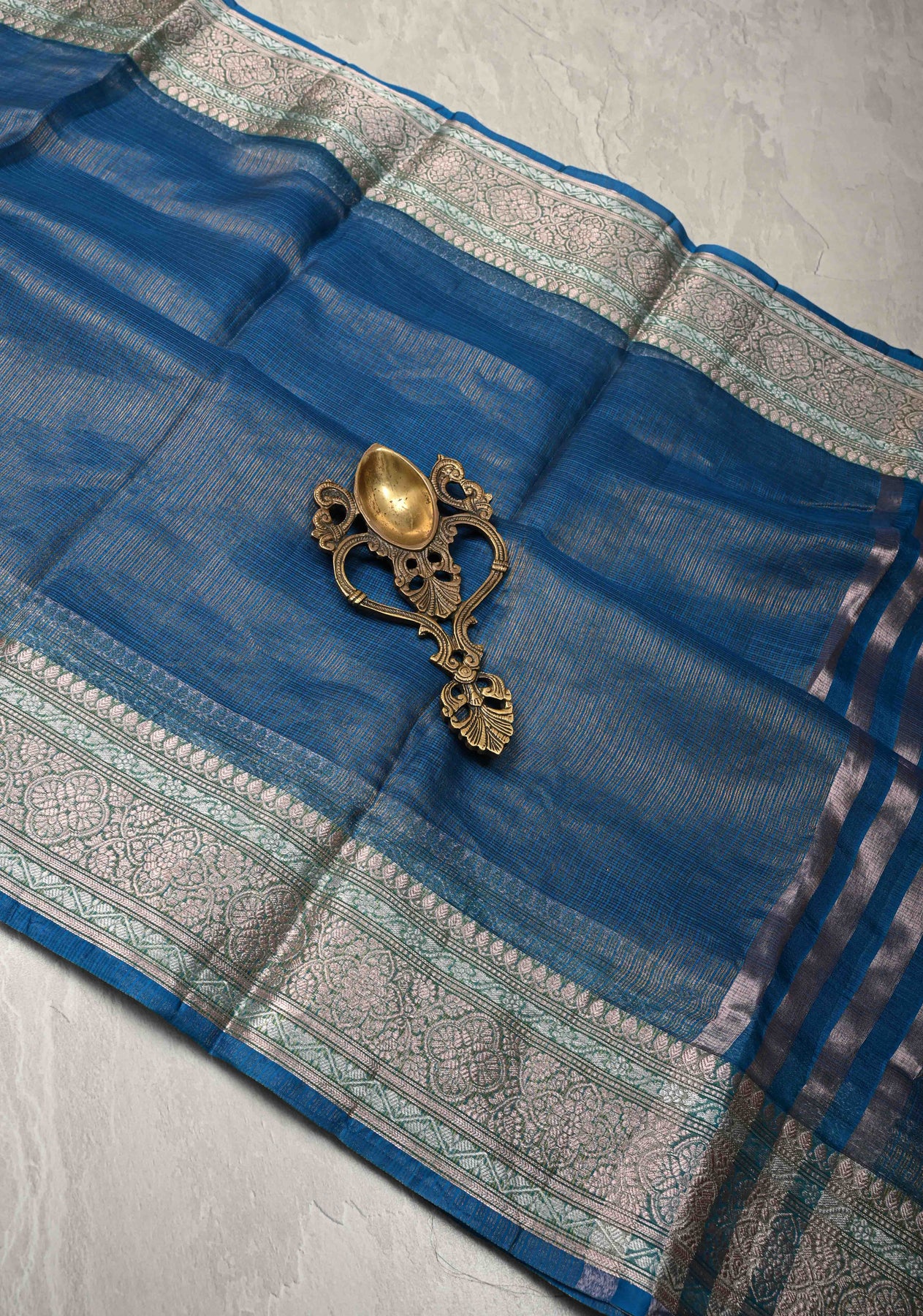 The Peacock Blue Kota Doria Tissue Cotton Saree with Sona Rupa Zari Border is a stunning fusion of bold color and delicate craftsmanship. Woven from airy Kota Doria fabric enhanced with shimmering tissue cotton, this saree offers a lightweight, breathable drape with a subtle sheen that adds grace to every movement. The peacock blue hue captures the essence of regal elegance, making it a standout choice for festive occasions, cultural events, or evening gatherings. Finished with an exquisite Sona Rupa zari border — blending gold and silver threads — this saree perfectly balances tradition and sophistication.