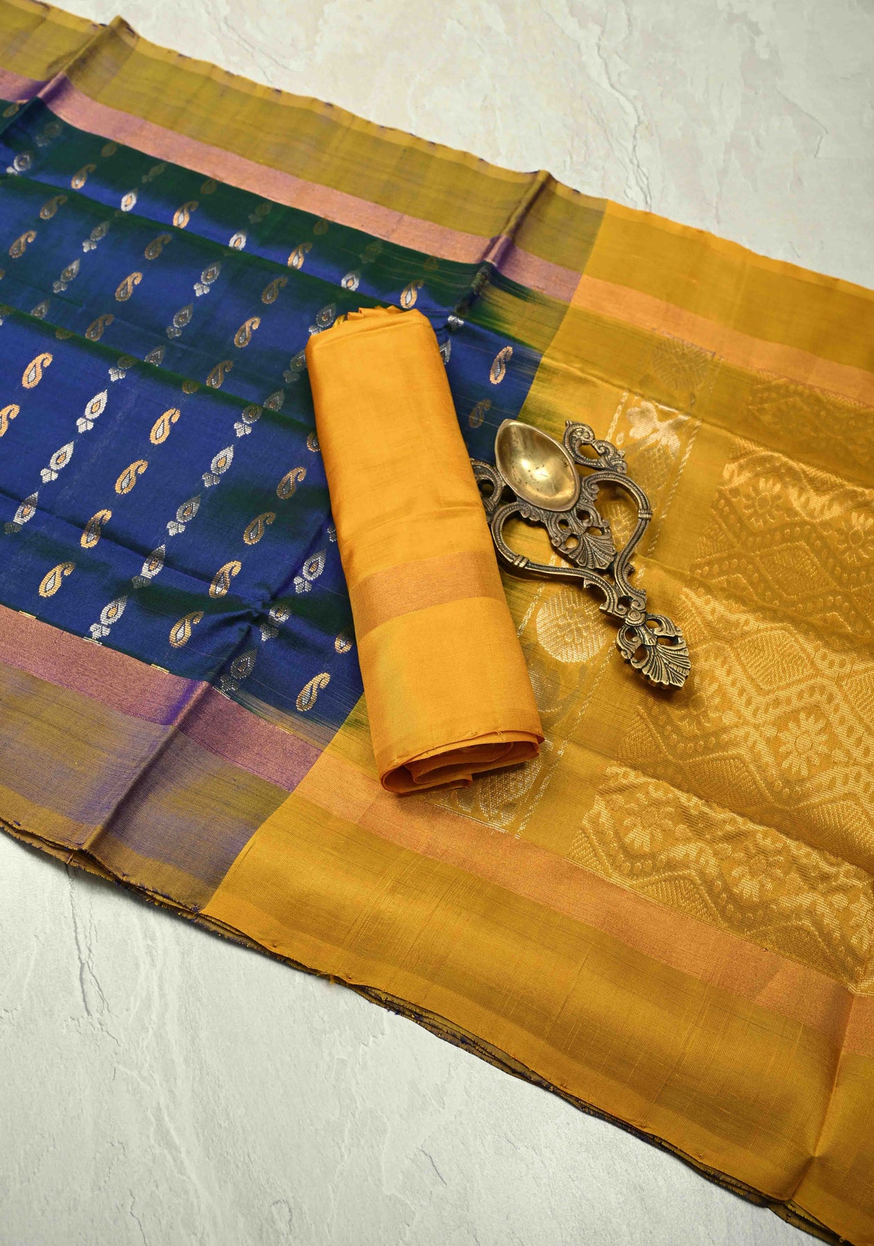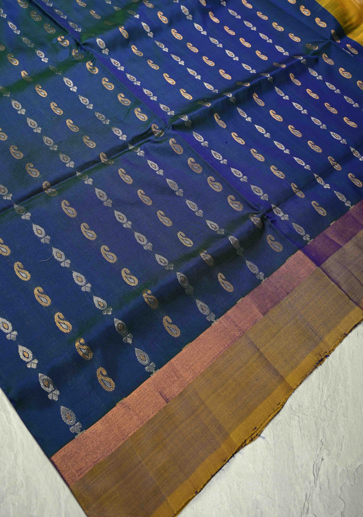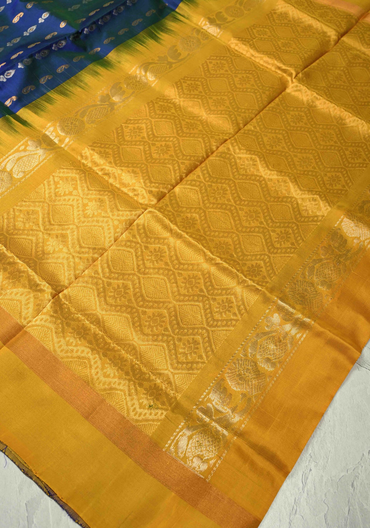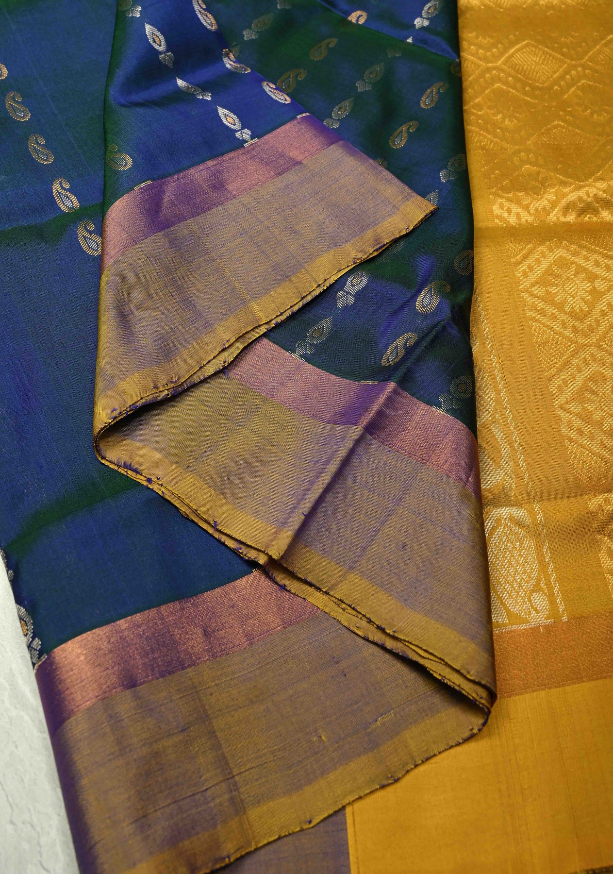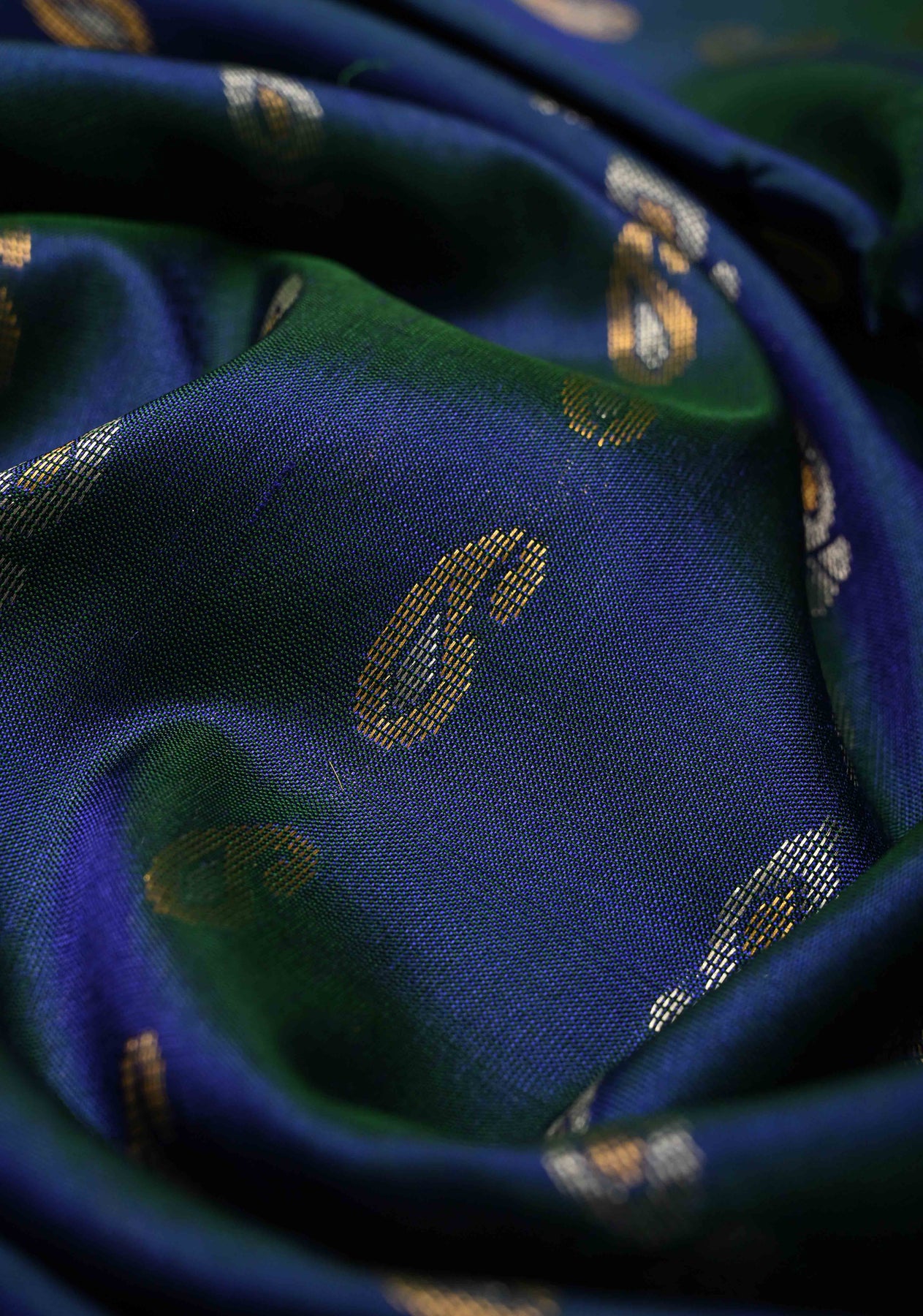 Peacock Green Blue Dual Tone Uppada Handloom Silk Saree with Meenakari Buttas and Contrast Border | SILK MARK CERTIFIED