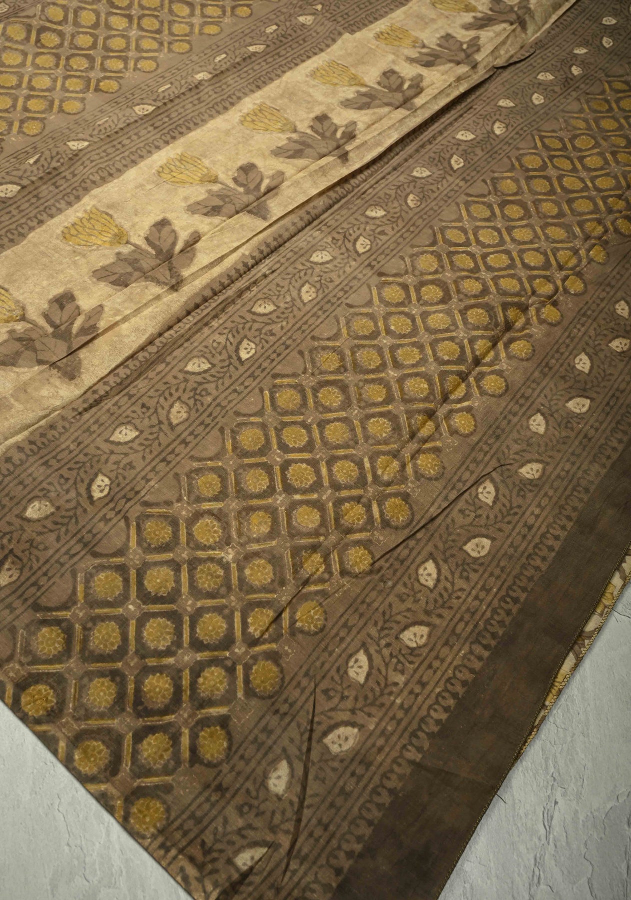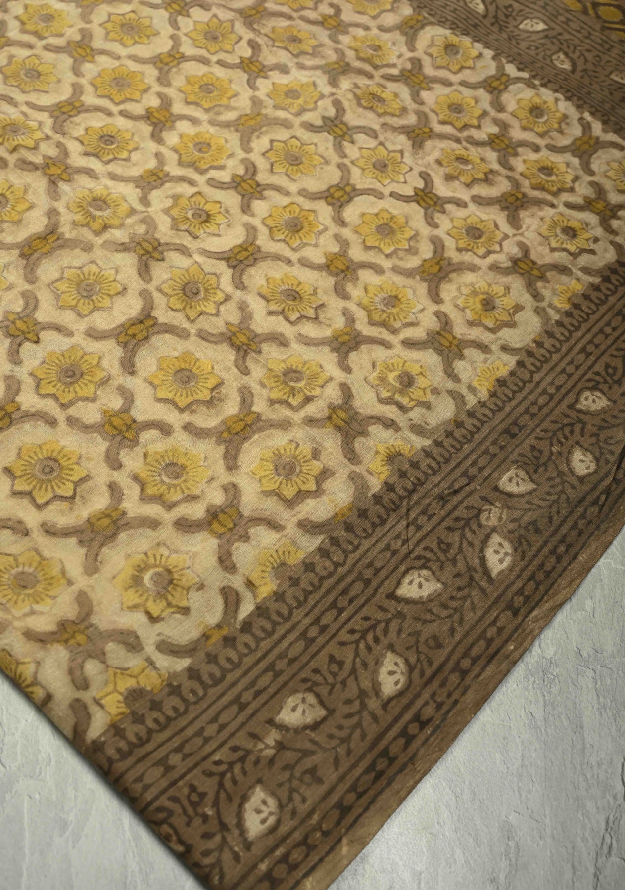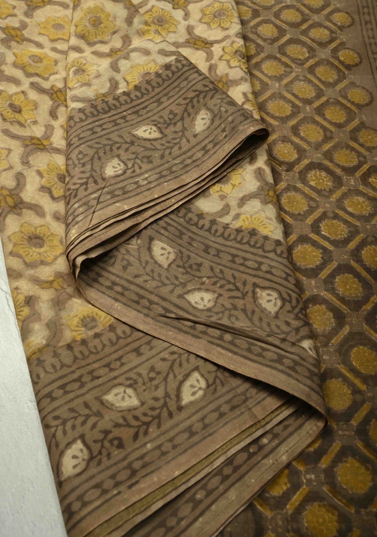 This Peanut Brown Mul Cotton Saree is a beautiful expression of comfort, tradition, and everyday elegance. Crafted from mul cotton, it feels gentle on the skin and drapes effortlessly, making it perfect for all-day wear. Adorned with delicate floral hand block prints, the saree carries an artisanal charm that highlights its handcrafted appeal. A contrast border adds a touch of definition and enhances its aesthetic balance. Ideal for casual outings, cultural gatherings, or office wear, this saree blends simplicity with artistic finesse.