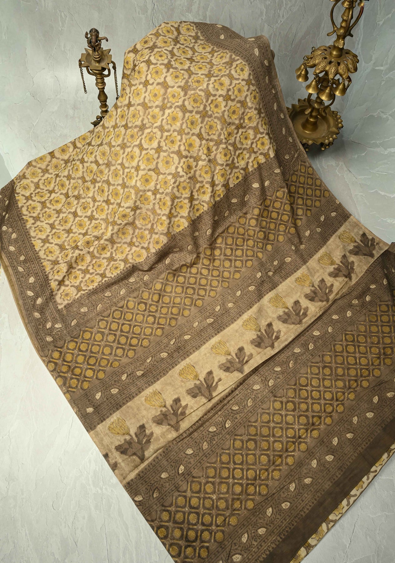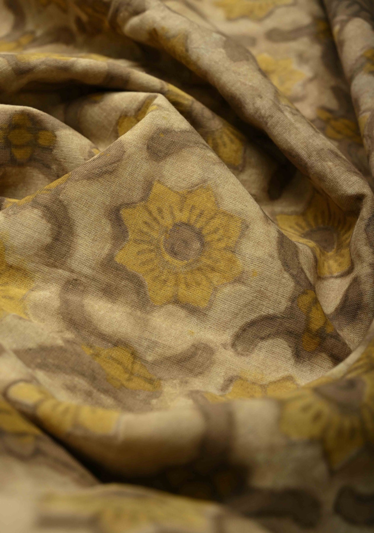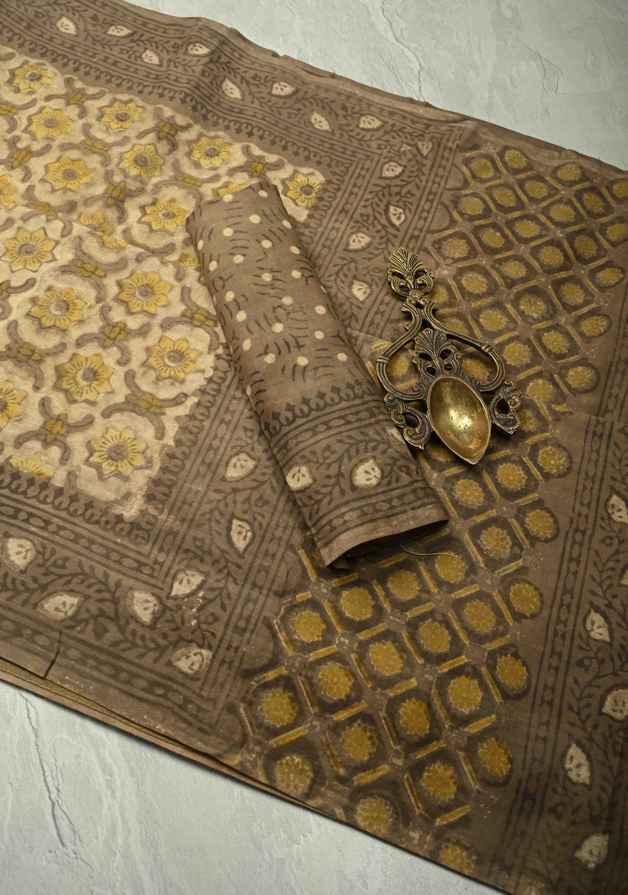 This Peanut Brown Mul Cotton Saree is a beautiful expression of comfort, tradition, and everyday elegance. Crafted from mul cotton, it feels gentle on the skin and drapes effortlessly, making it perfect for all-day wear. Adorned with delicate floral hand block prints, the saree carries an artisanal charm that highlights its handcrafted appeal. A contrast border adds a touch of definition and enhances its aesthetic balance. Ideal for casual outings, cultural gatherings, or office wear, this saree blends simplicity with artistic finesse.