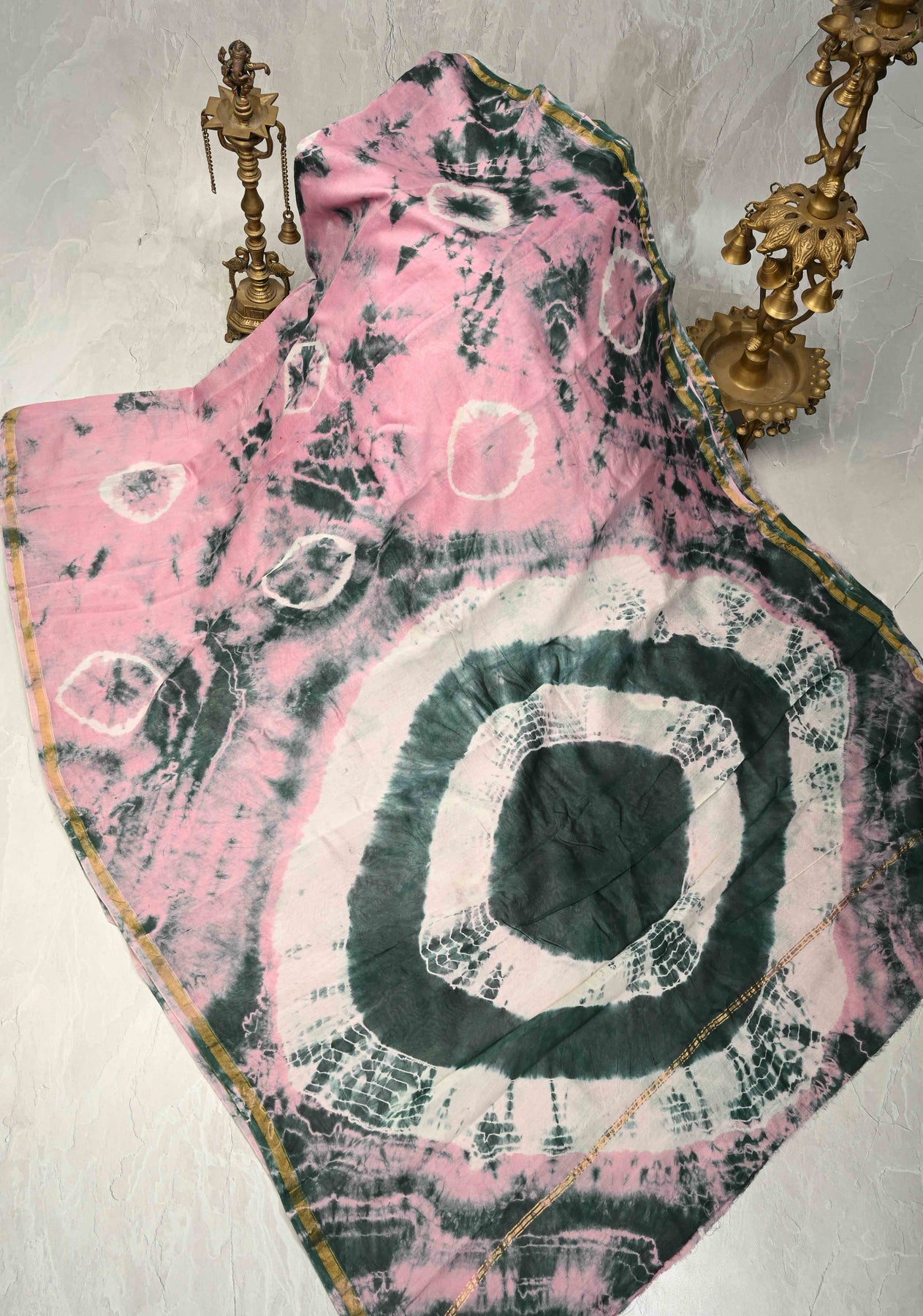 A truly rare and graceful piece, this baby pink Chanderi silk cotton saree is artfully adorned with a fusion of Bagru handblock printing and the age-old Shibori tie-dye technique, with refreshing touches of green that lend it a unique charm.