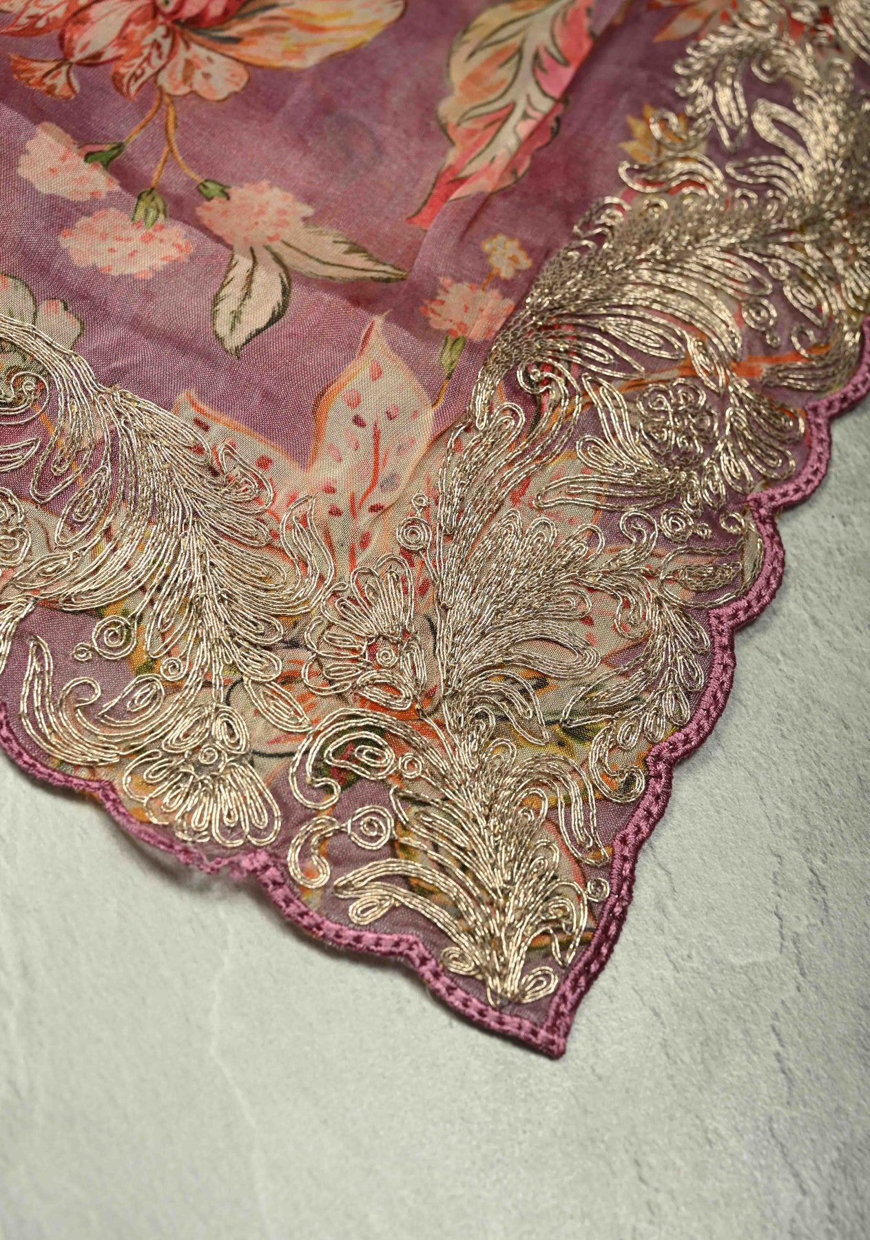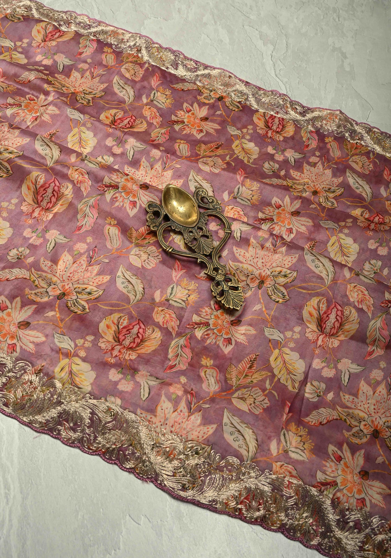 Artistically hand-painted chintz pattern in subtle pastel hues, evoking elegant softness is printed through digital print. The border is artfully highlighted with intricate cord patti embroidery, blending delicate craftsmanship with gentle tones to create a timeless, sophisticated drape that celebrates contemporary artistry with a nod to tradition.