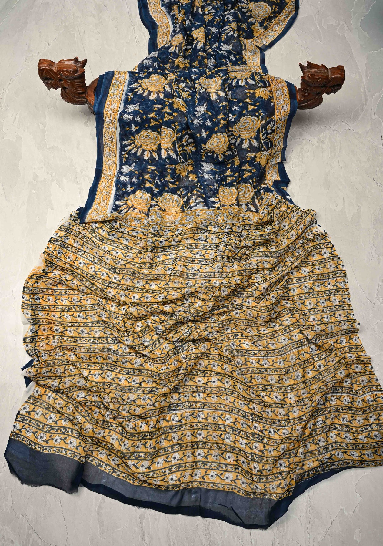This exquisite Prussian Blue Georgette Saree is a perfect blend of rich color and traditional artistry. Crafted from lightweight georgette fabric, it offers a graceful and fluid drape, ideal for both casual and festive occasions. The saree is adorned with intricate Sanganeri hand block prints featuring delicate floral and folk motifs that highlight Rajasthan’s rich textile heritage. The Prussian blue shade adds a regal touch, making it a versatile and elegant choice. Combining comfort with classic craftsmanship, this saree is a timeless addition to any ethnic wardrobe.