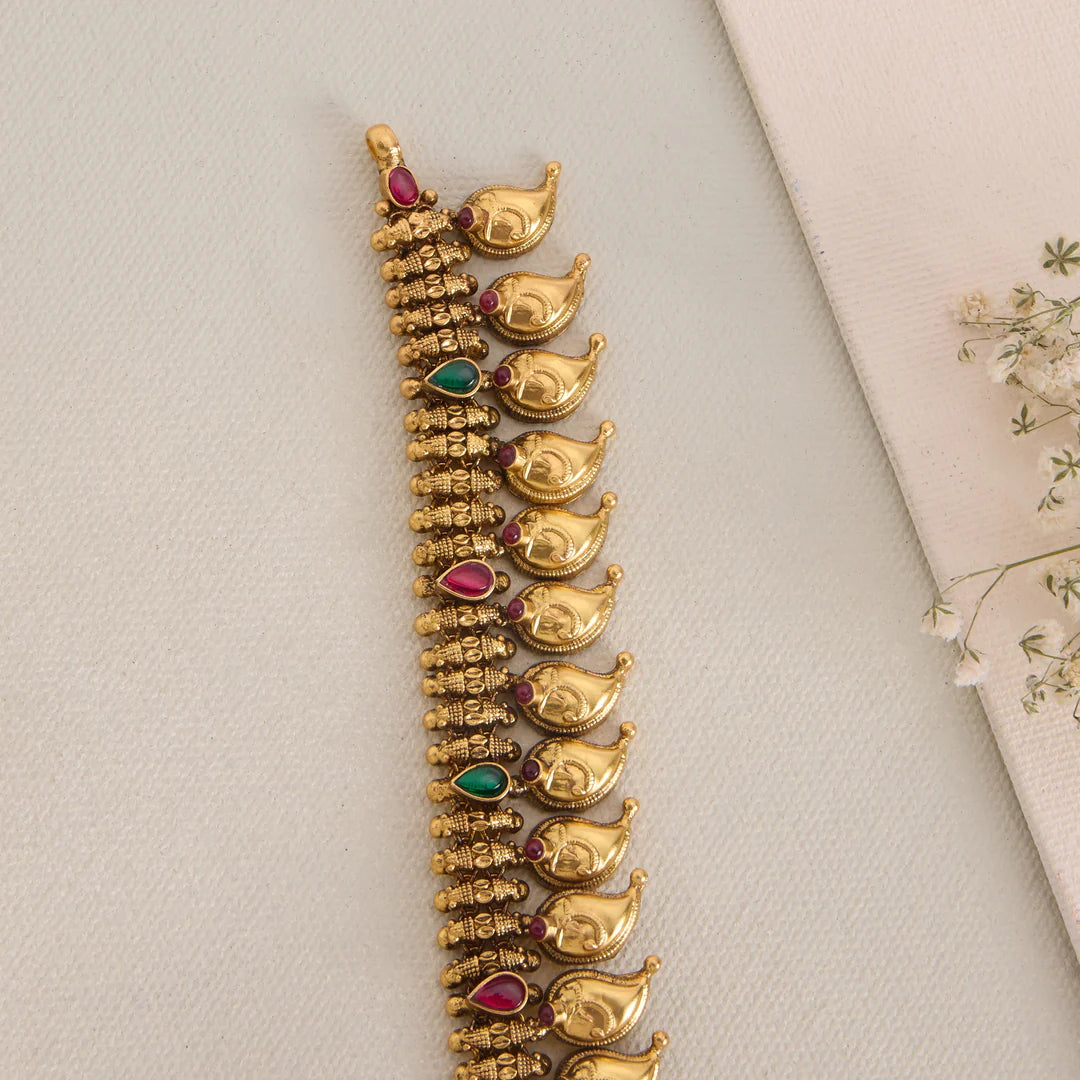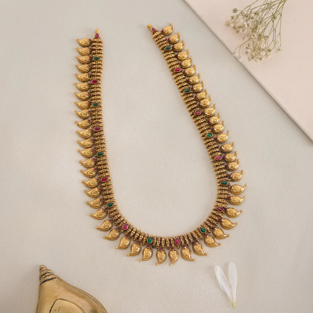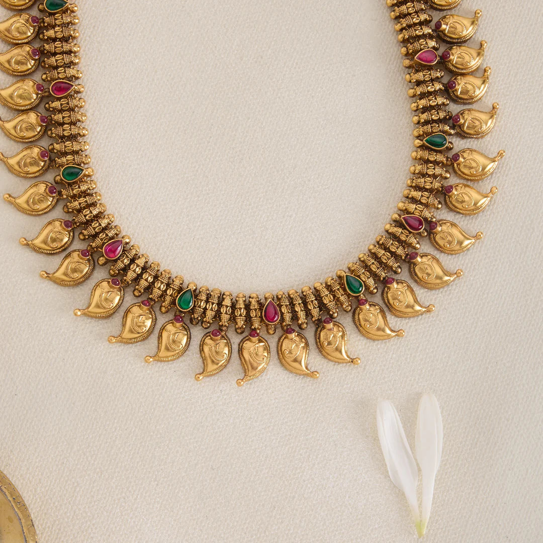 Amra Nakshi Haaram showcases exquisite craftsmanship featuring intricate Mango motifs, elegantly adorned with lustrous Emeralds and vibrant Rubies. This piece combines traditional artistry with the richness of precious gemstones, making it a distinguished addition to any fine jewellery collection. Perfect for elevating special occasions with a touch of timeless elegance.