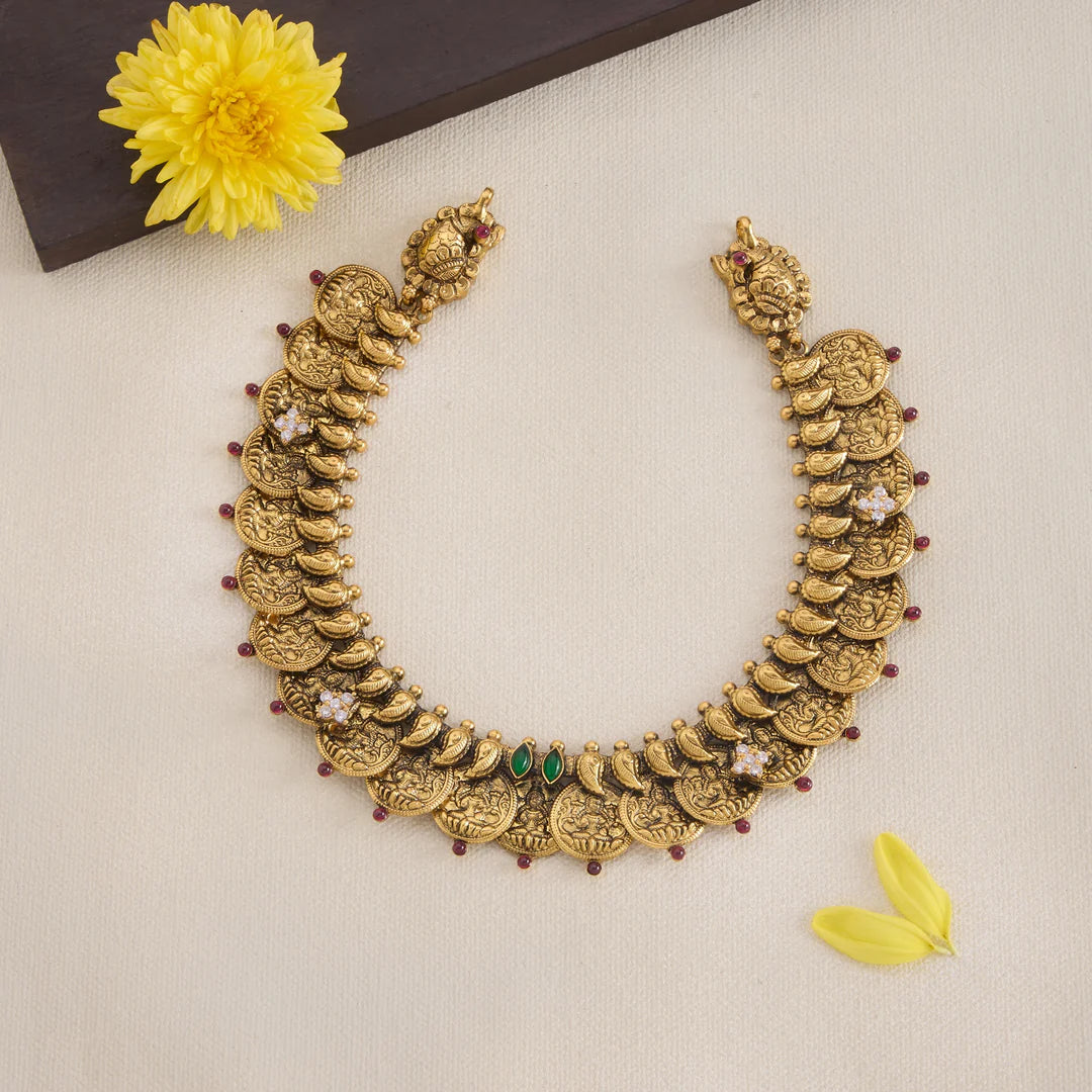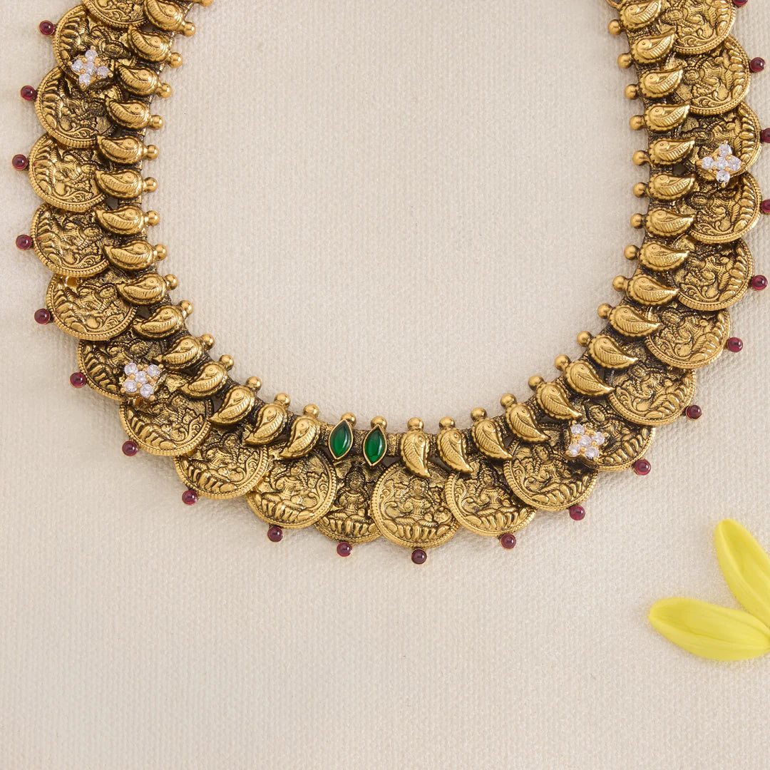 The Kaasuleya Necklace features a distinctive Coin-shaped Lakshmi adorned with intricate Mango-shaped motifs. Enhanced with sparkling Cubic Zirconia stones, vibrant Rubies, and rich Emeralds, this piece blends traditional symbolism with exquisite craftsmanship, making it a sophisticated choice for those who appreciate fine, detailed jewellery.