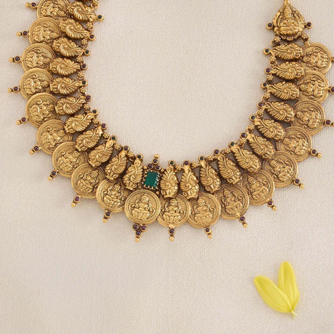 The Kasu Suvarnita Necklace features exquisitely crafted Coin-shaped Lakshmi motifs, symbolizing prosperity and grace. Adorned with vibrant Emeralds and Rubies, this piece seamlessly blends traditional symbolism with vibrant gemstones, offering both aesthetic appeal and cultural significance. Perfect for elevating any ensemble, this necklace reflects expert craftsmanship and detailed design.