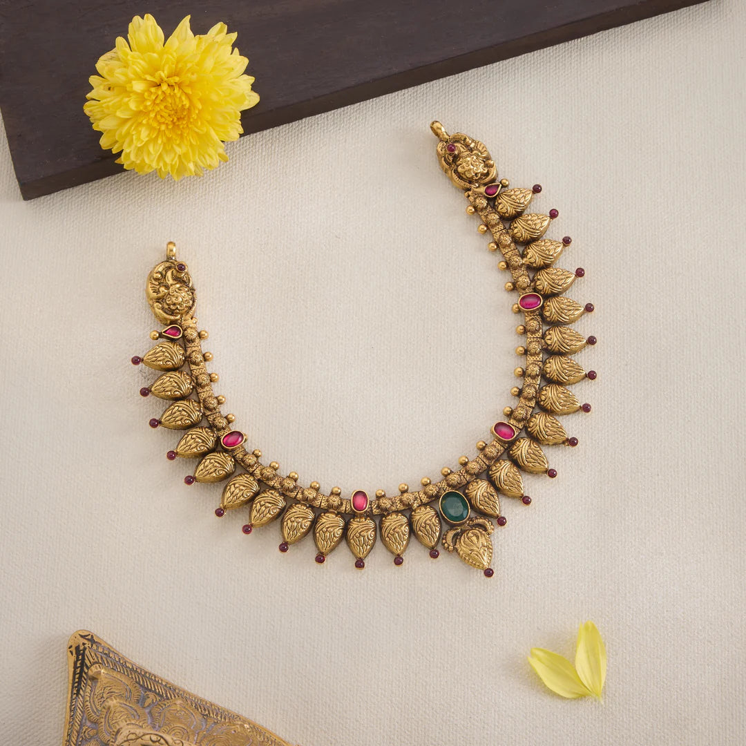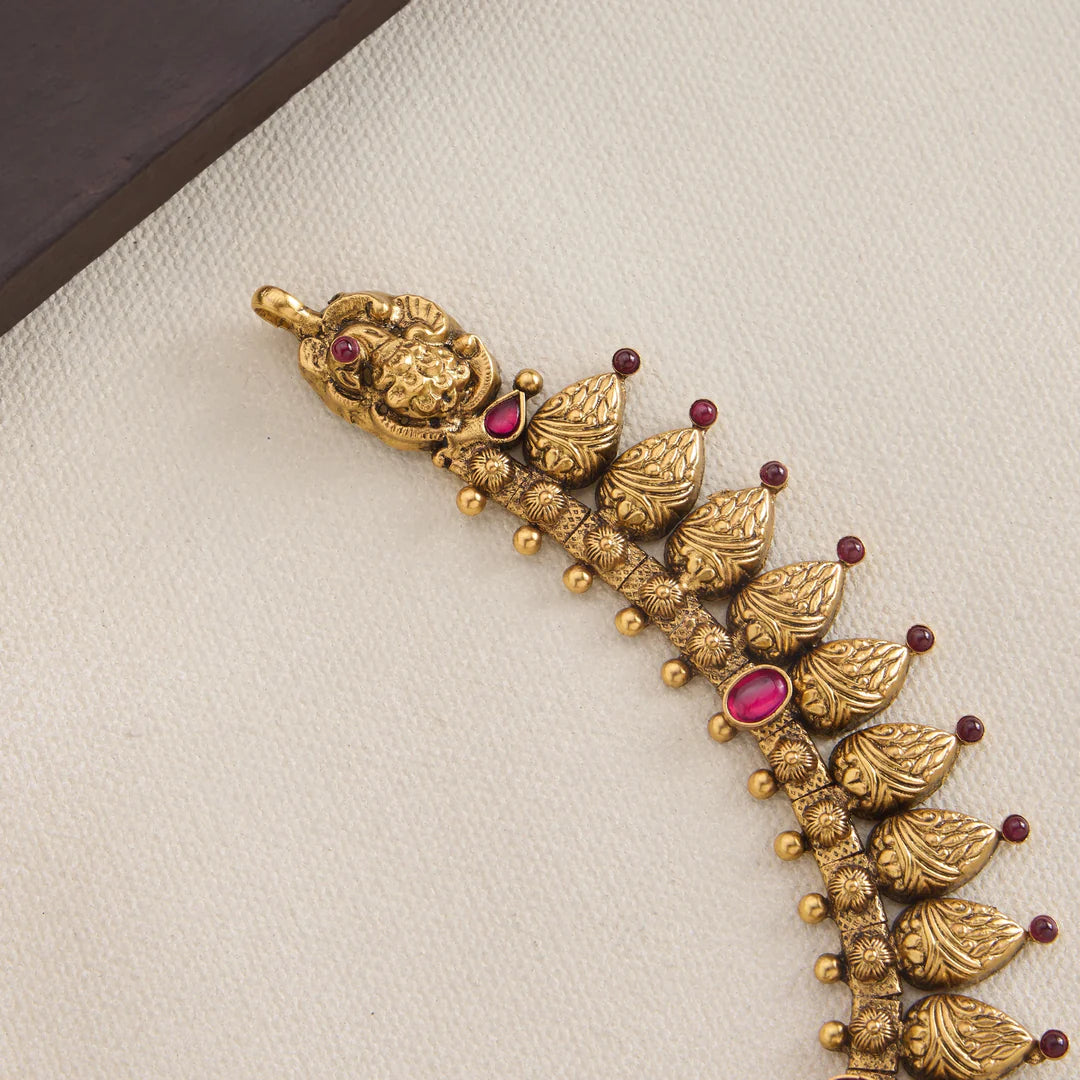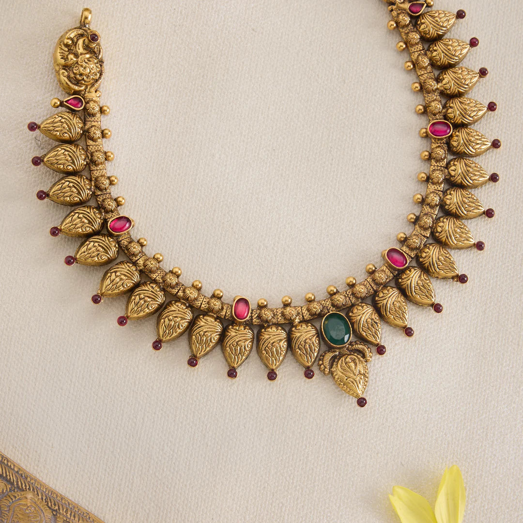 The Nakshithara Necklace features an elegant Pear-shaped design adorned with intricate Peacock motifs, symbolizing beauty and grace. Accentuated with vibrant Emeralds and rubies, this piece showcases expert craftsmanship that brings out rich colour contrasts and timeless charm, making it a distinguished addition to any jewellery collection.