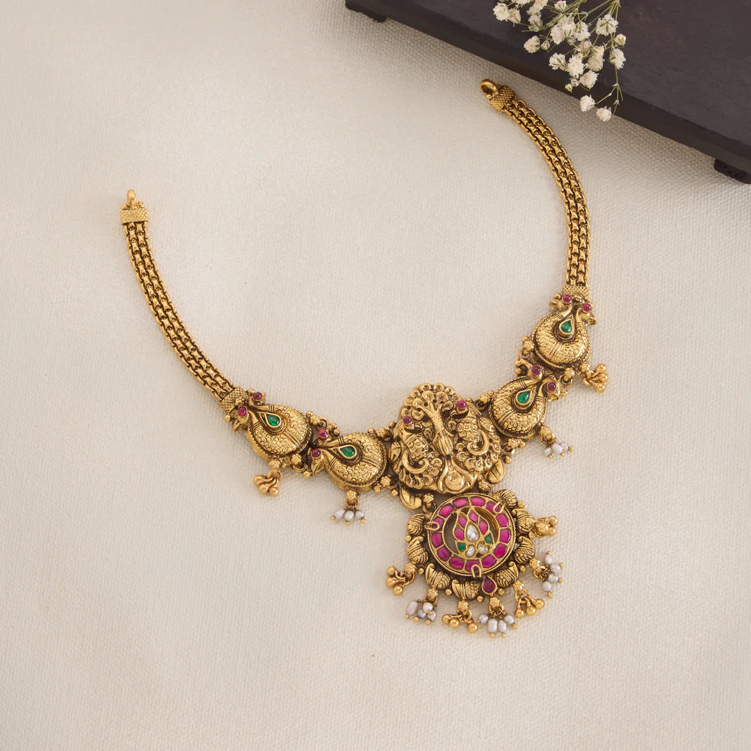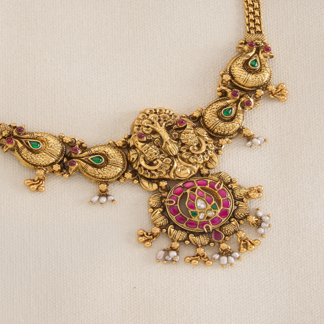 The Nrityamayi Short Necklace features an exquisite Peacock motif intricately detailed with Floral patterns, adorned with sparkling Cubic Zirconia stones. Complemented by vibrant Emeralds, Rubies, and lustrous Pearls, the necklace is further enhanced with delicate Golden bead hangings, creating a sophisticated and timeless design perfect for traditional occasions.