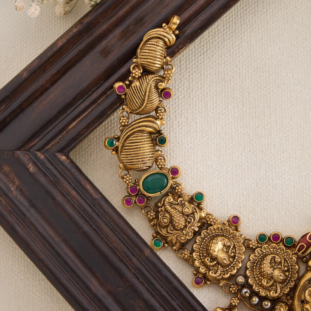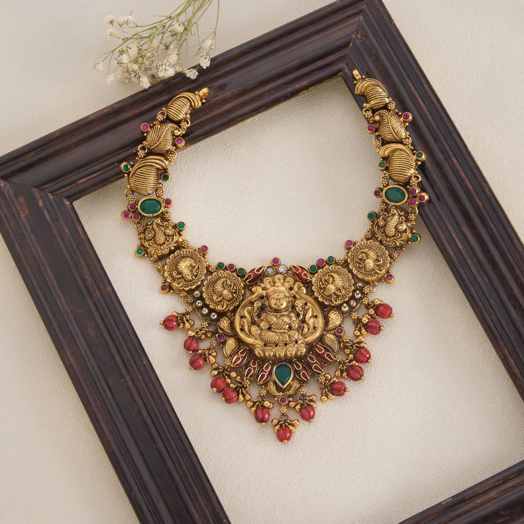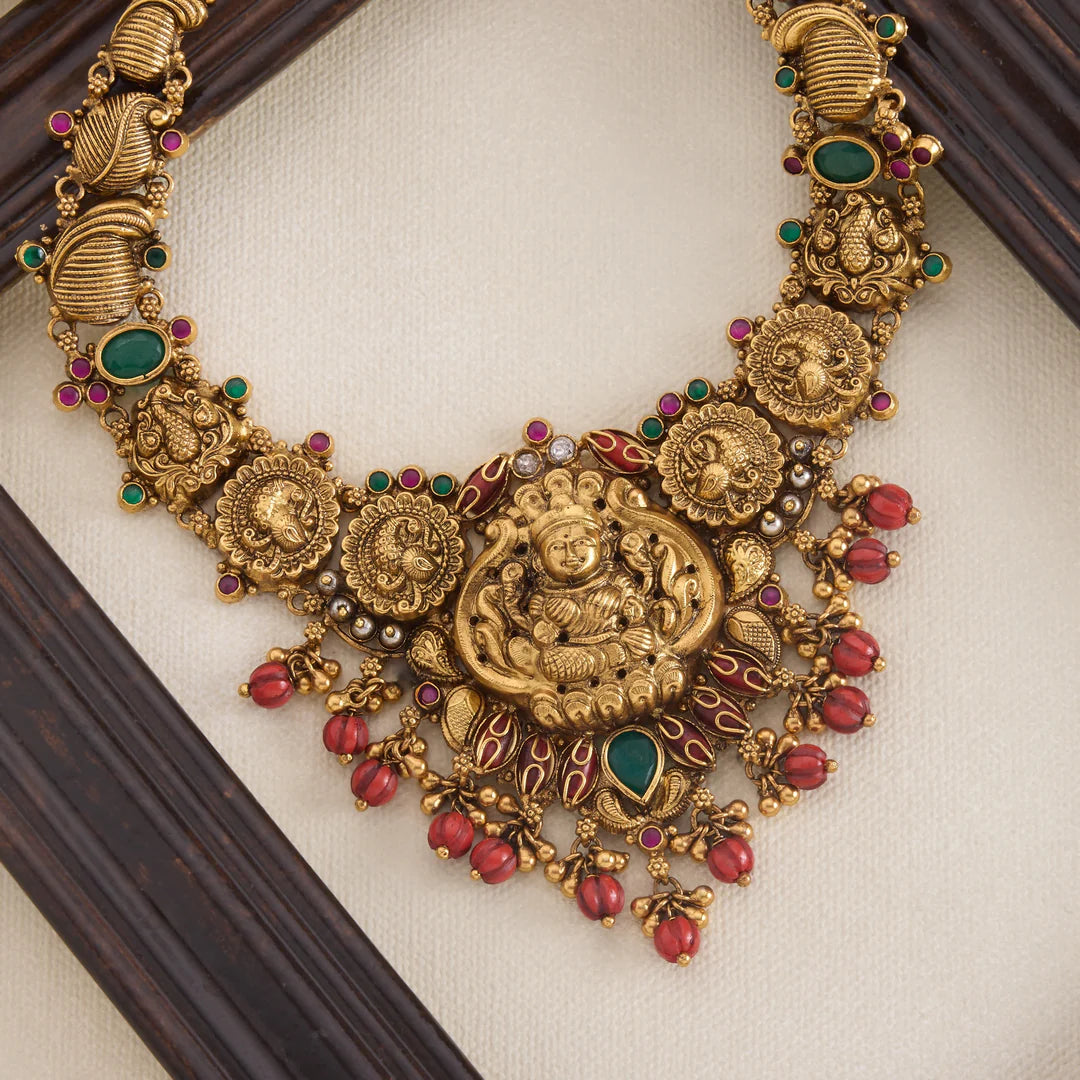 The Shree Alankrita Necklace showcases an exquisite Lakshmi design intricately detailed with Peacock motifs, symbolizing prosperity and grace. Adorned with vibrant Rubies and Emeralds, this piece is further enhanced by delicately carved Coral accents and elegant Golden bead hangings. Meticulously crafted, it combines traditional artistry with rich gemstone embellishments, making it an ideal choice for those seeking a timeless statement of heritage and luxury.