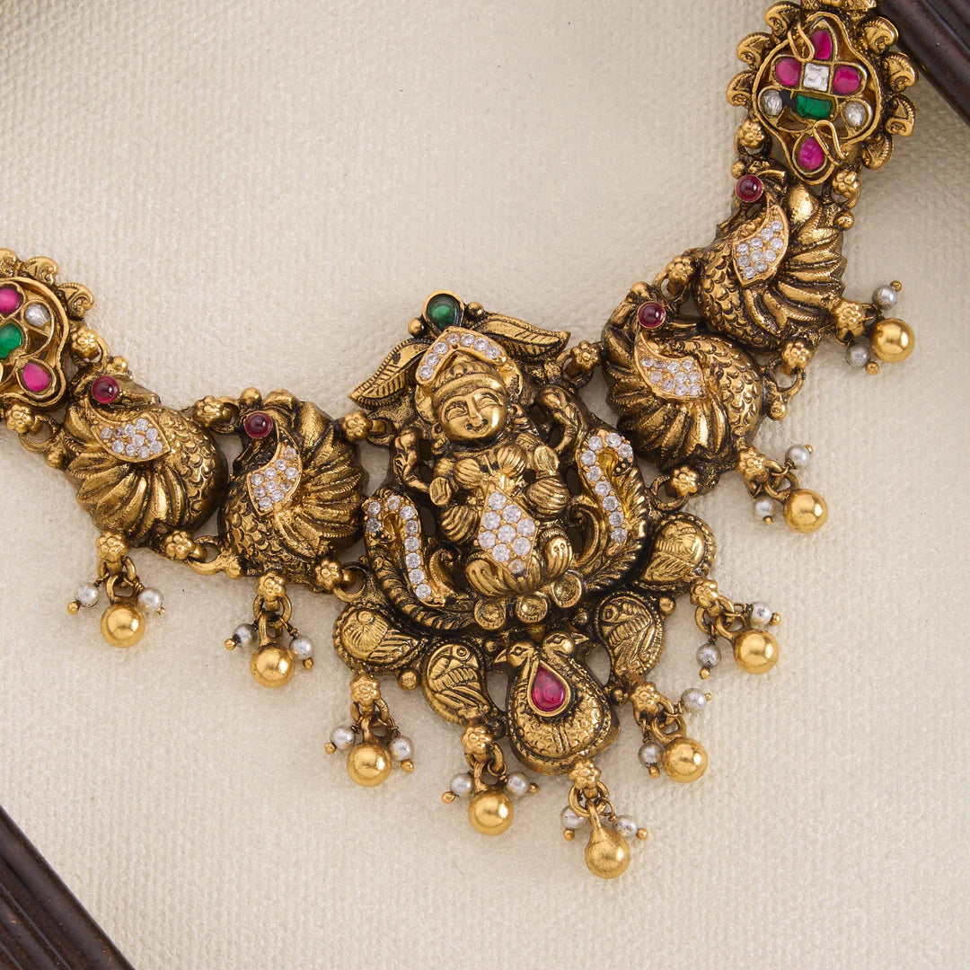 The Shree Keshavi Necklace is meticulously crafted featuring the divine Lakshmi and an elegant Peacock design. Embellished with dazzling Cubic Zirconia stones and rich Rubies, it is further enhanced by delicate Golden bead hangings that add movement and charm. This piece combines traditional motifs with expert detailing, making it a distinguished choice for elevating ceremonial or festive attire.
