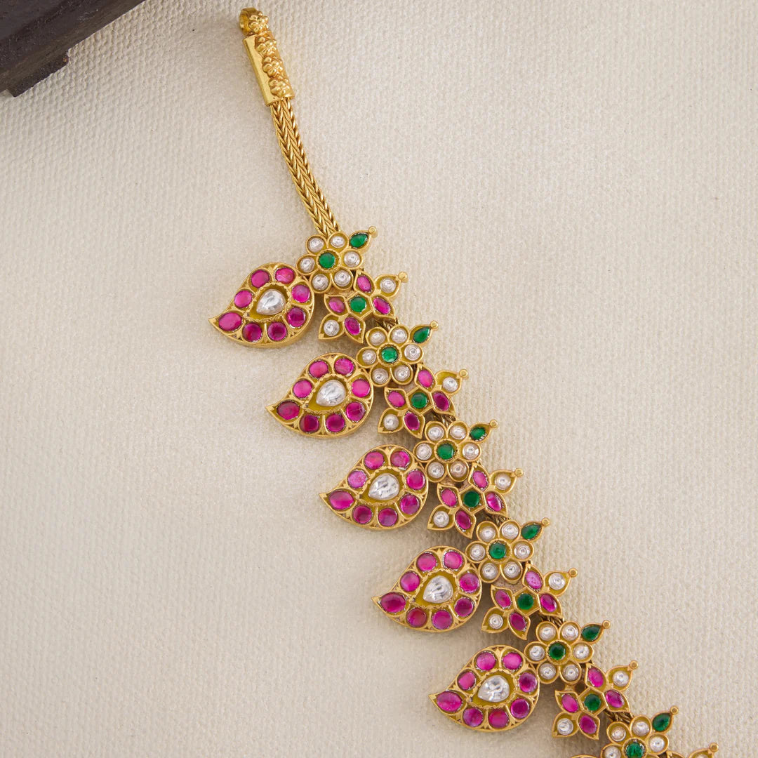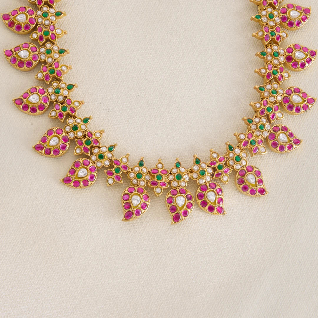 Tanya Mango Haaram is expertly crafted, featuring intricate Mango and Floral motifs enhanced with exquisite Kundan work. This traditional design combines elegance and cultural heritage, making it a perfect statement piece for special occasions. Its detailed craftsmanship highlights the beauty of classic Indian jewellery, offering both timeless appeal and refined artistry.