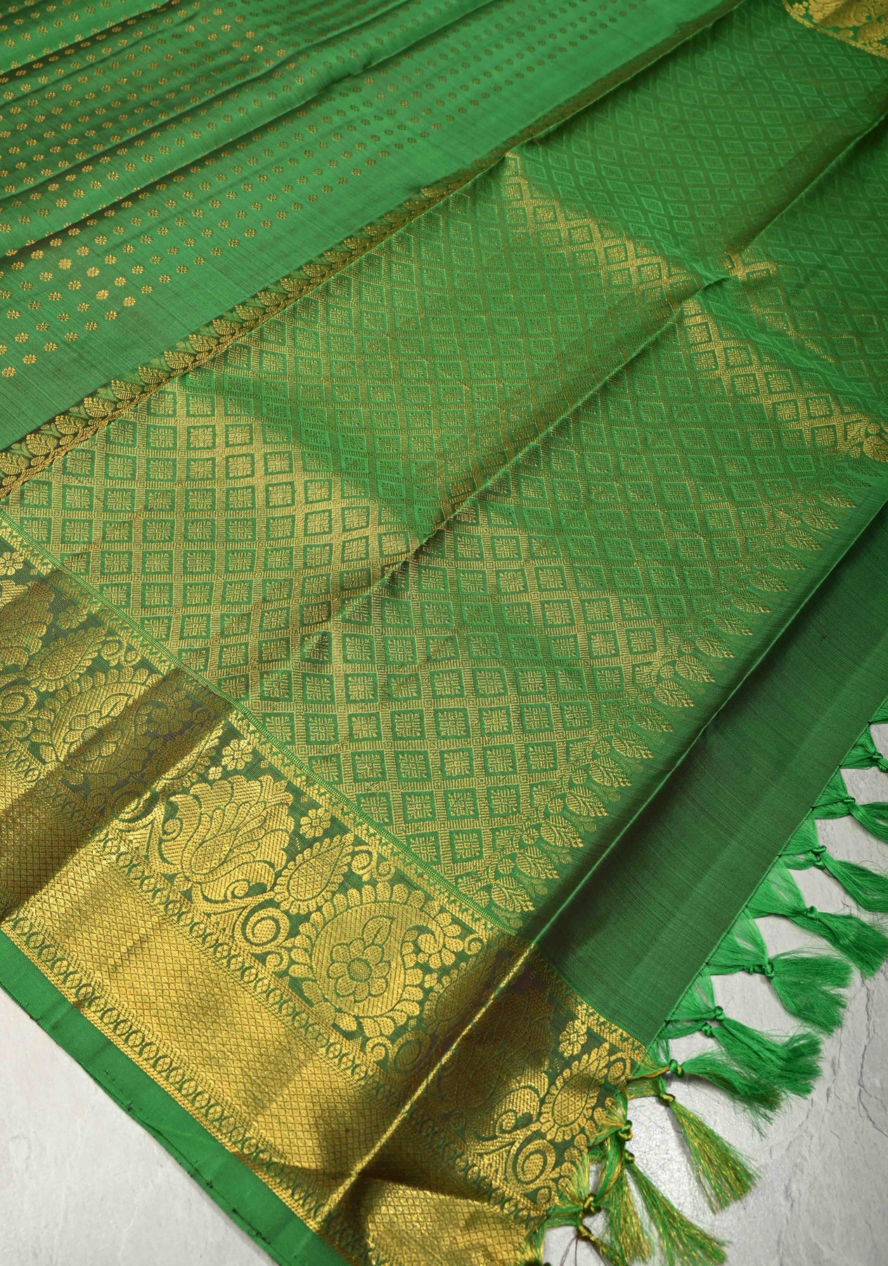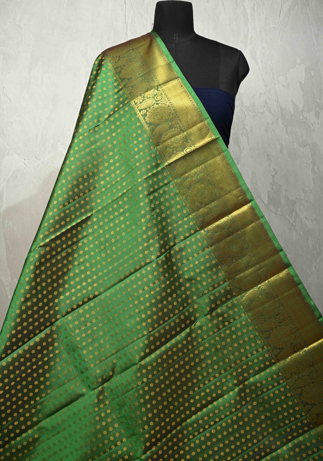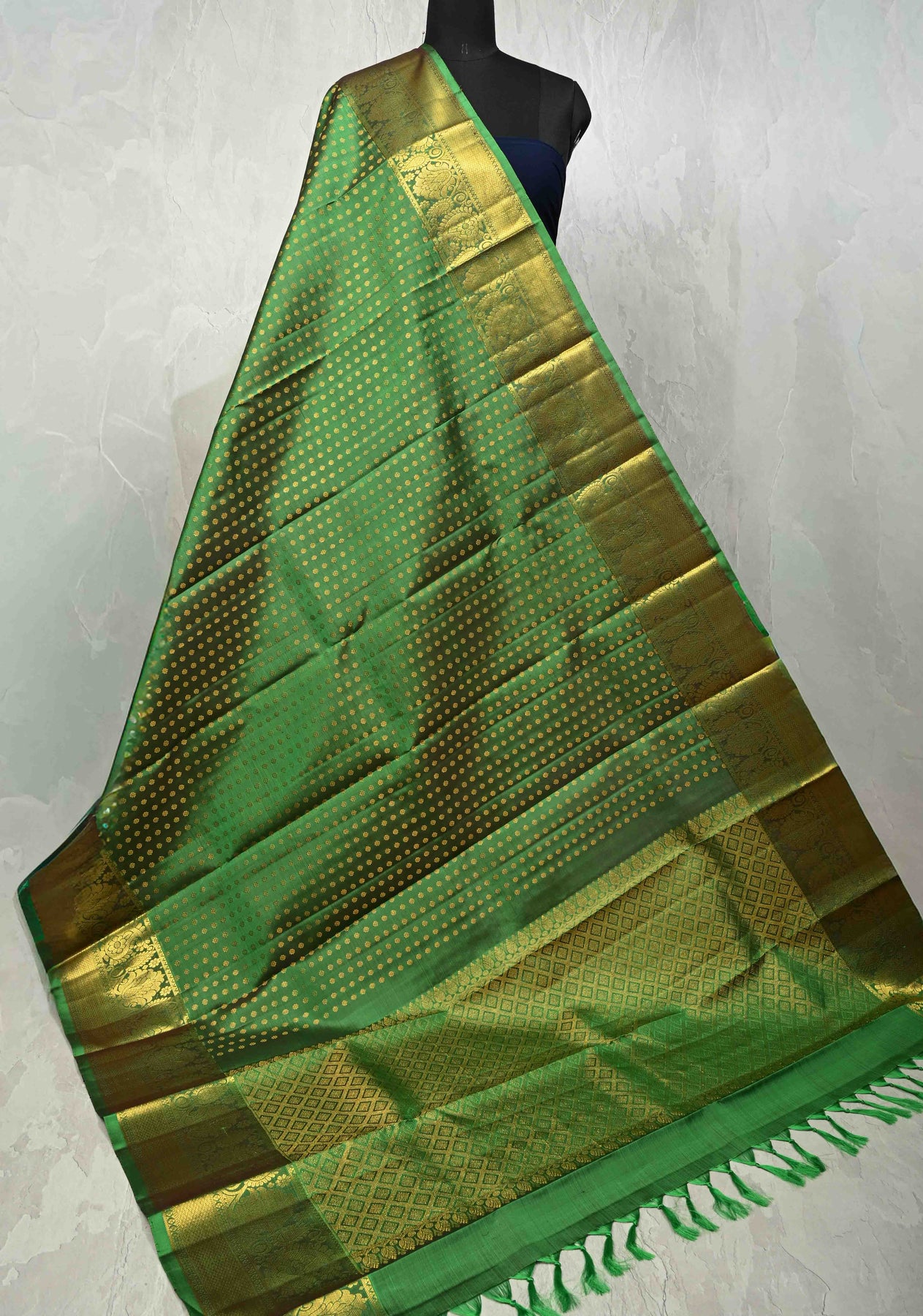 This pure Kanjivaram dupatta in a refreshing green hue showcases exquisite traditional artistry with its finely woven chunri buttis brocade spread gracefully across the silk base. The design is beautifully complemented by ornate paisley zari borders, adding depth, richness, and a regal finish. Elegant and timeless, this dupatta is perfect for weddings, festive occasions, and elevating classic ethnic ensembles.