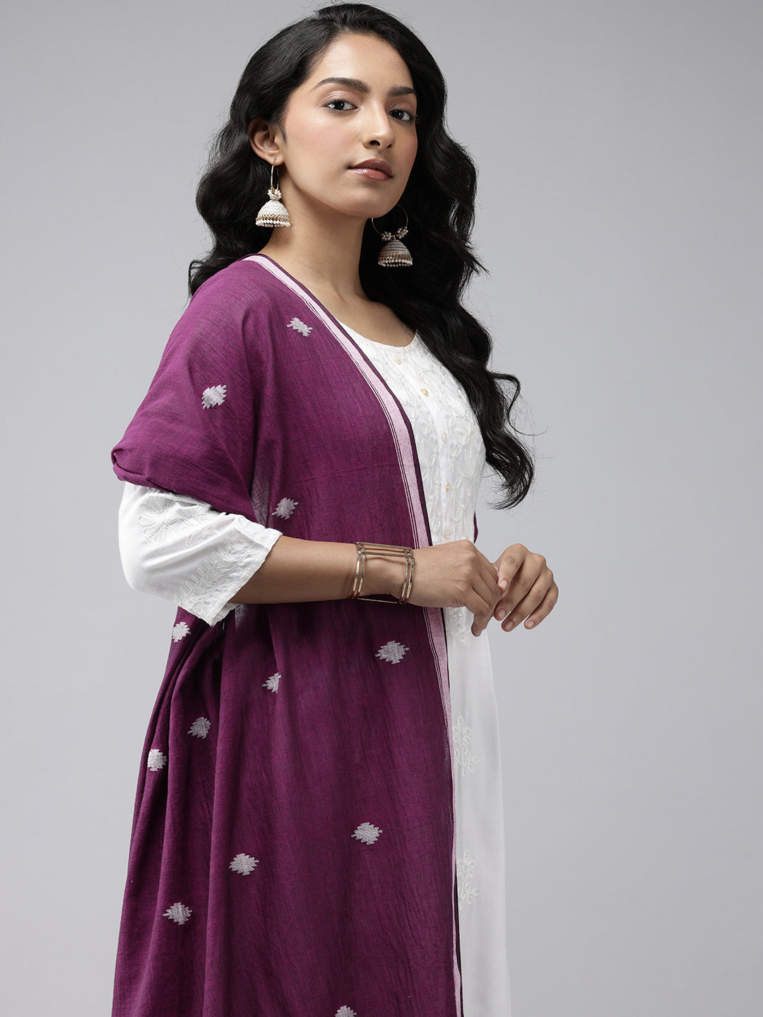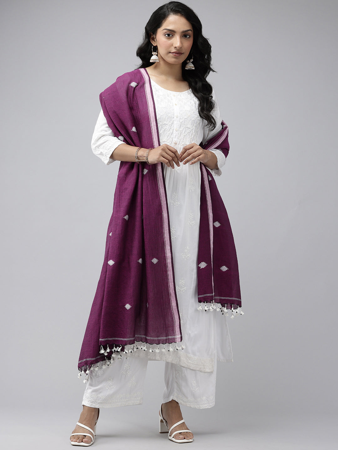 The vibrant purple base is complemented by charming pompom tassels along the edges, adding a fun, contemporary twist to a traditional piece. Lightweight and versatile, it drapes gracefully over kurtas, sarees, or fusion ensembles, making it ideal for festive occasions, casual gatherings, or everyday elegance.