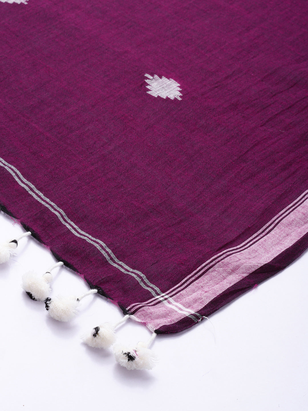 Elevate your ethnic wardrobe with this Purple Cotton Handloom Jamdani Dupatta with Pompoms, a perfect blend of artisanal craftsmanship and playful detailing. Handwoven from soft, breathable cotton, the dupatta showcases the intricate Jamdani weaving technique, renowned for its lightweight texture and delicate geometric motifs.