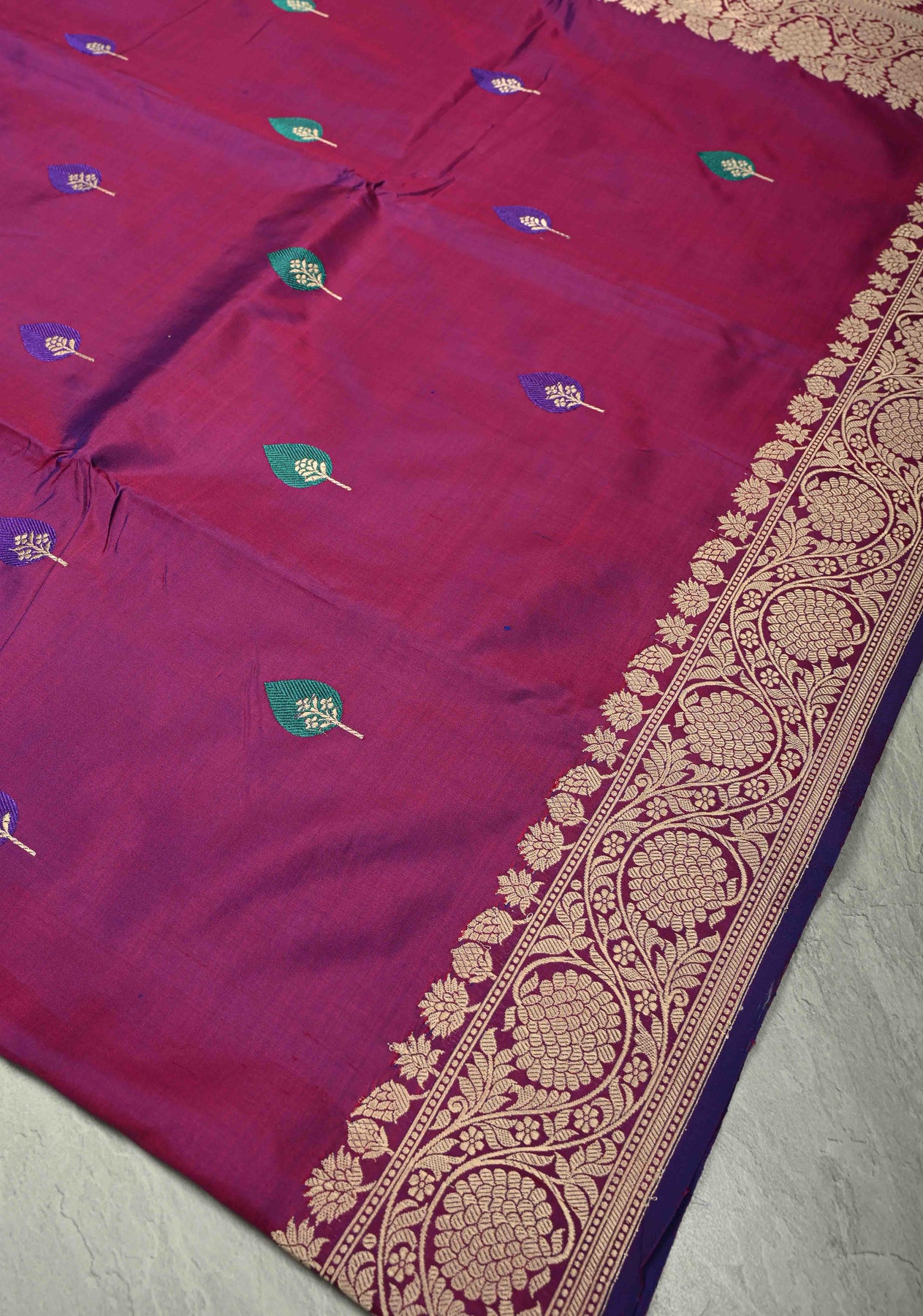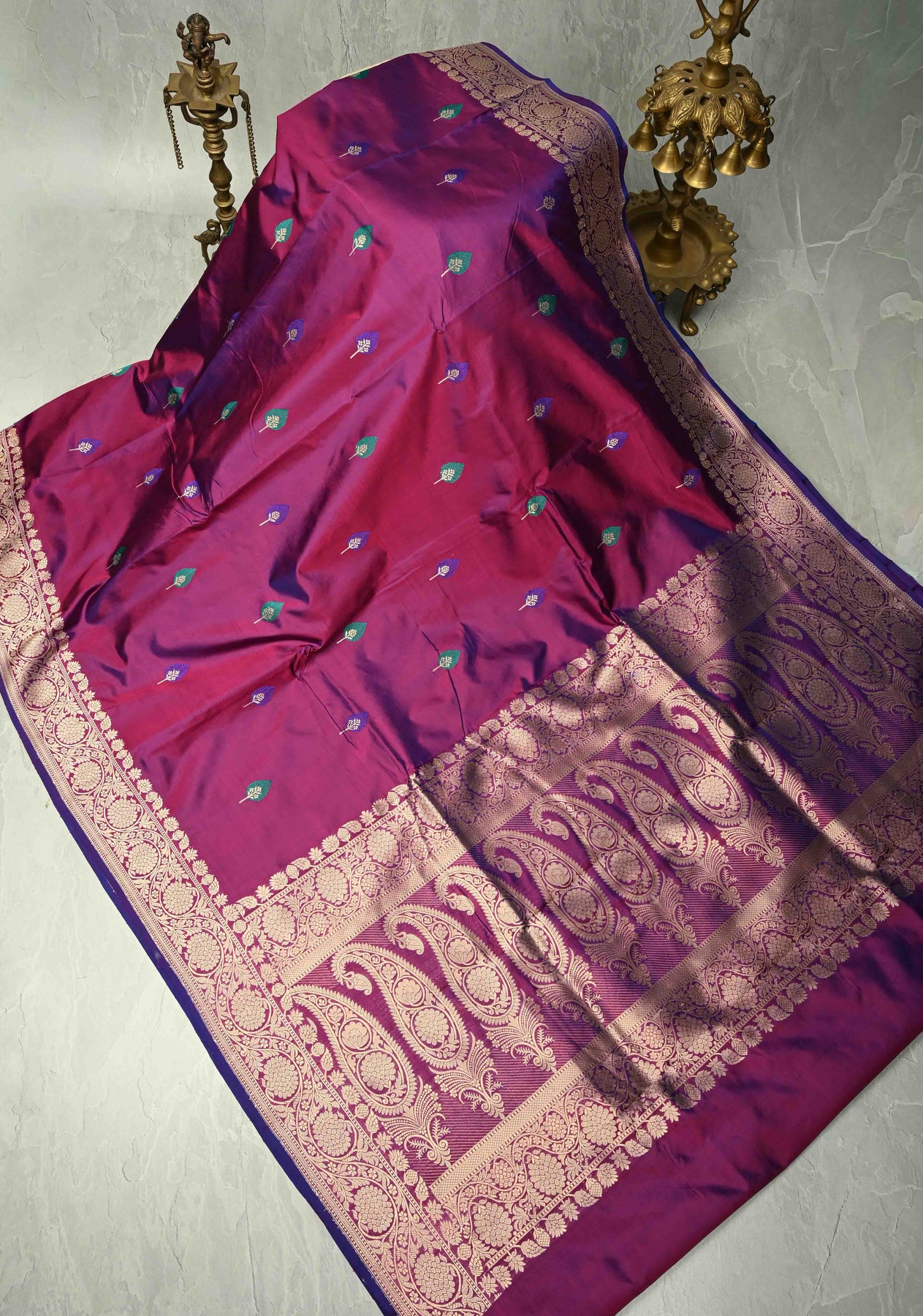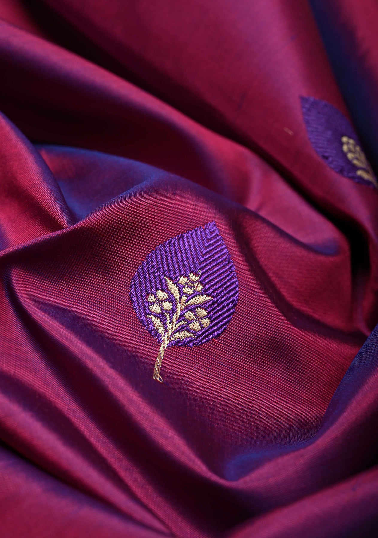 This Purple Dual Tone Banarasi Katan Silk Saree captures the essence of Banaras’ rich weaving heritage. Crafted from katan silk, it features a mesmerizing dual-tone finish that shimmers beautifully with every movement. The saree is intricately adorned with Resham Meenakari buttas, showcasing vibrant threadwork and fine zari detailing that add depth and artistry. A graceful zari border frames the saree, enhancing its traditional charm and opulent appeal. Perfect for weddings, festive occasions, and cultural celebrations, this saree is a timeless masterpiece of elegance and craftsmanship.