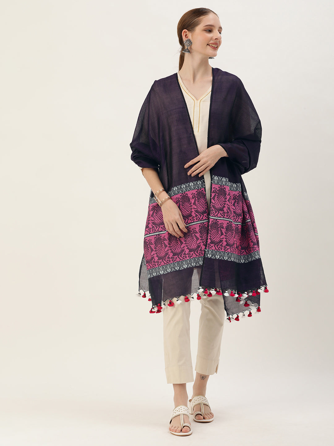 A Handloom Purple Baluchari Silk Dupatta is a masterpiece of traditional craftsmanship, renowned for its rich texture, intricate designs, and luxurious feel. Woven with care on handlooms, this dupatta is made from premium Baluchari silk, a fabric that is famous for its smooth texture and glossy finish. The dupatta features stunning motifs, often inspired by mythology, nature, or royal symbolism, carefully woven into the fabric using intricate brocade weaving techniques. These patterns, rich in detail and vibrant in color, create a visual appeal that is both timeless and regal. The luxurious silk drapes beautifully, offering a rich, elegant look, whether paired with a saree, lehenga, or ethnic suit. Perfect for weddings, festivals, or special occasions, a Handloom Baluchari Silk Dupatta is not just an accessory but a statement of heritage and opulence.