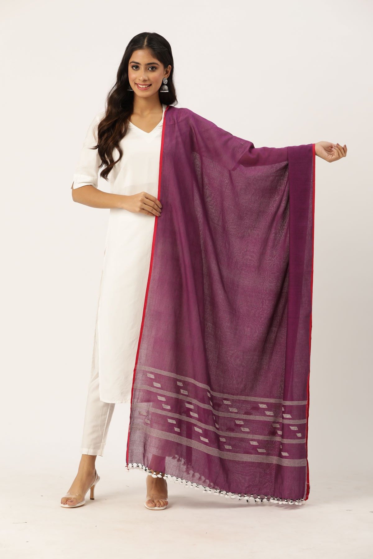 ThePurple  Handwoven Jamdani Mul Cotton Dupatta with Tassels is a beautiful blend of traditional weaving artistry and contemporary elegance. Crafted from soft, breathable mul cotton, this dupatta is lightweight and comfortable, making it ideal for all-day wear. The Jamdani weaving technique, renowned for its intricate patterns and skilled craftsmanship, is used to create delicate geometric, floral, or abstract designs that are both visually striking and rich in cultural heritage. The addition of tassels at the edges adds a playful and stylish touch, enhancing the dupatta's overall charm. Perfect for draping over a salwar kameez, kurta, or even a western fusion outfit, this dupatta brings a refined, yet casual elegance to any look. Its timeless appeal, combined with the softness of mul cotton, makes it an ideal accessory for both casual outings and more formal occasions.