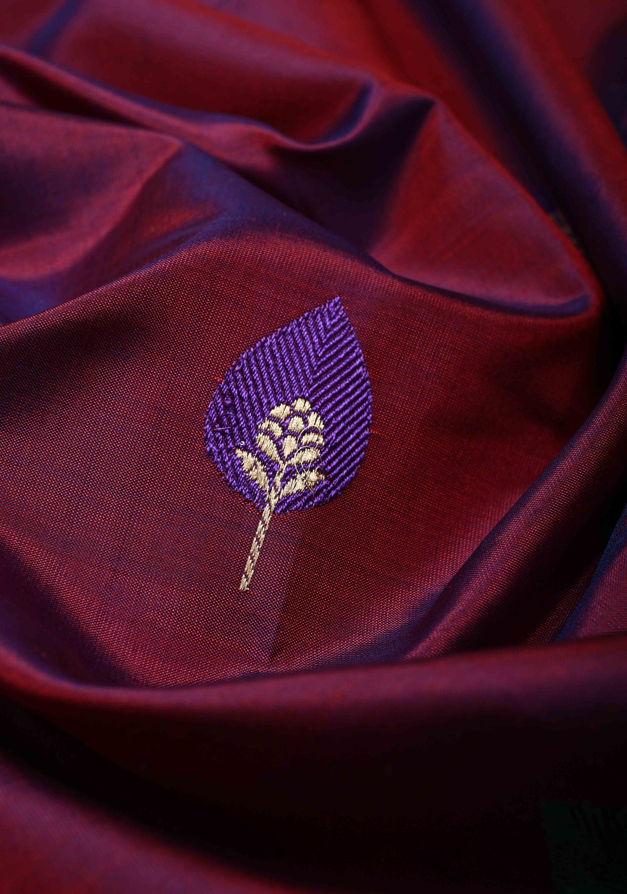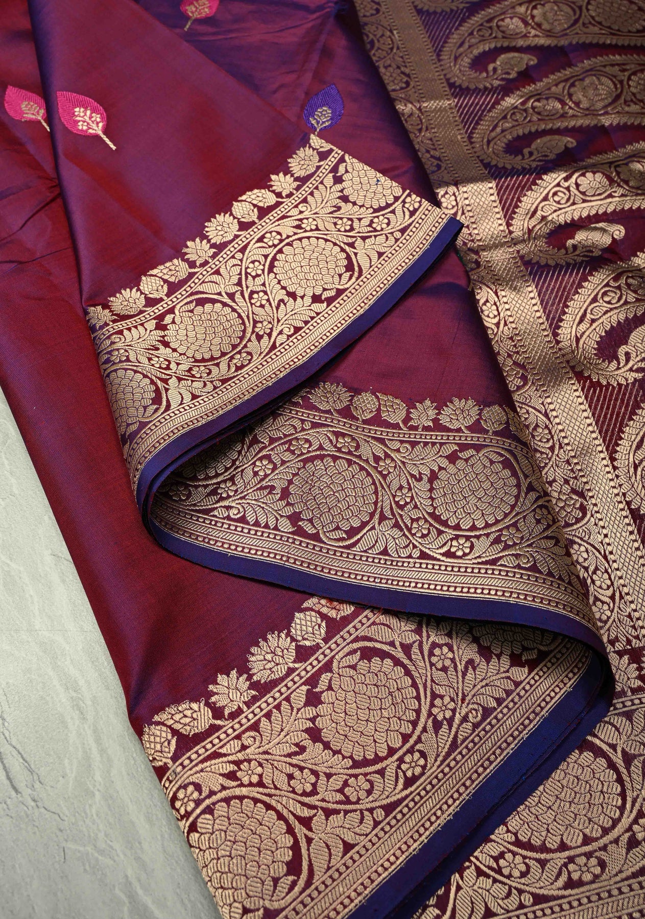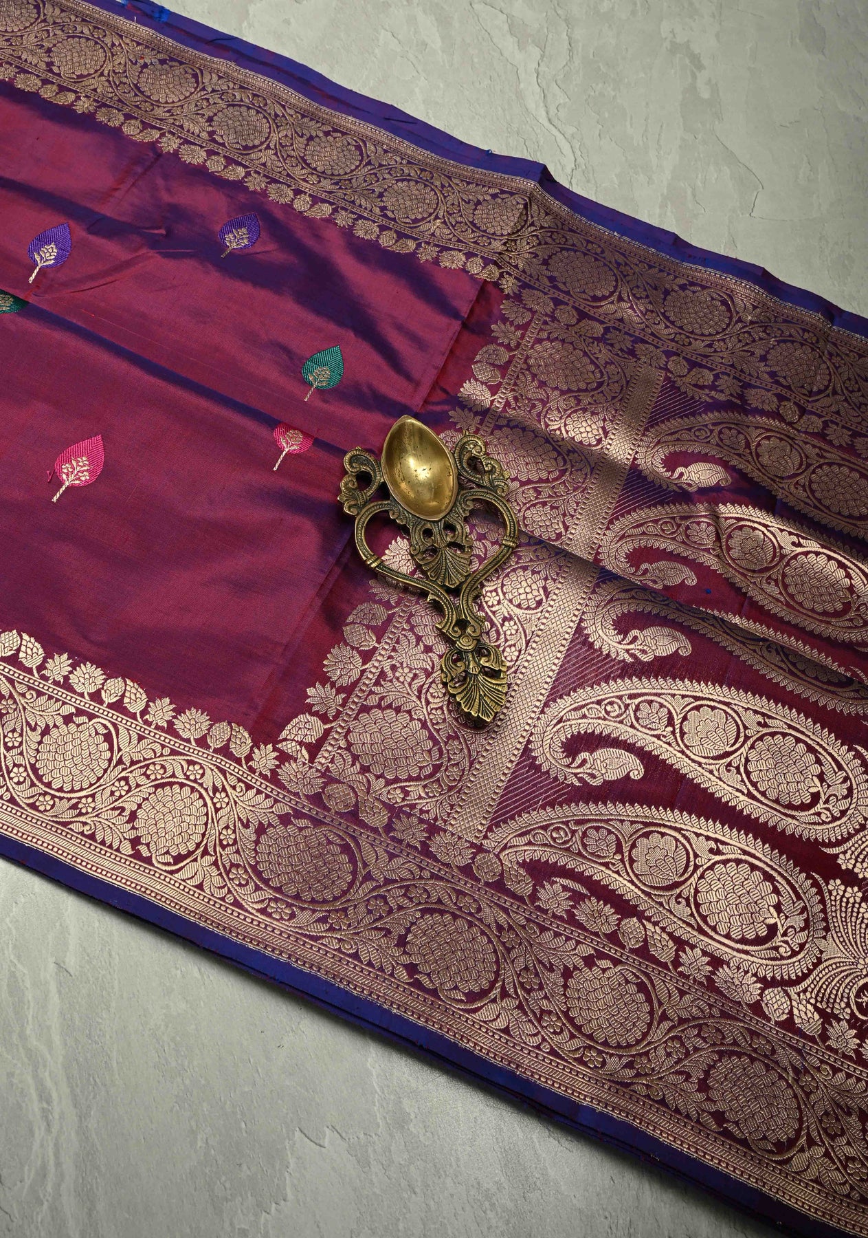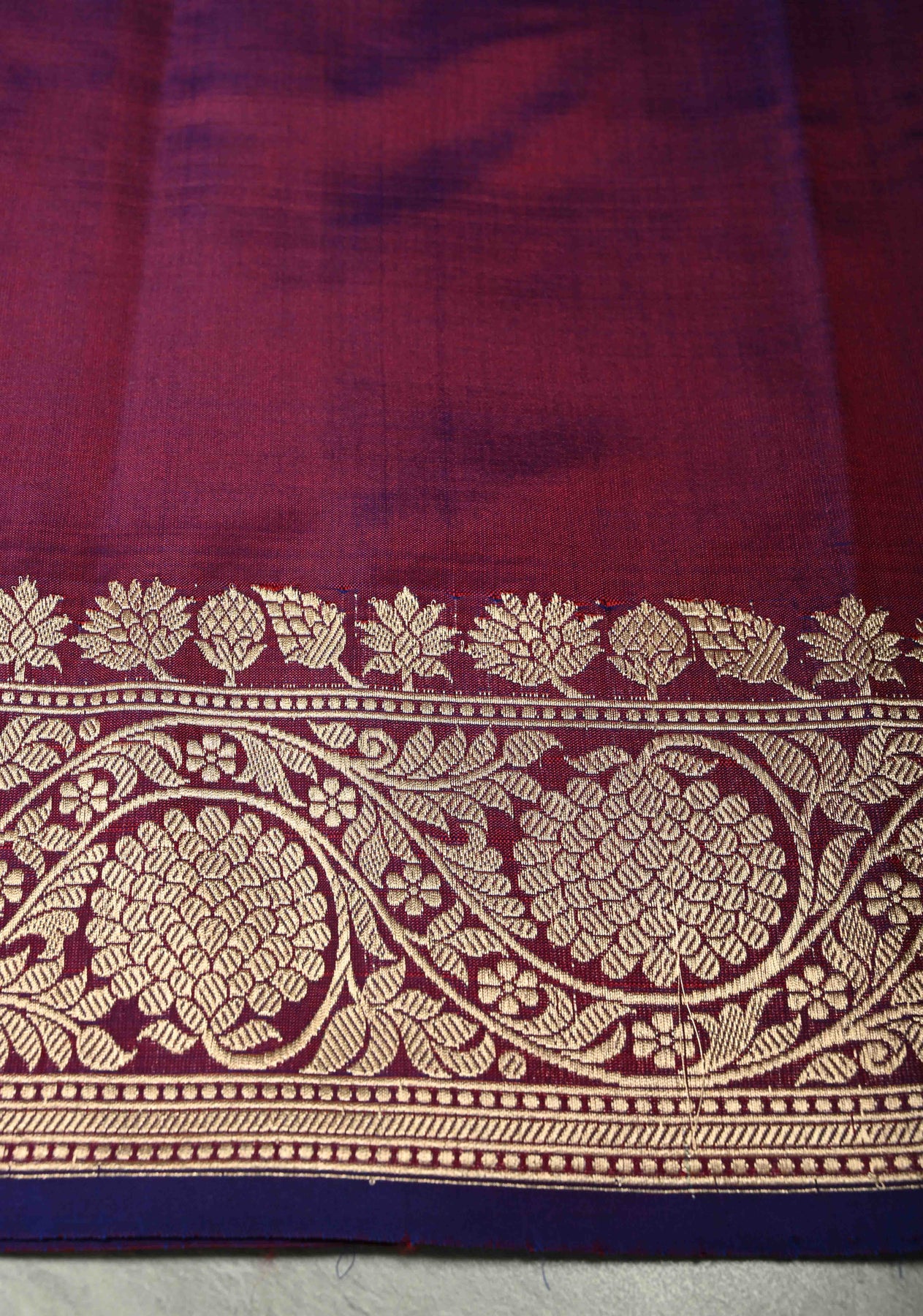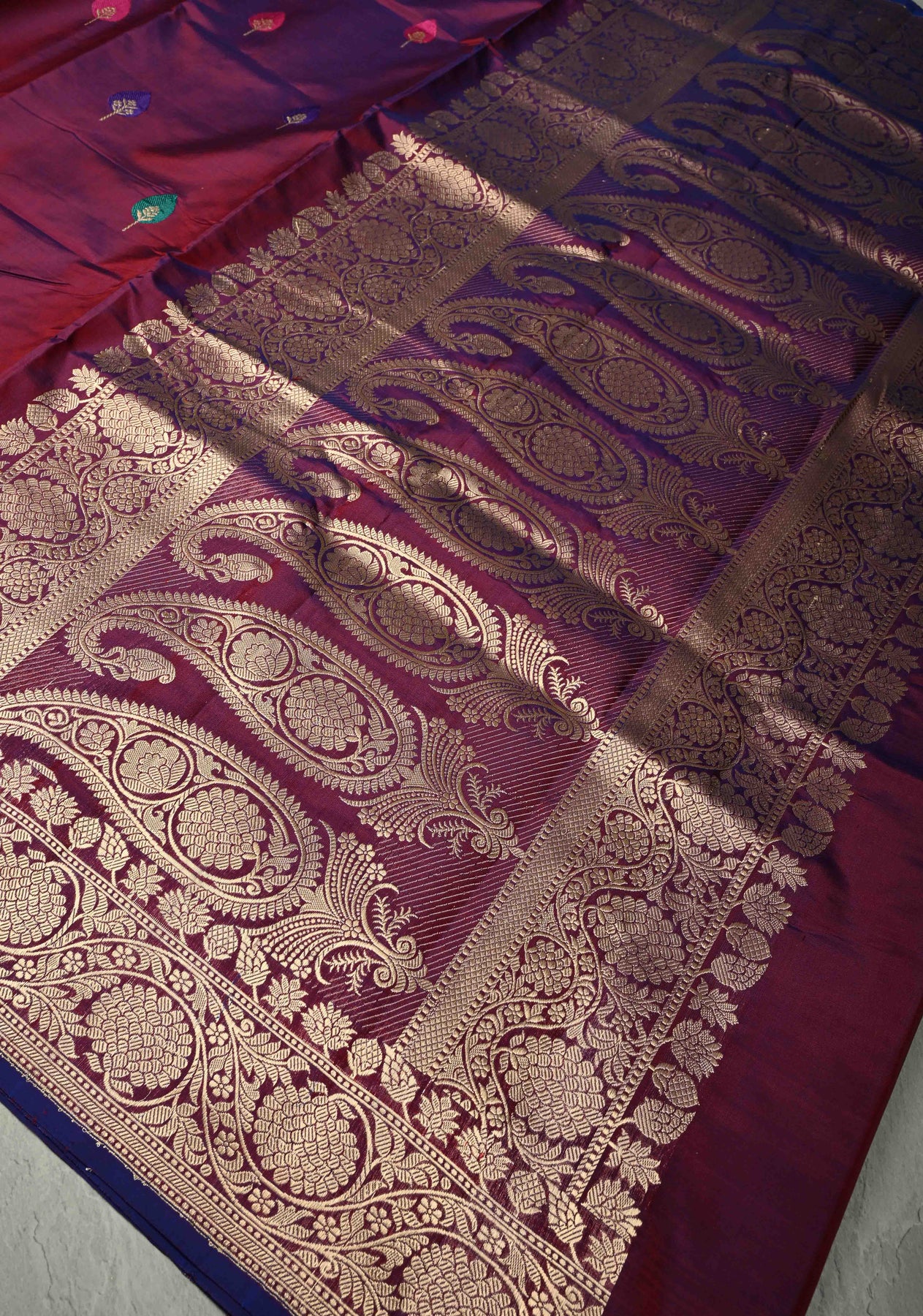 Graceful and opulent, this Purple–Maroon Dual Tone Banarasi Katan Silk Saree is a masterpiece of traditional artistry and luxurious craftsmanship. Handwoven from fine pure Katan silk, it features exquisite Resham Meenakari buttas intricately woven across the lustrous dual-tone body, creating a mesmerizing interplay of color and texture.