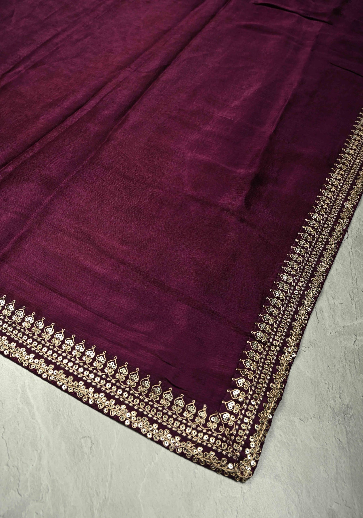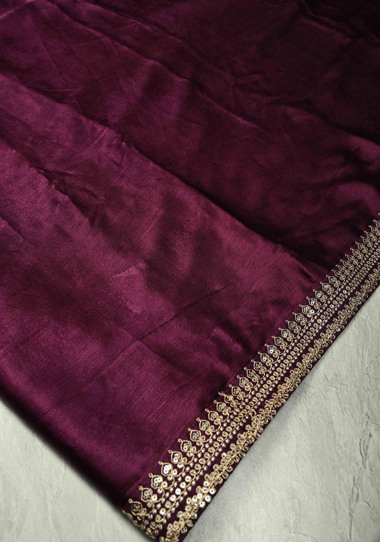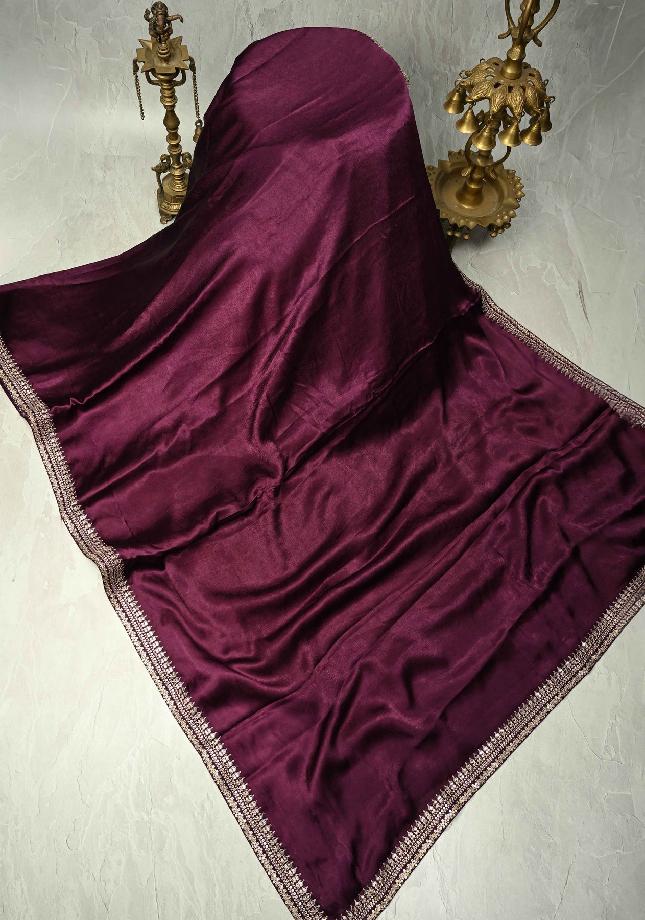 The saree is beautifully enhanced with a fancy lace border, adding a delicate, intricate touch that accentuates the rich purple hue. This elegant detailing combines modern design with timeless charm, creating a sophisticated ensemble.