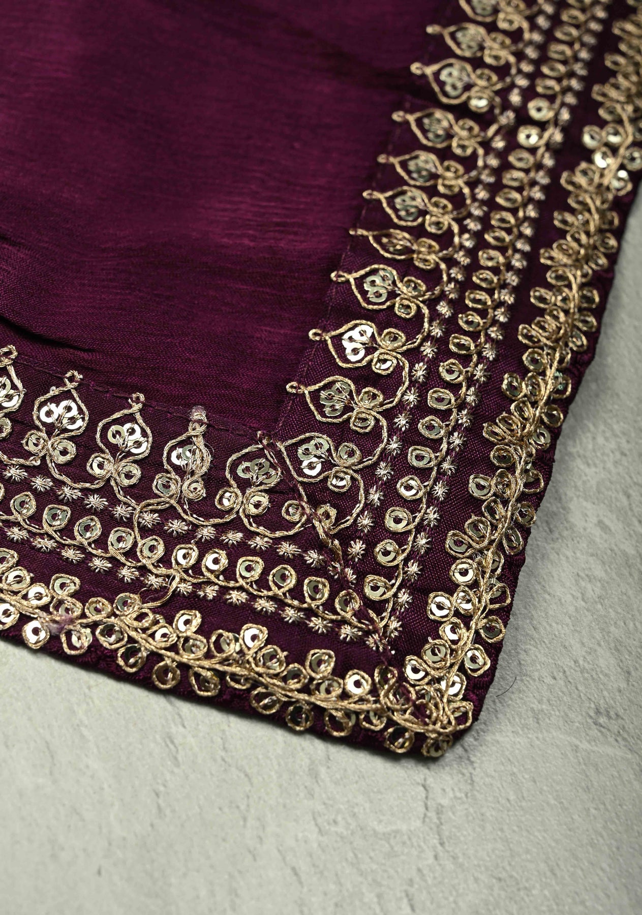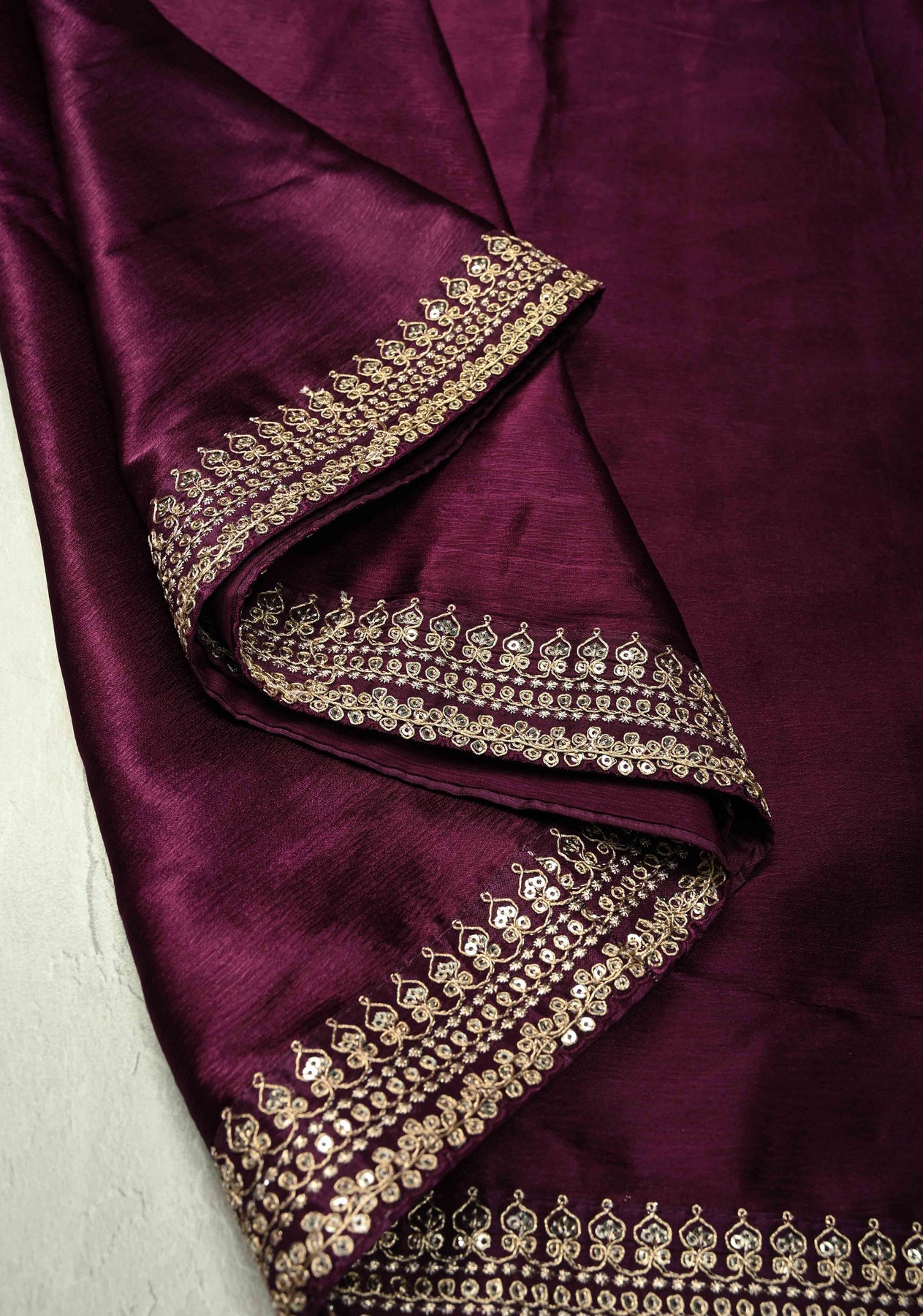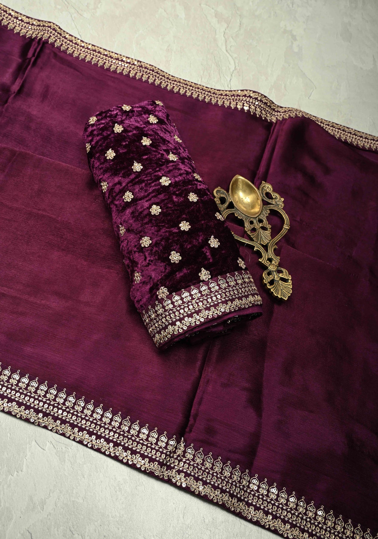 The saree is beautifully enhanced with a fancy lace border, adding a delicate, intricate touch that accentuates the rich purple hue. This elegant detailing combines modern design with timeless charm, creating a sophisticated ensemble.