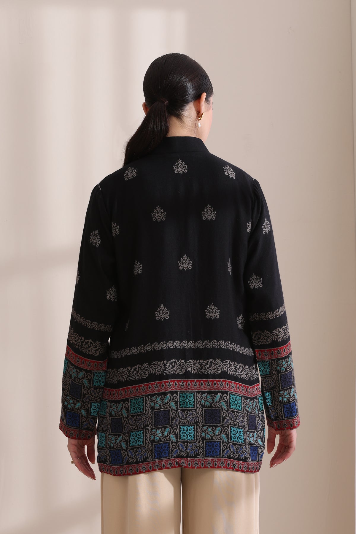 The Quinn woven short jacket features intricate traditional patterns on a modern silhouette. Crafted from soft, lightweight fabric, it showcases vibrant blue and teal geometric designs with fine embroidery on a black base. Perfect for elevating any outfit, this jacket blends timeless craft with contemporary elegance for versatile, statement style.